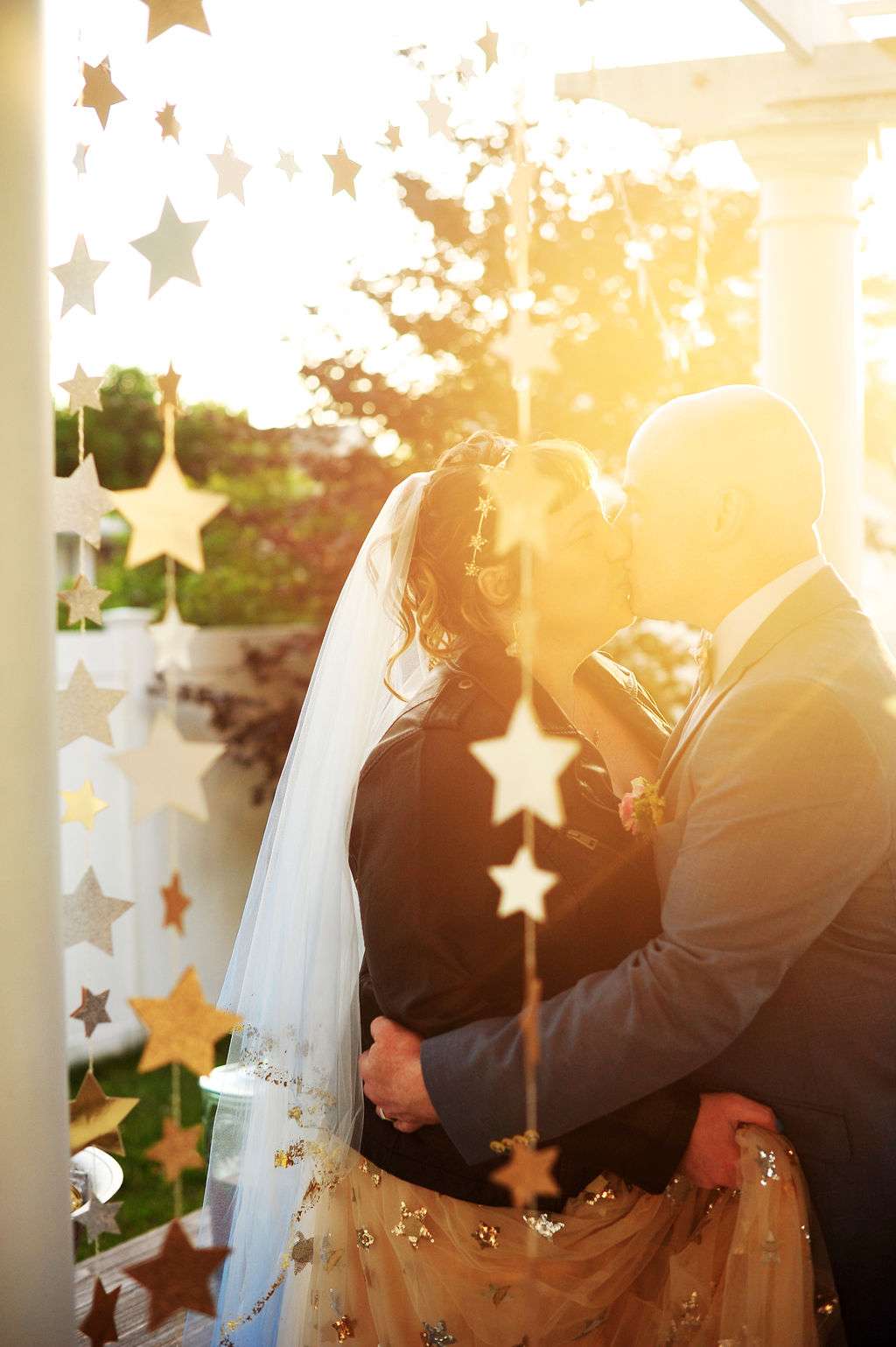 Emma wore the Orion dress from Willowby by Watters with a gold tipped veil custom made by W Collective. Her jewellery was vintage and her ‘To the Moon’ jacket was painted by Bespoke Chalk and Print who she found on Etsy.