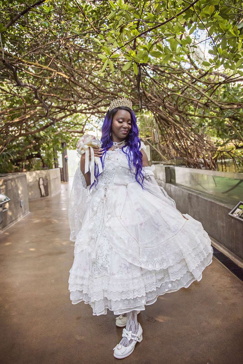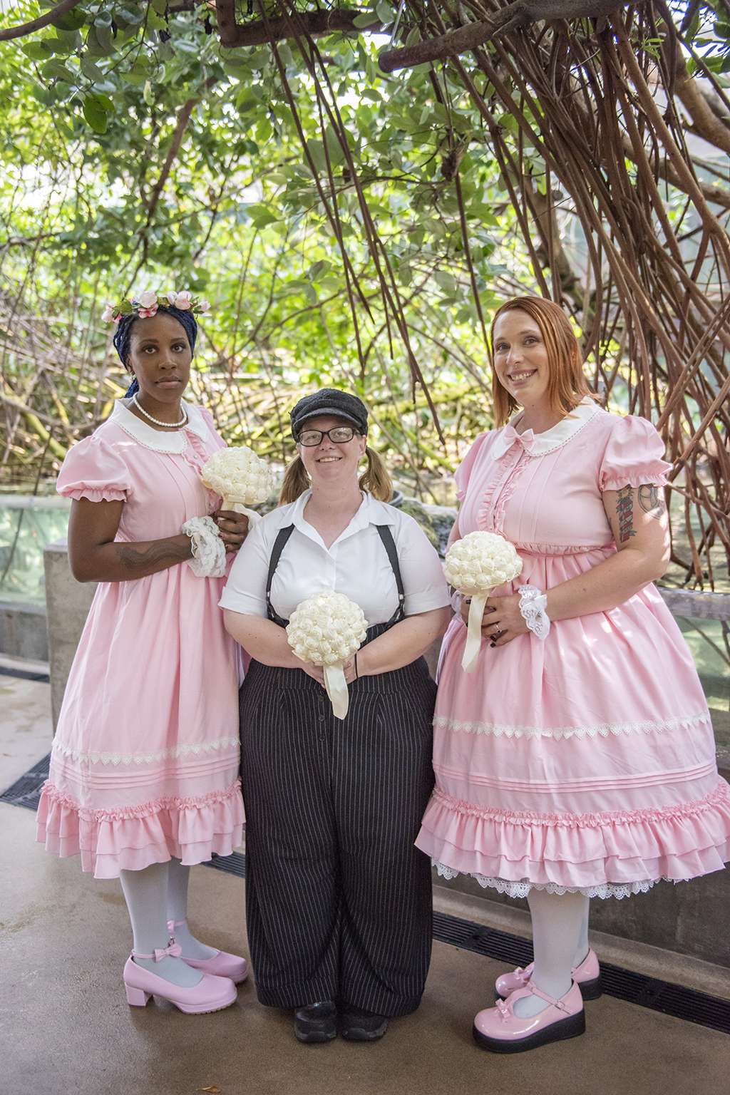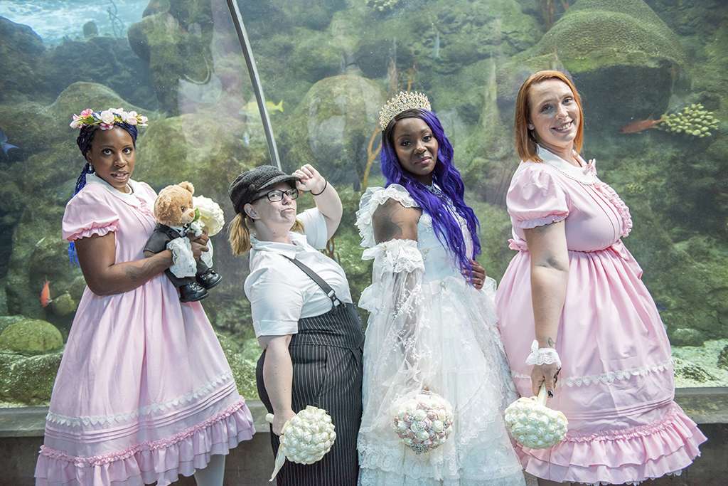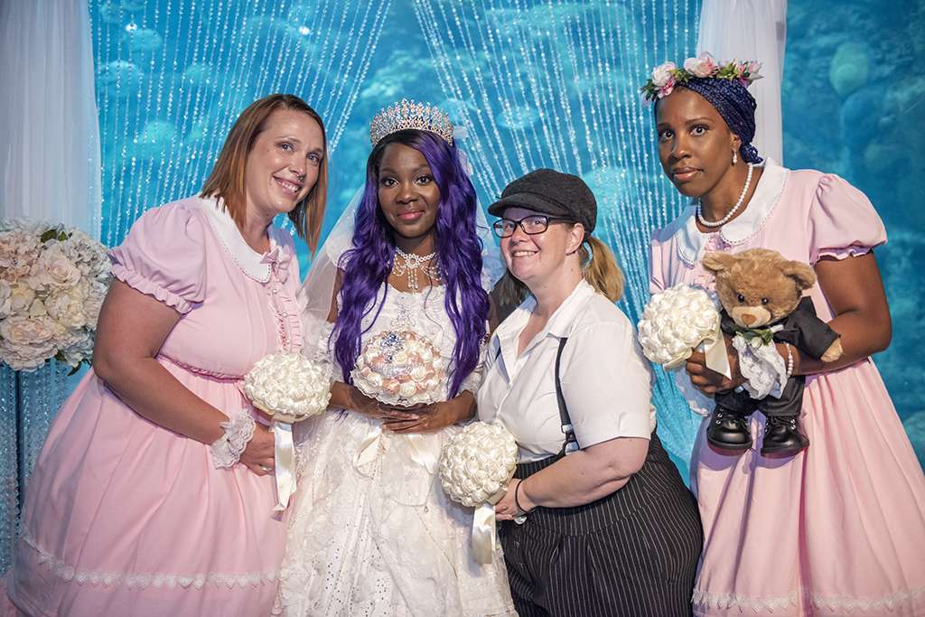 Kadie discovered ‘hanayome hime lolita’, a Japanese street fashion genre, two years ago and it has been a hobby of hers to wear it ever since. She chose an outfit from My Lolita Dress for the occasion and her bridesmaids were in dresses from Devil Inspired, and one of them carried a teddy bear as a memorial for her younger brother who had recently passed. “We were close,” Kadie explained, “and ‘Bear’ was the nickname given to him.”