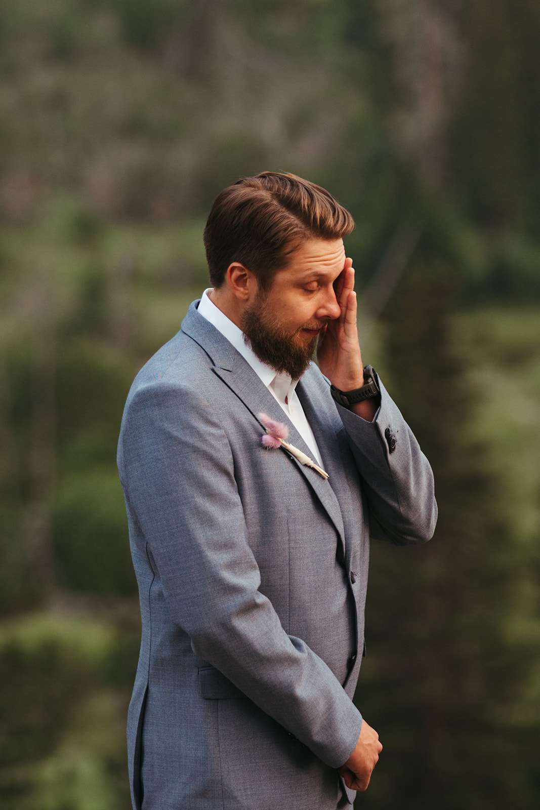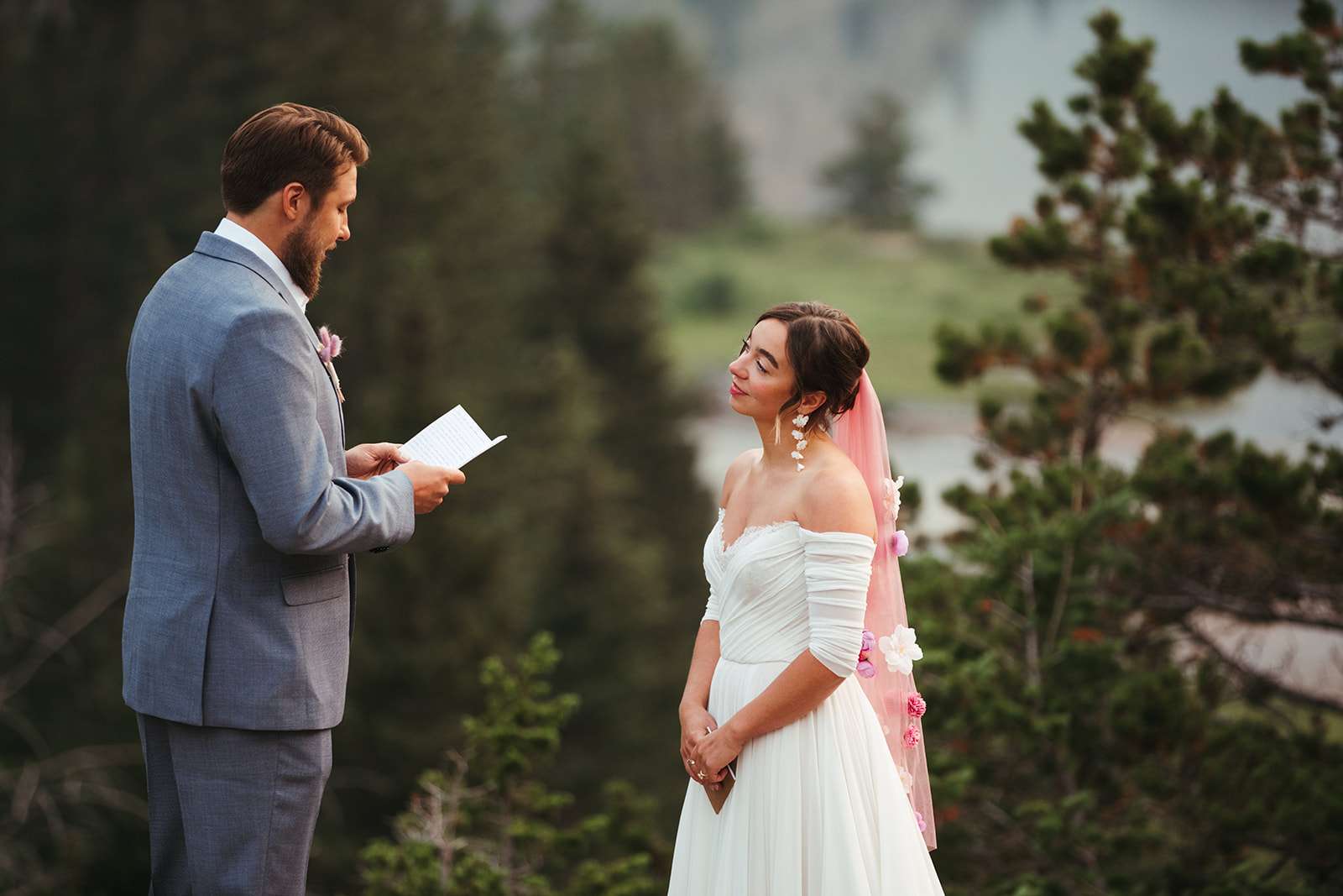 The ceremony was obviously one of the most poignant moments of the day for them both. The bride continues, “It was so surreal. There we were, on a trail we’ve hiked for years, in super fancy clothes, getting married. The fireweed was full on and some were almost as tall as me. We didn’t see a soul the entire morning until at the end on the hike back, so it was really intimate. As we were approaching our ceremony spot, a few whitetail deer were grazing around the lake alongside us. Around the water you couldn’t smell the wildfire smoke so we stayed nearby.”