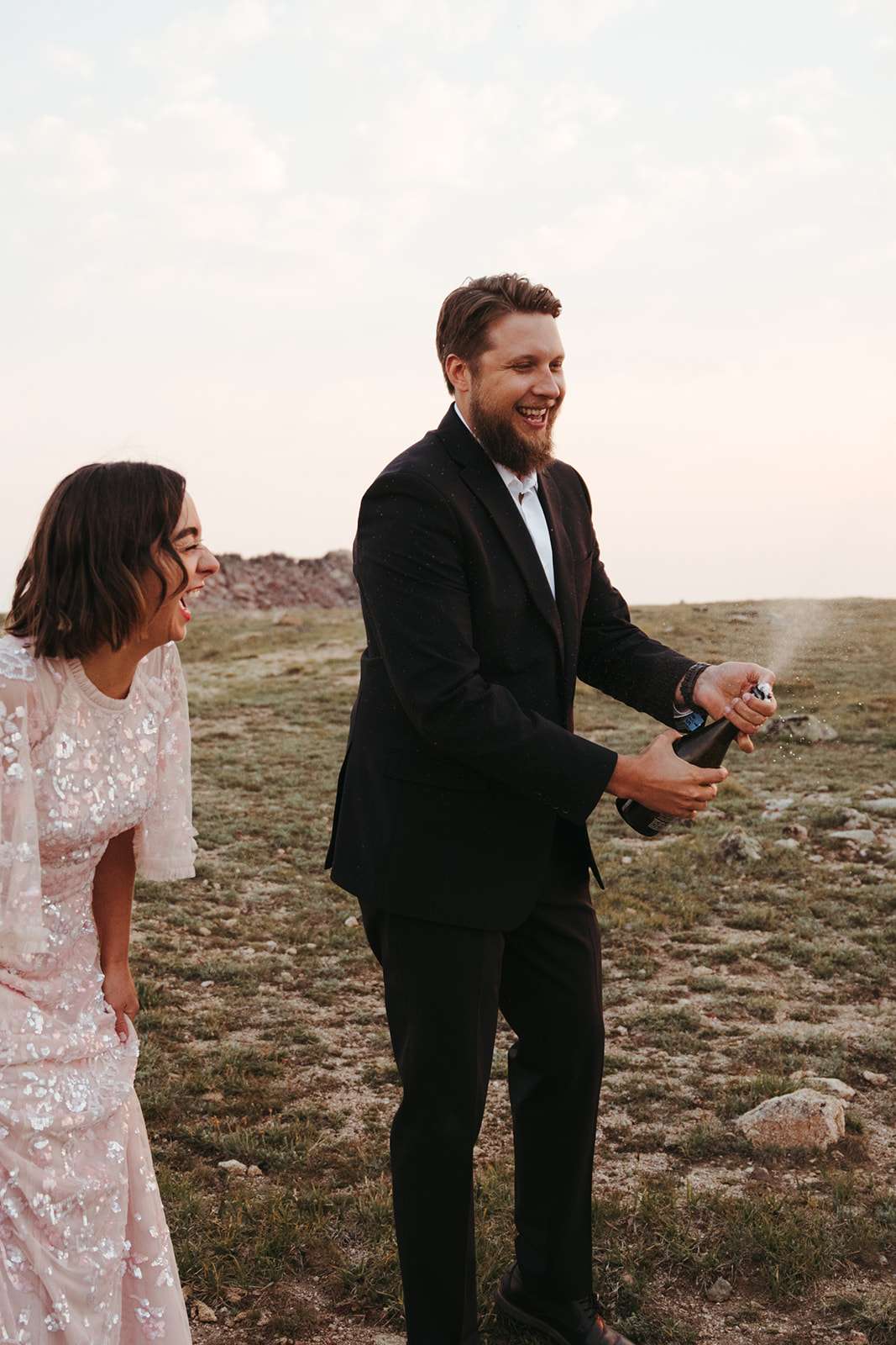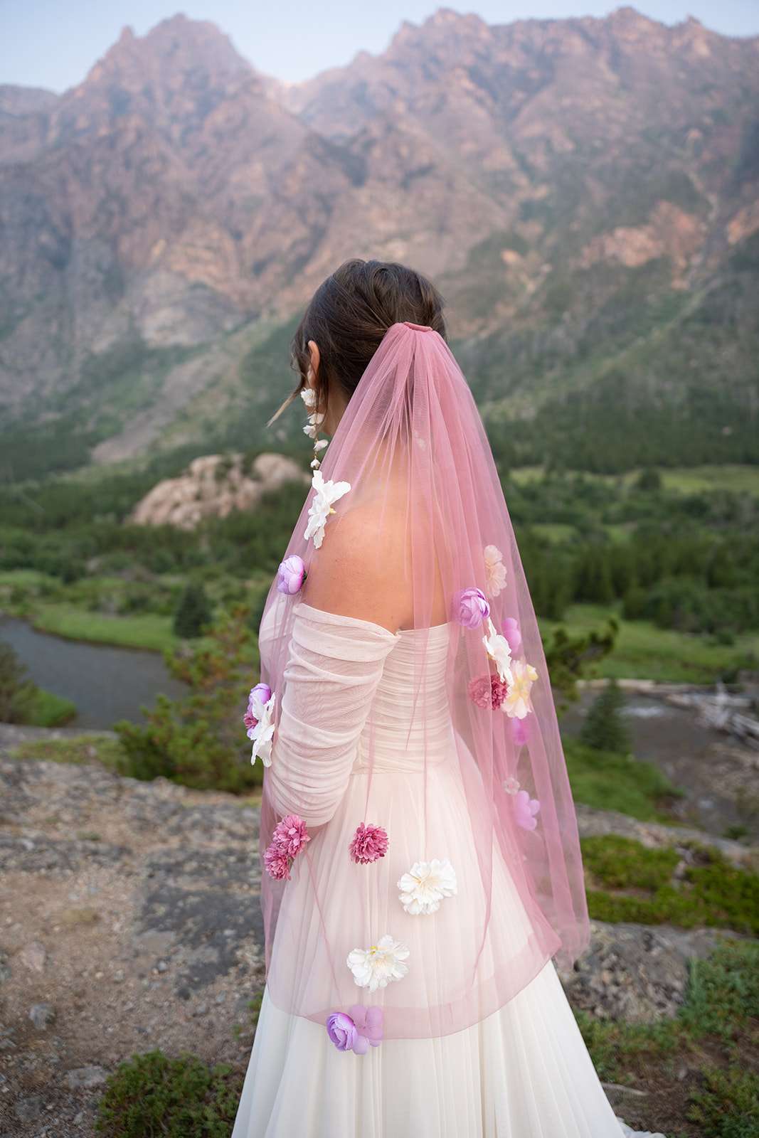 Niky and Vlad, who were married in July in Montana, had a full day of celebrating – from before sunrise to after sunset. The kicked off by waking up before dawn and hiking up their favourite trail (in full wedding garb!) for their sunrise ceremony. Afterwards, they did photos, stopped off at a skate part for Vlad to show off his moves, had burgers for lunch and then went back up the mountain for a sunset picnic complete with cake and pizza!