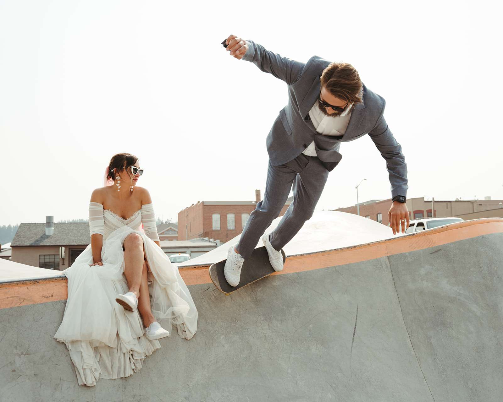“Our inspiration came from what we do on the weekends”, the bride explained. “We love hiking on a favourite trail, Vlad finding a skatepark wherever we go, good food and and low pressure. We just wanted to do what we wanted. It felt like a vacation all