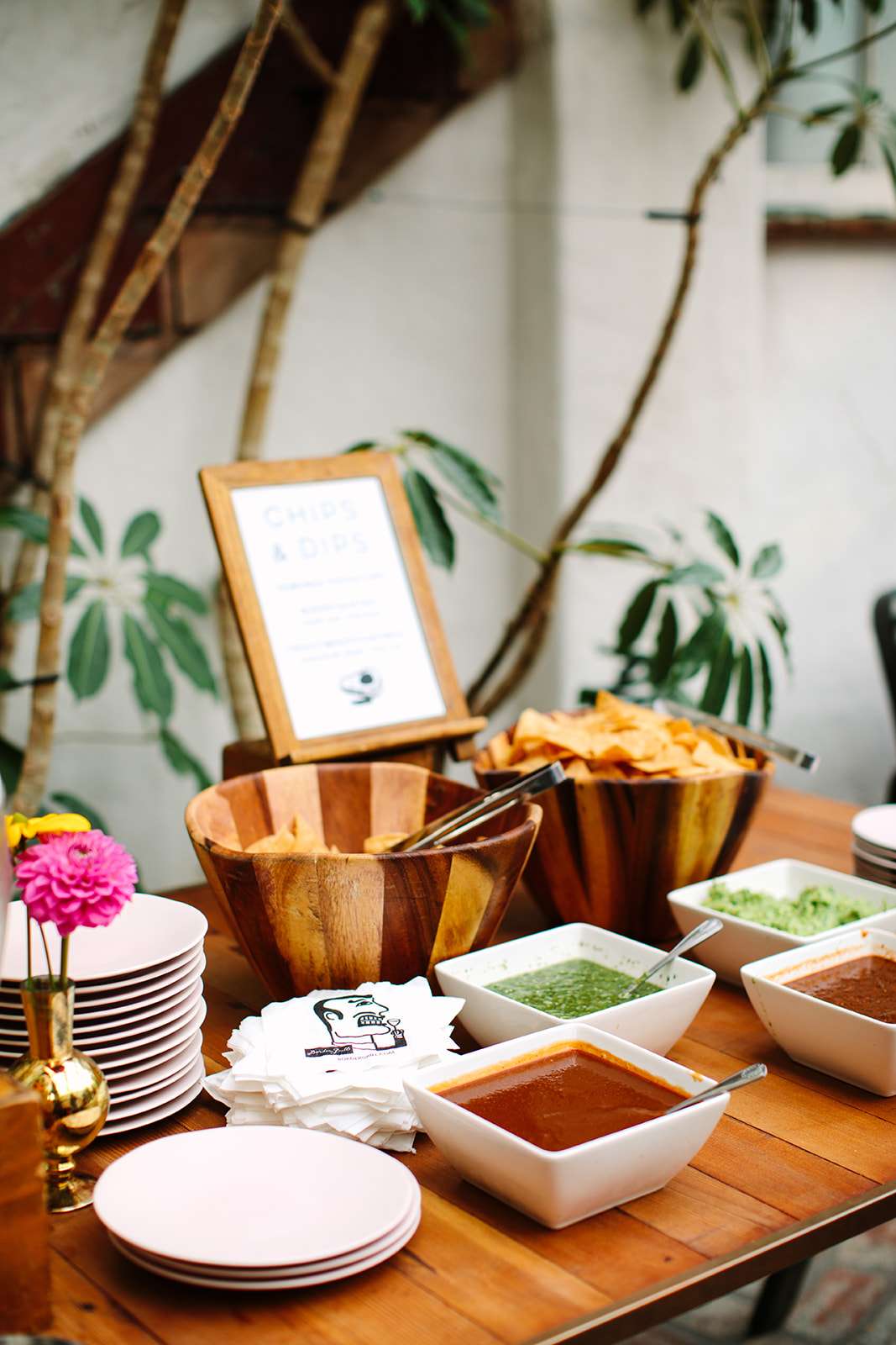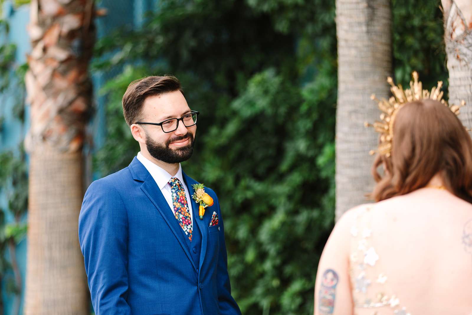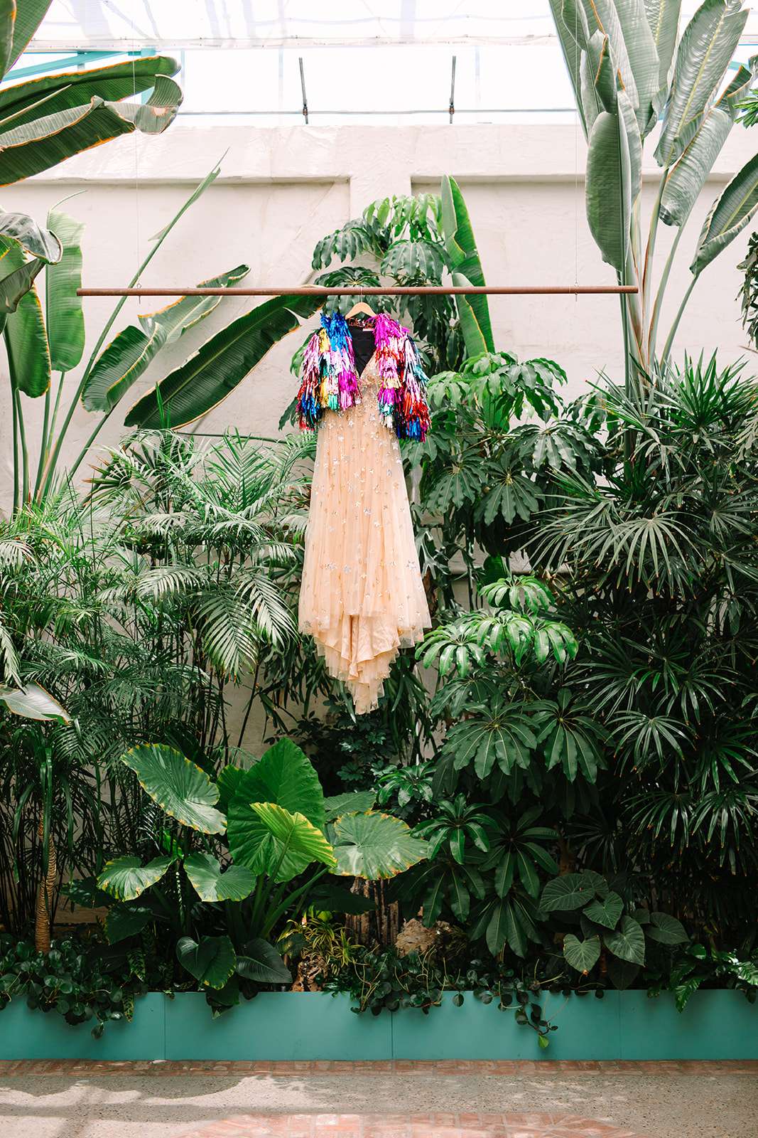 When Julia and Jackson decided to get hitched, they just wanted a day which felt unique to them and had lots of colour. They chose Valentine, a large event space in Downtown LA as their venue. The greenhouse courtyard was the perfect setting for the ceremony and their reception was held in a connecting space which has a stunning sunset mural on the wall and unique hexagonal doorways.