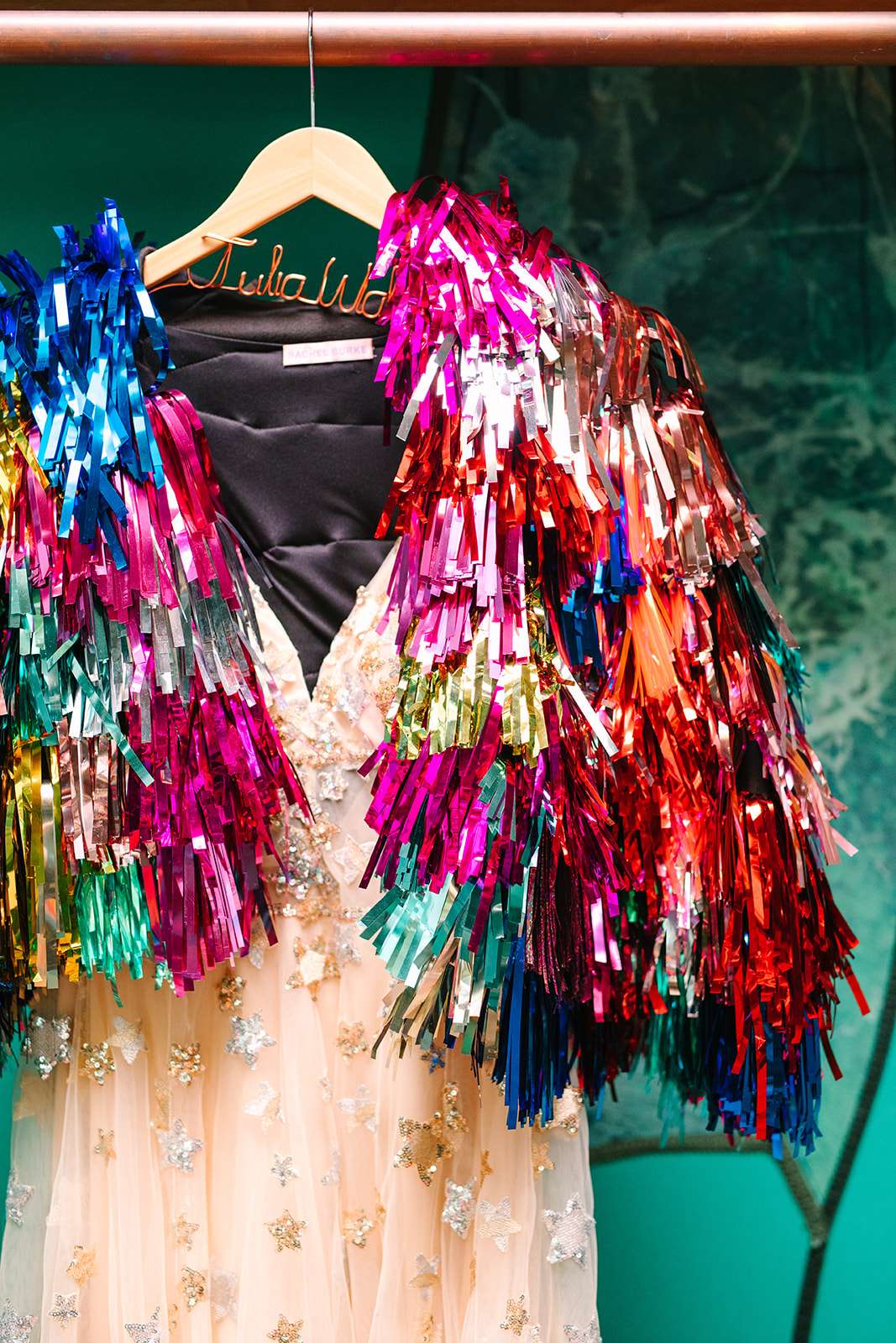 Julia’s look was also anything but traditional! She wore the Orion dress by Willowby by Watters, bright blue ankle boots, a Carbickova Crowns headpiece and a tinsel jacket made by Rachel Burke. The bridesmaids were in yellow and orange to match the tropical/ sun set colour scheme.