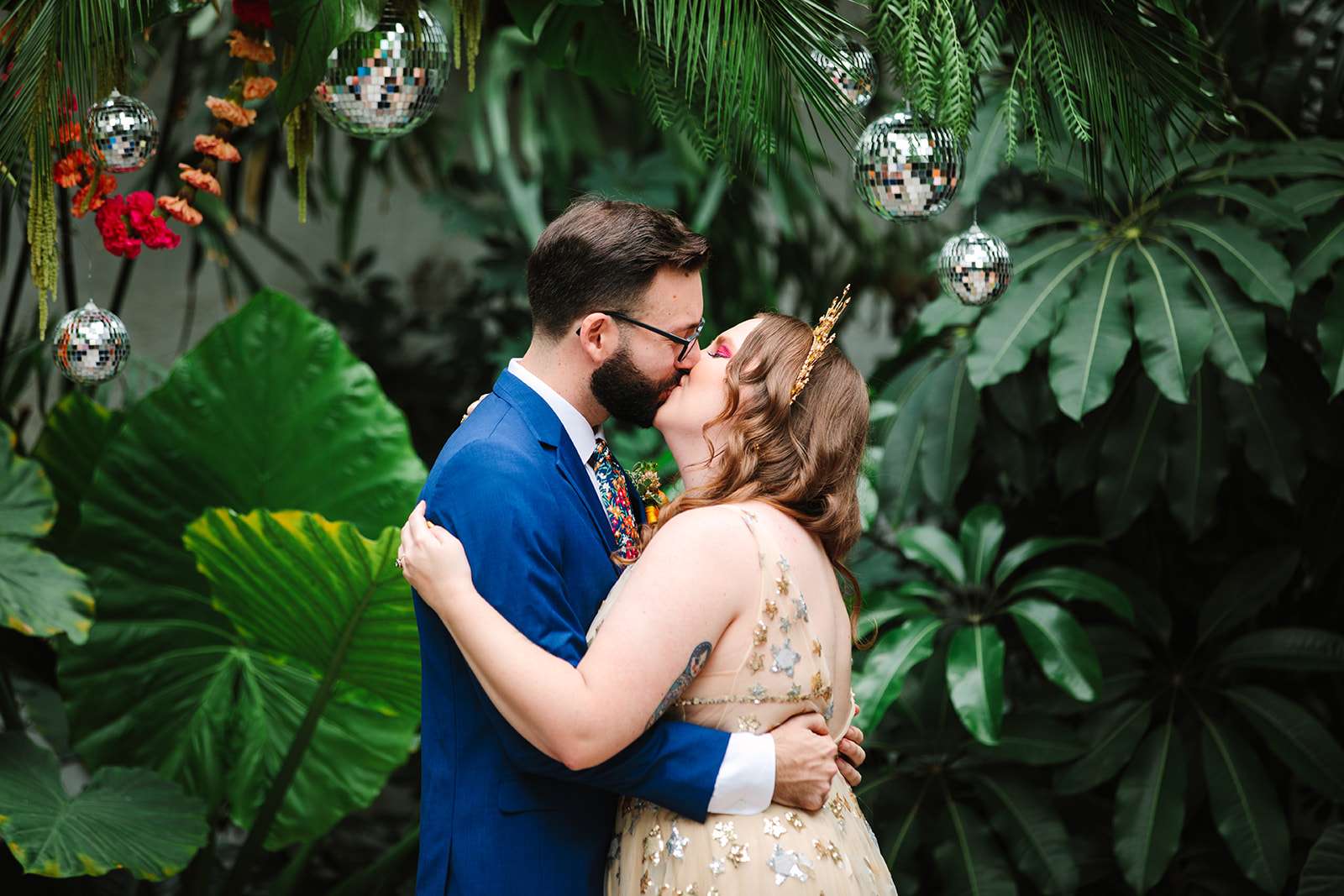The bride also designed all the stationery (save the dates, resave the dates (thanks to Covid!) invitations, menus, table signs, custom magnet buttons and name cards) and they used mini disco balls for place settings. Although very involved in the creation of everything, the couple hired Holly Gray of Anything but Gray Events as their wedding planner, who set everything up on the day for them.