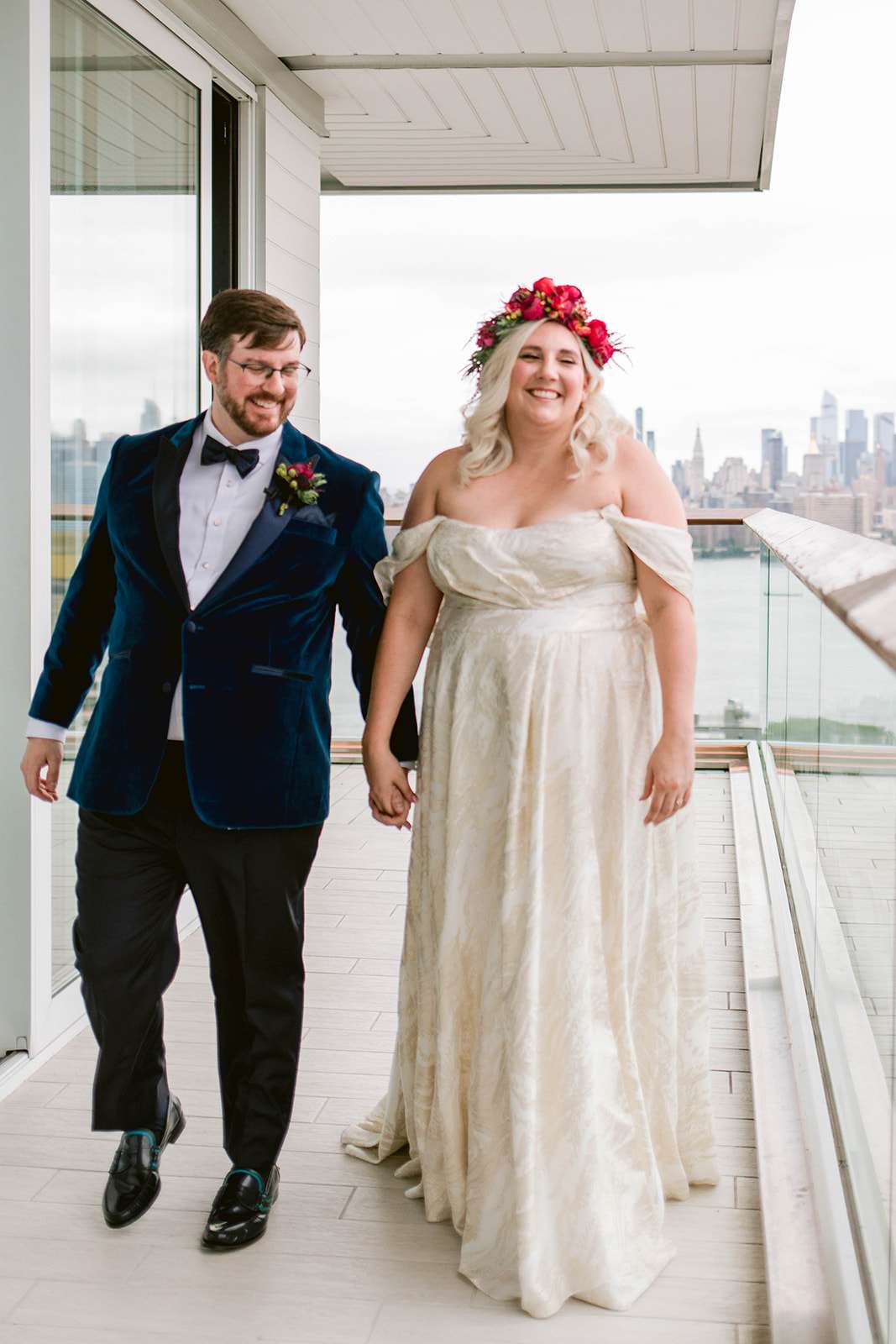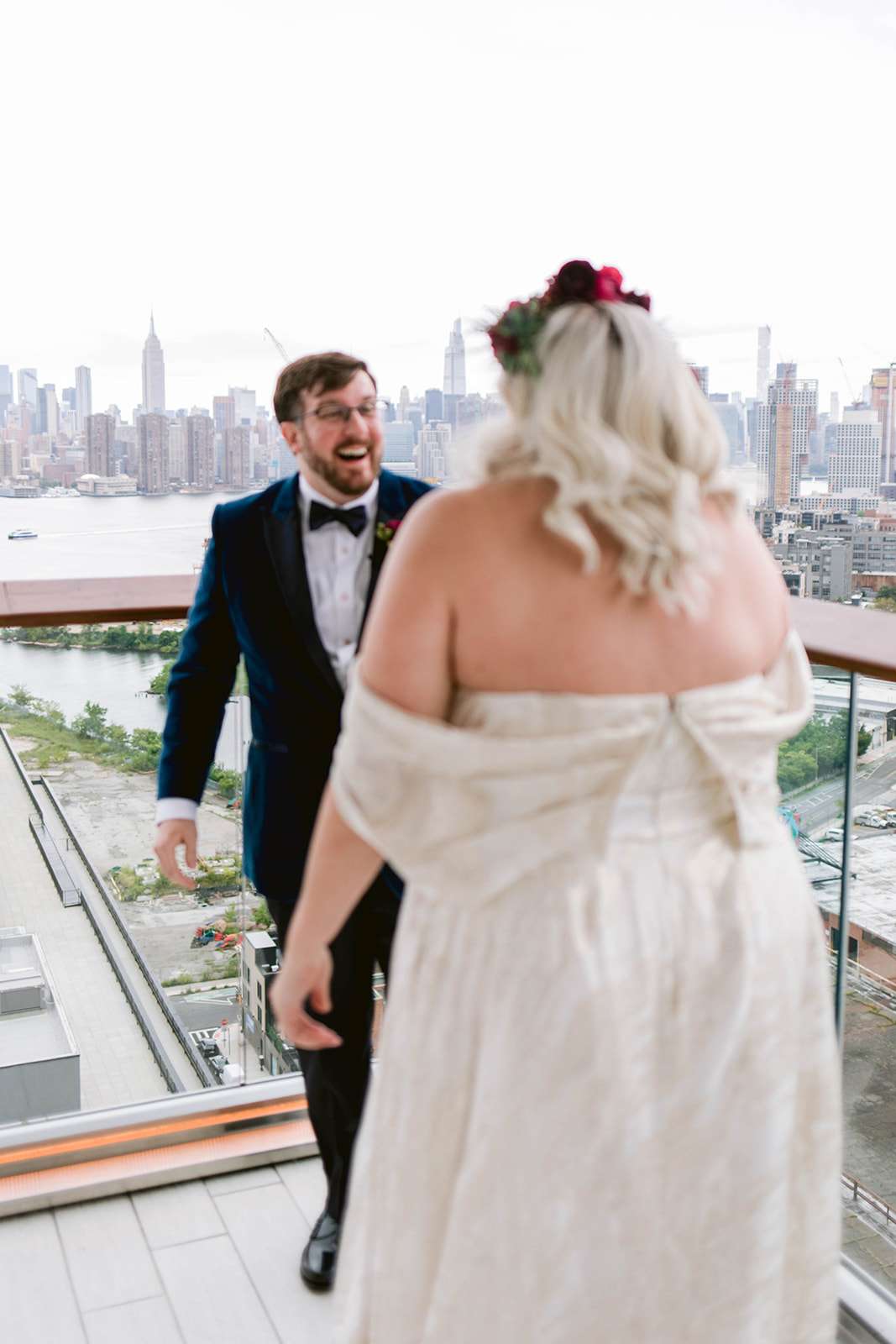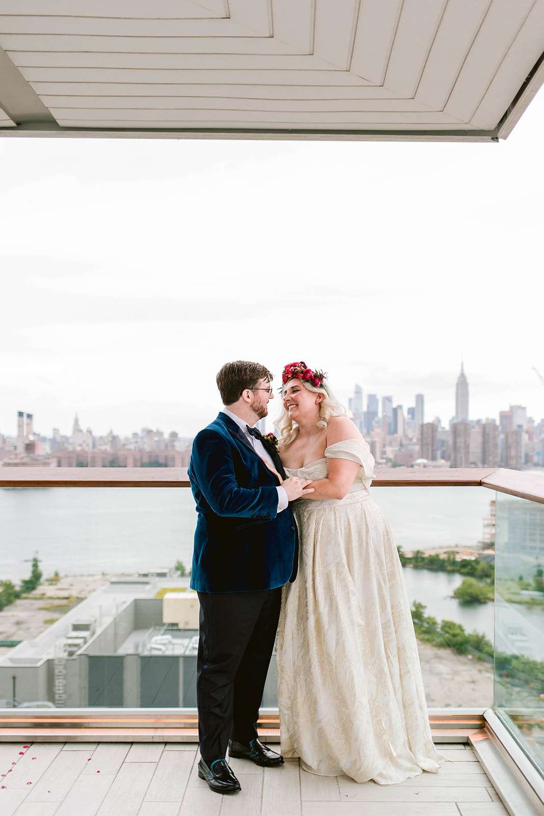 The couple both put a lot of thought and effort into their outfits – with Jamie choosing both a ceremony and a reception dress, and Jeremy commissioning a custom teal velvet tuxedo from a small Brooklyn-based retailer that specialises in inclusive, bespoke suiting. Jamie’s jewellery was a mix of heirloom pieces from both sides of the family and a gift from Jeremy. Her grandmother, unable to make the journey to New York for the wedding, was able to be present for her ceremony dress fitting in Kansas which was super important to the bride, and she also chose a custom-made reception dress from sustainable, inclusive fashion designer Loulette Bridal.
