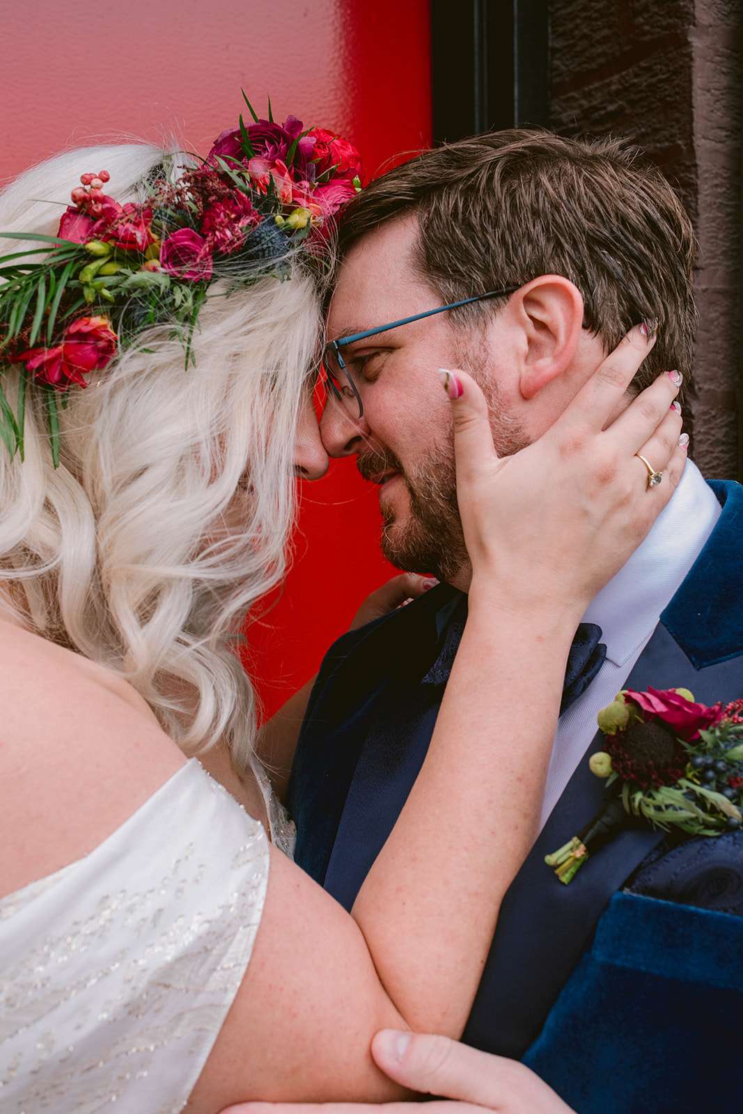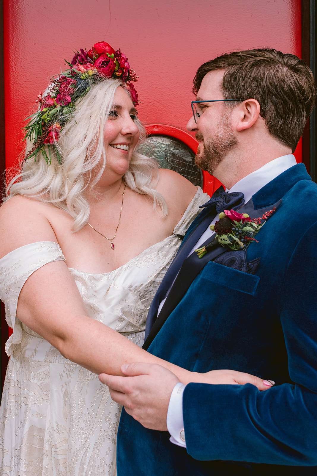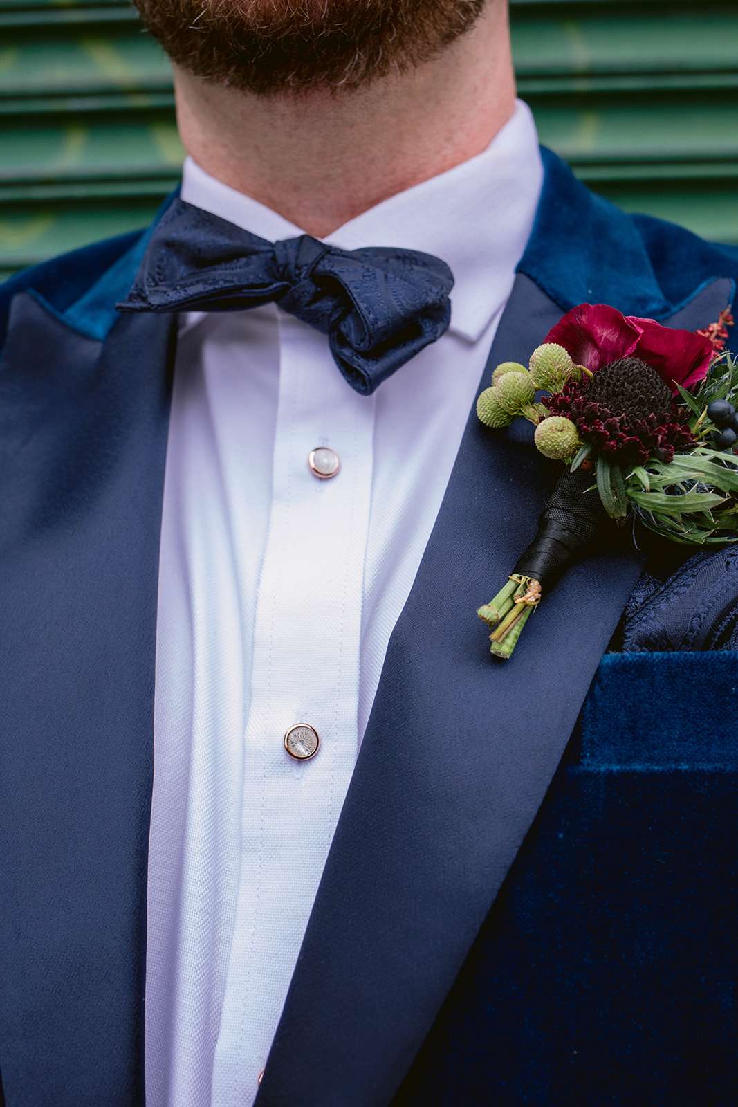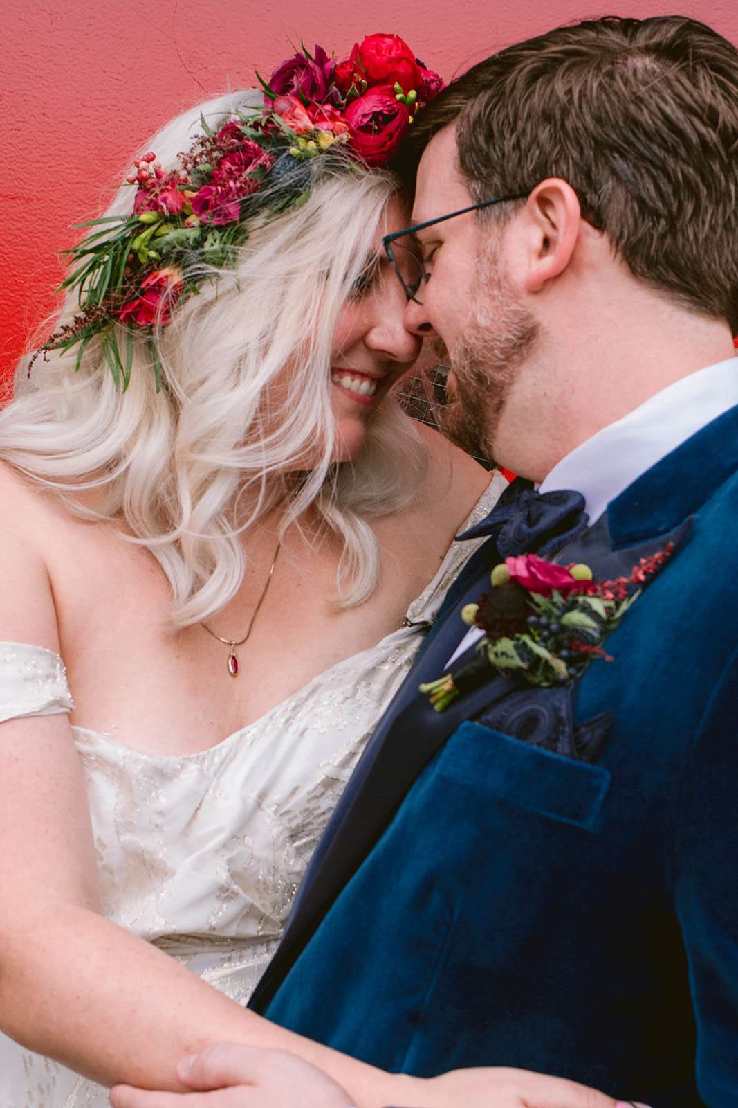 The couple both put a lot of thought and effort into their outfits – with Jamie choosing both a ceremony and a reception dress, and Jeremy commissioning a custom teal velvet tuxedo from a small Brooklyn-based retailer that specialises in inclusive, bespoke suiting. Jamie’s jewellery was a mix of heirloom pieces from both sides of the family and a gift from Jeremy. Her grandmother, unable to make the journey to New York for the wedding, was able to be present for her ceremony dress fitting in Kansas which was super important to the bride, and she also chose a custom-made reception dress from sustainable, inclusive fashion designer Loulette Bridal.