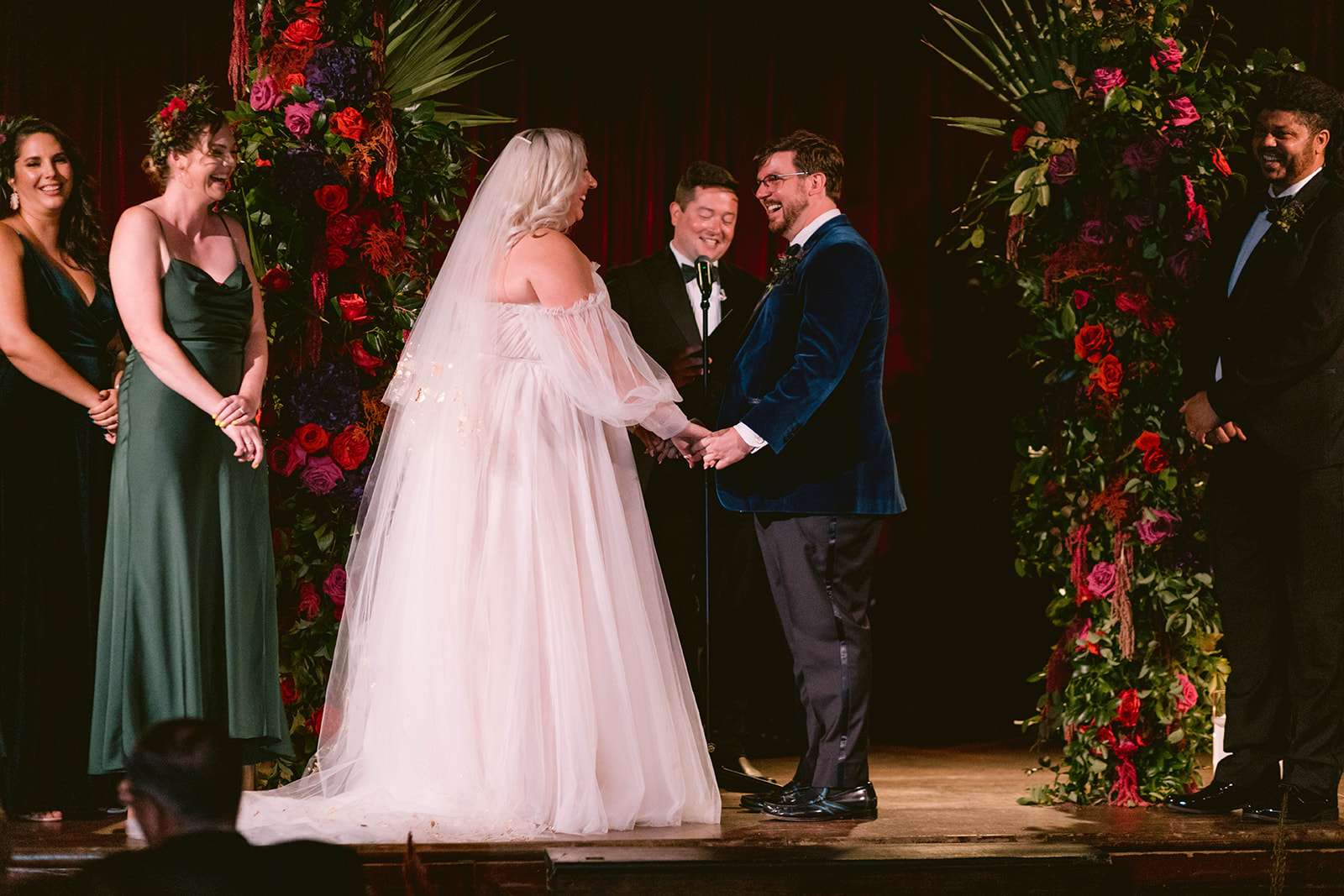 “A big part of the wedding was making sure our guests got to experience our favourite things,” Jamie began. “Jeremy was a Broadway musician before law school and we both love music so it was important to us to have live music throughout the day that really rocked. Aesthetics-wise, we’re both really into super-saturated jewel tones so we figured we should just lean into the moody colour palette. Above all else, we wanted a day that felt super loving, accepting and positive for everyone involved.”