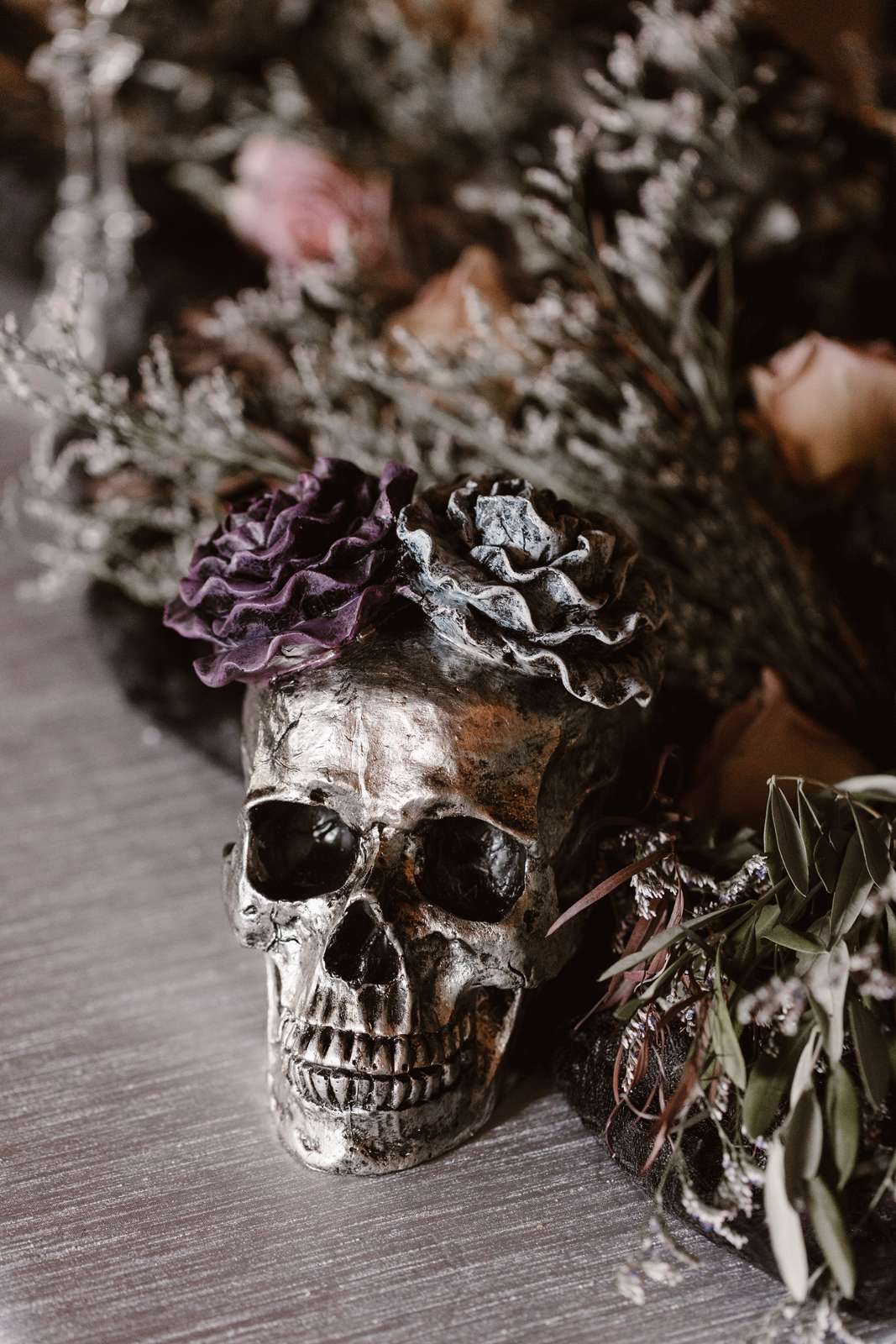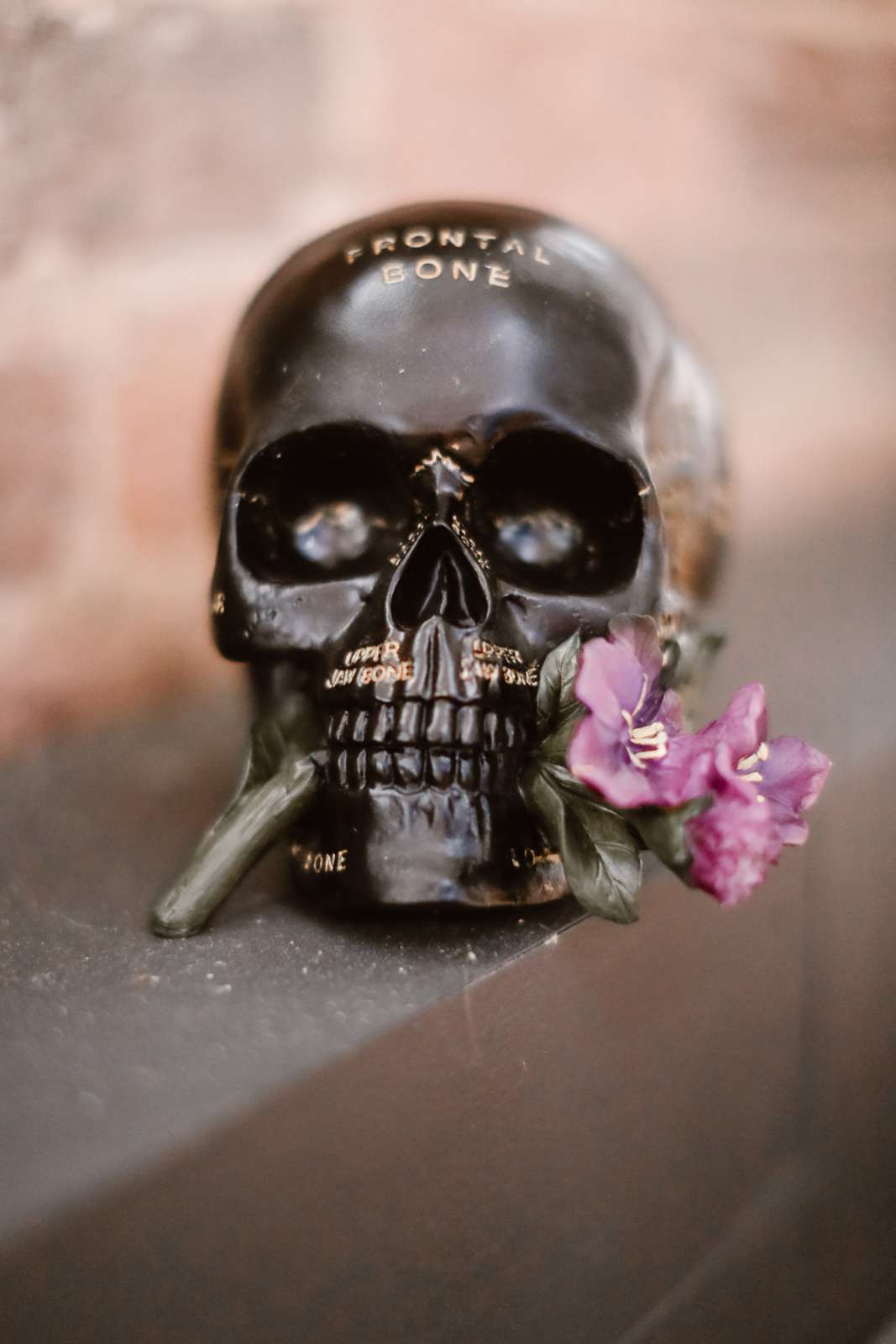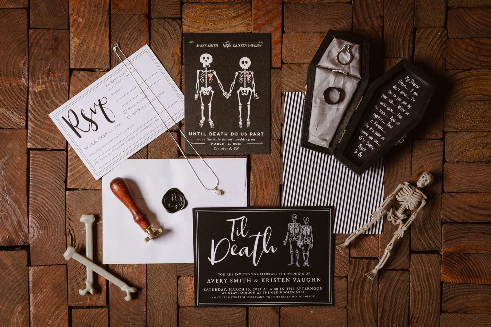 For Kirsten and Avery, every day is Halloween, so when it came to planning their March wedding day they always knew the wanted an alternative and macabre yet beautiful wedding. Specifically, they wanted to incorporate Kristen’s favourite movie, The Nightmare Before Christmas, as well as skeleton everything since Kristen loves forensic work. Kristen read and followed a lot of alternative wedding publications, such as Rock N Roll Bride, to find inspiration and plan their dream wedding.