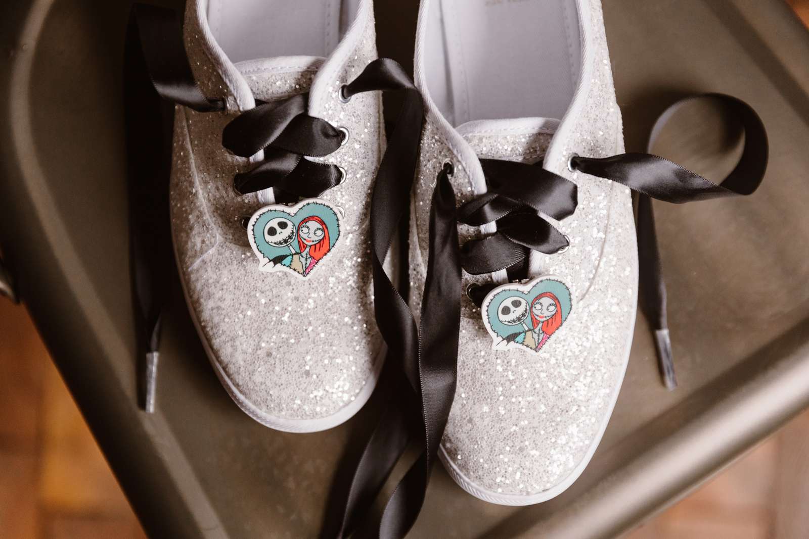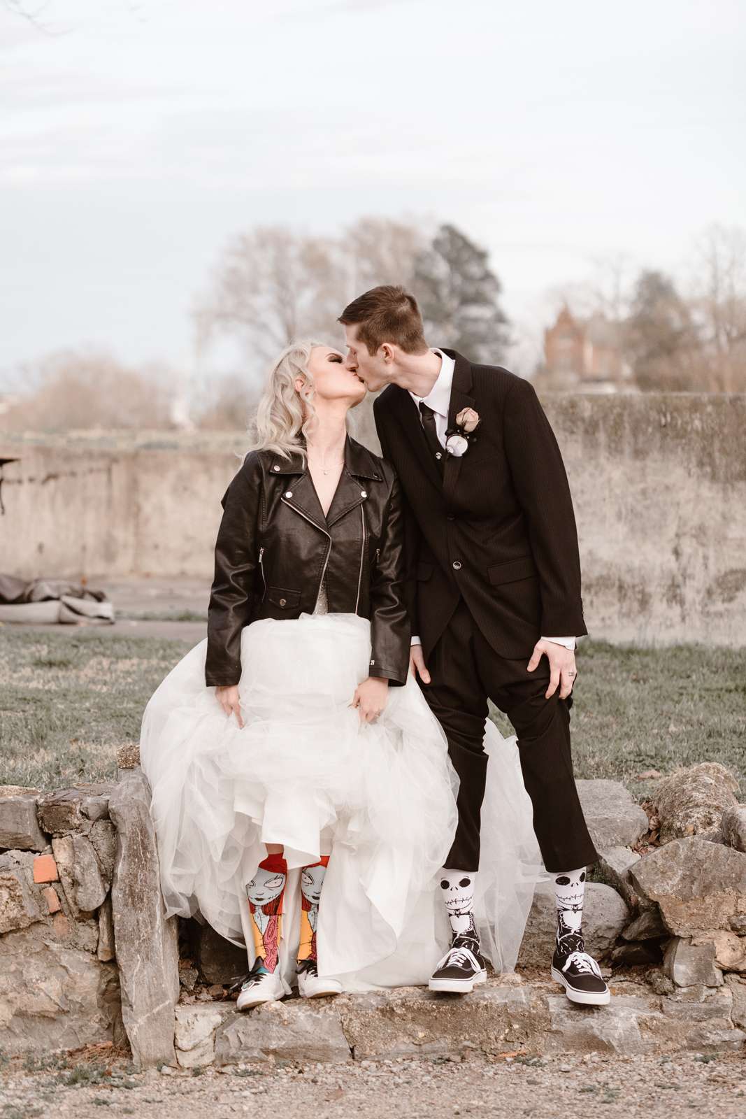 Married at the Weaver’s Room at The Old Woollen Mill near Cleveland, Tennessee, Kristen wore an ivory, sparkle encrusted dress from Ever After Bridal, which she accessories with Kate Spade x Keds trainers and a custom leather jacket to make the look her own. Blooms and Blossoms provided gorgeous, sumptuous florals and Emily Frock created a Jack and Sally inspired stationery suite to fit the couples’ theme.