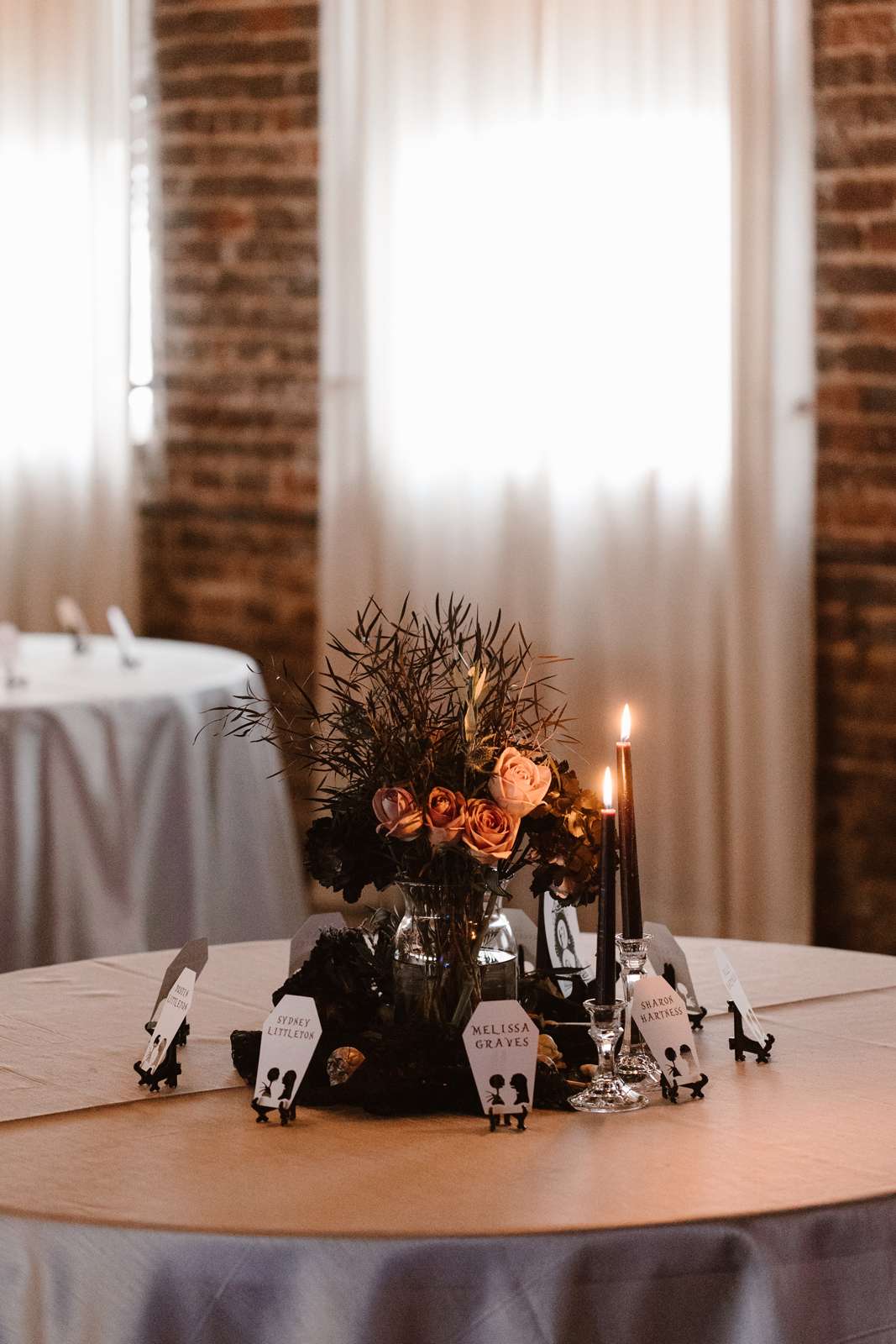 Instead of dabbling in DIY, Kristen chose trusted suppliers to bring her ideas to life. Marsh Made Design created a bespoke, Nightmare Before Christmas inspired cake stand, arbor and ceremony backdrop which they paired with vintage-inspired rentals elsewhere and a ’til death’ neon sign. The decor was completed with various pieces from Etsy. The florist and wedding planner even worked together to make each table at the reception a ‘cematerrarium’.