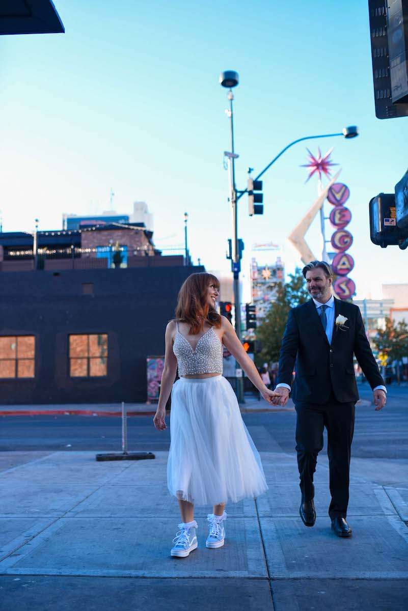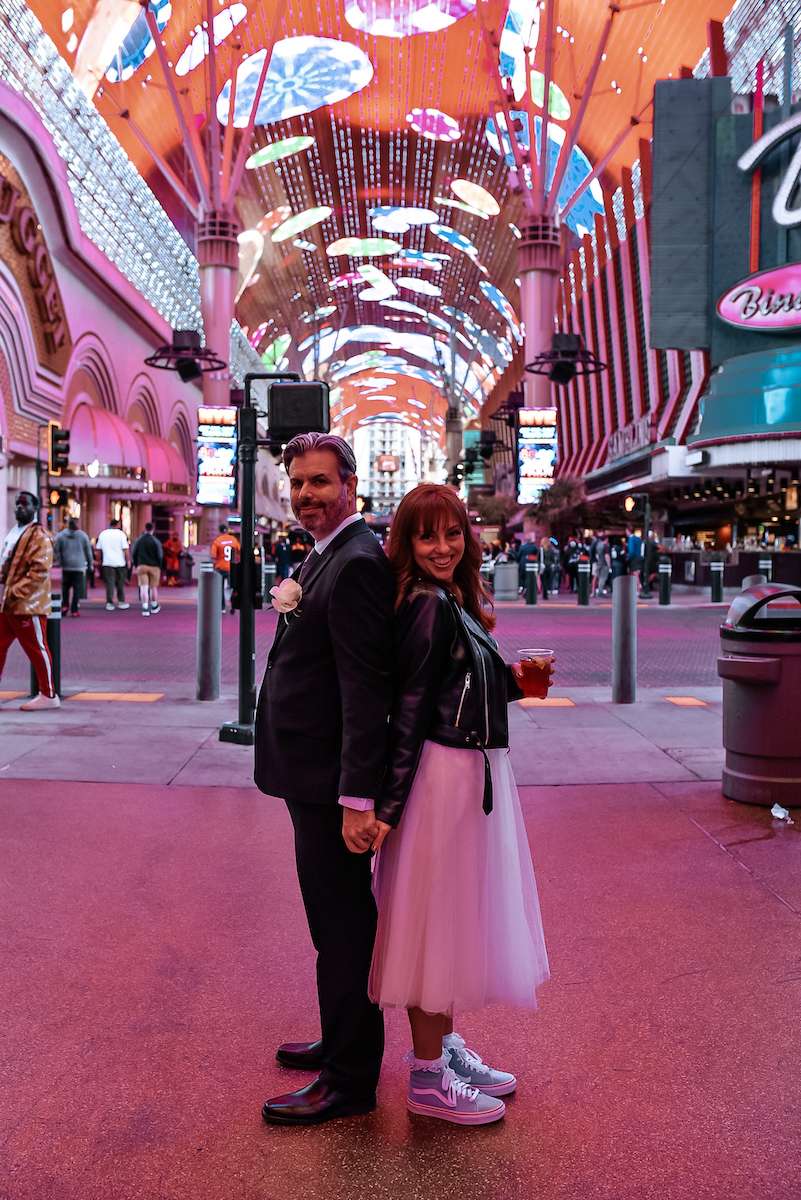 Jeff and Nikki wanted to focus on their life-long marriage, rather than the traditions of a wedding day, so were keen to keep things relaxed; burgers and fries, a quick change into comfortable post ceremony shoes, hanging out with friends, taking loads of fun photos and a fancy steak dinner to cap it off. As it wasn’t a first wedding for either of them, they understood what mattered to them, and what was less important. Nikki told us, “We got ready in our hotel room eating cheeseburgers, met Elvis, wandered Downtown Las Vegas while getting congratulated by passers-by with varying levels of sobriety, had an amazing steak dinner, enjoyed swanky bespoke cocktails and rallied with friends before calling it a night – it was the perfect day!”
