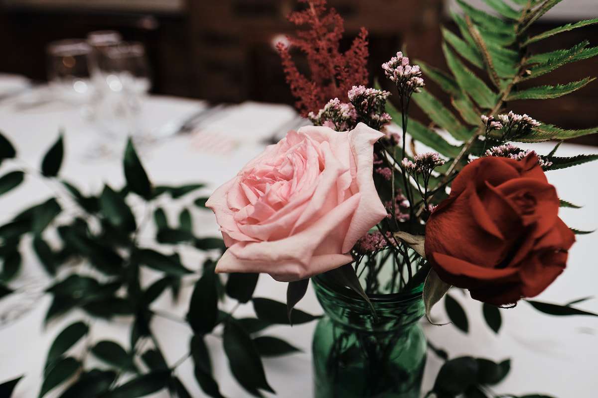 Letting the venue’s natural style shine through, Chelsea picked up green glass vases from charity shops to add a pop of colour and match the groomsmen’s jackets, and contrasted those with the pink and red flowers and bright neon signs.