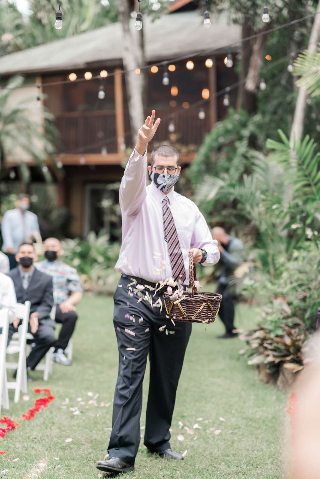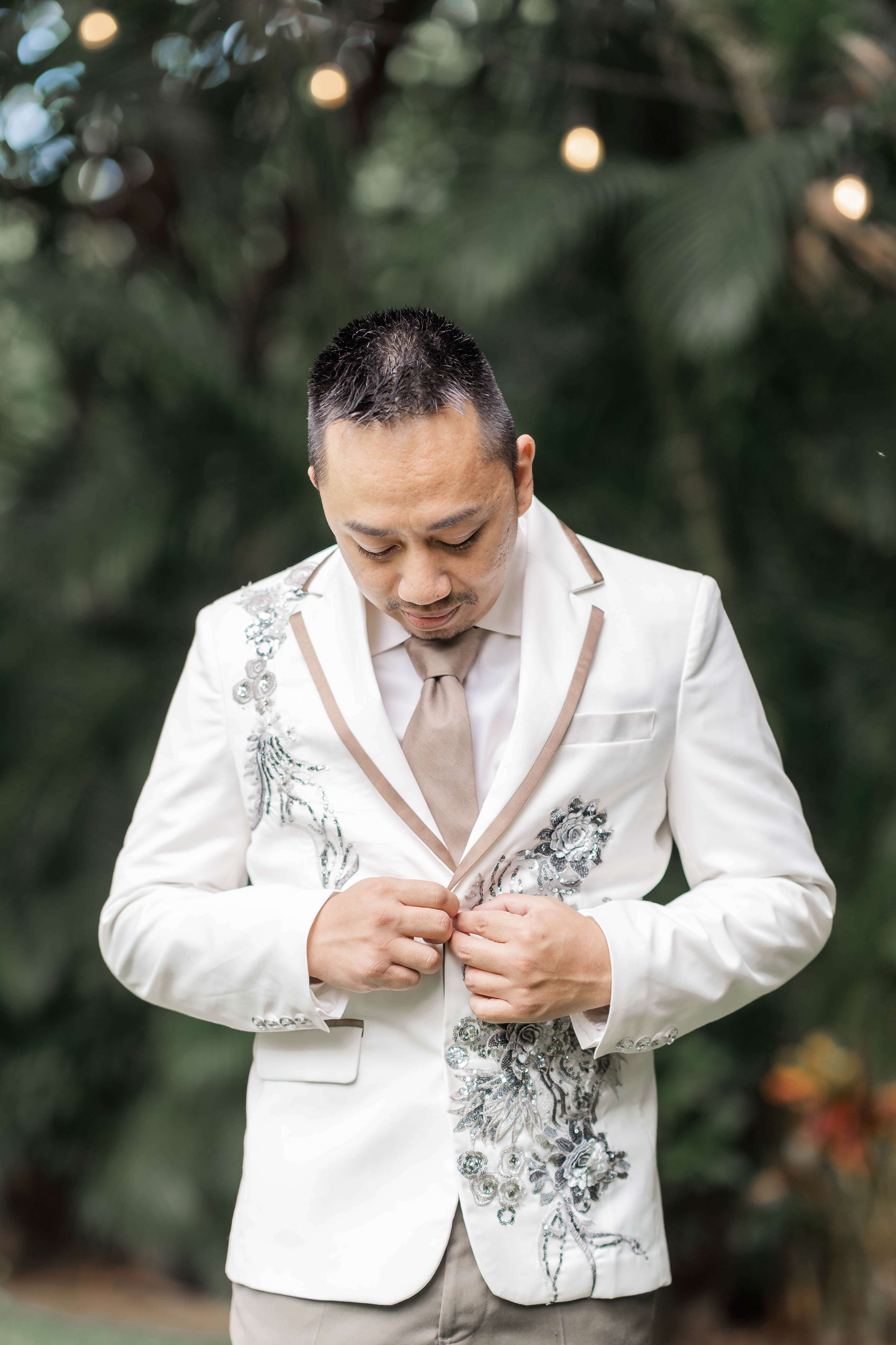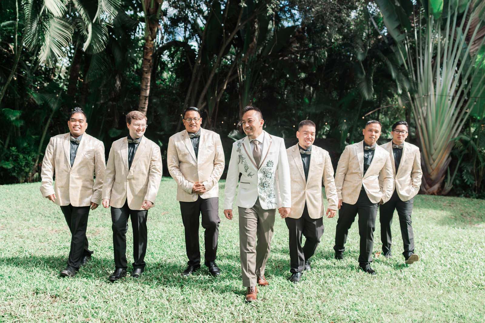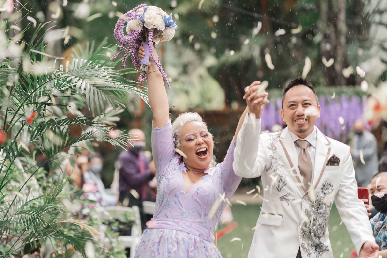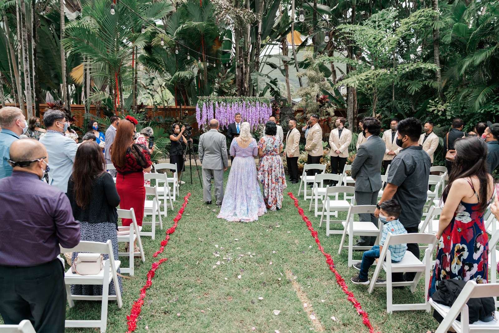 The ceremony itself was short and simple but meaningful. The wedding party and couple walked in accompanied by a selection of Disney songs – You’re Welcome from Moana for the groom and groomsmen, I See the Light from Tangled for the bride and they walked out to a brass version of Into the Unknown from Frozen 2. “The ceremony was officiated by our pastor of almost ten years. There’s just a warm, calming feeling of being surrounded by family, by biology or by choice. As we walked out, it started drizzling and a light shower poured as soon as we reached the end of the aisle. It really made for a great photo!”