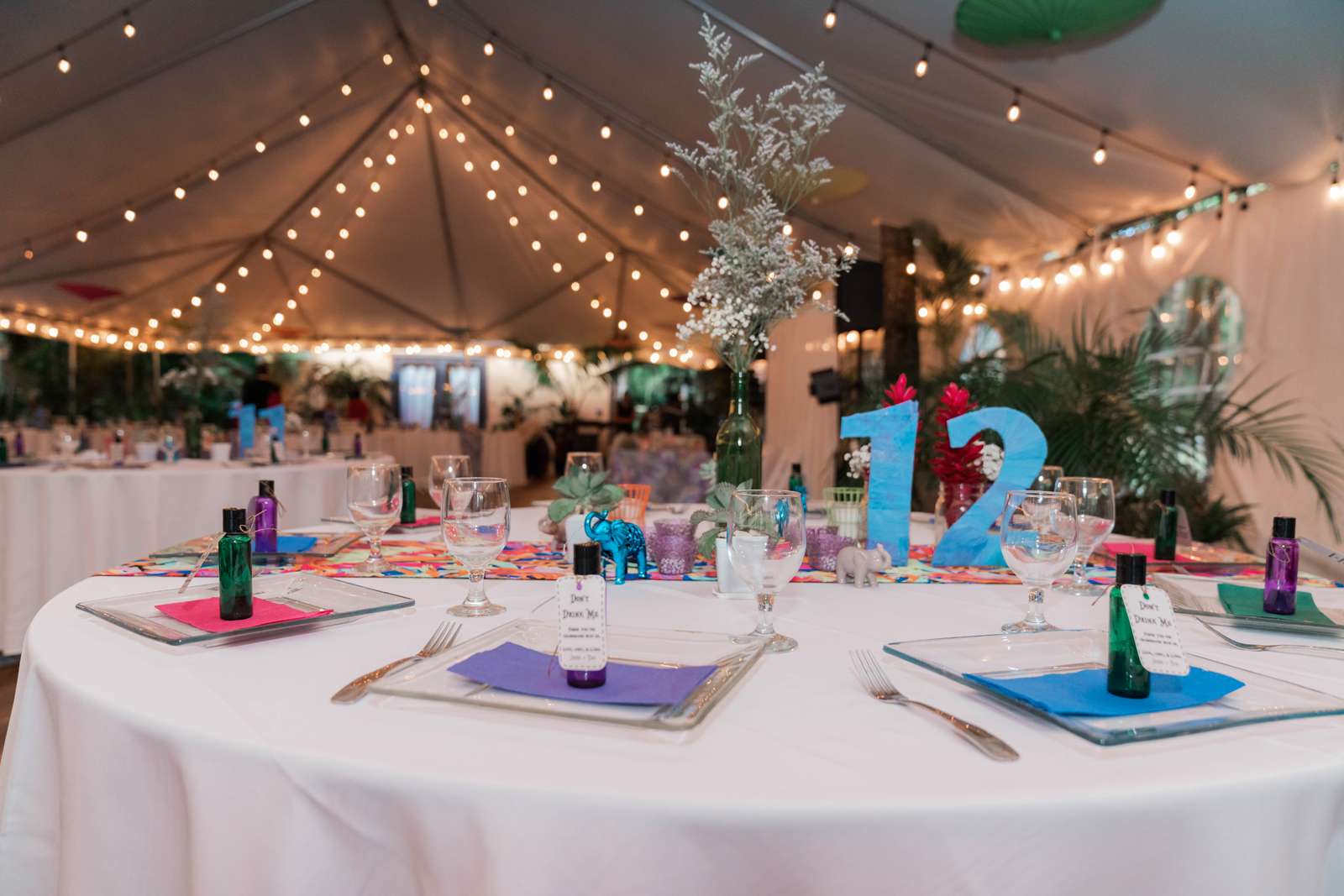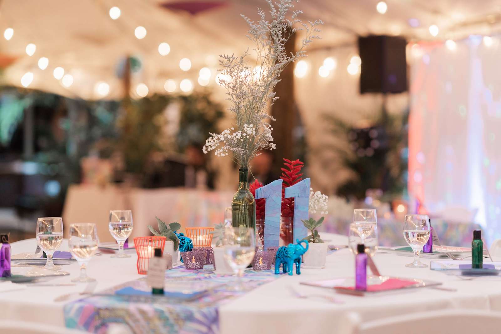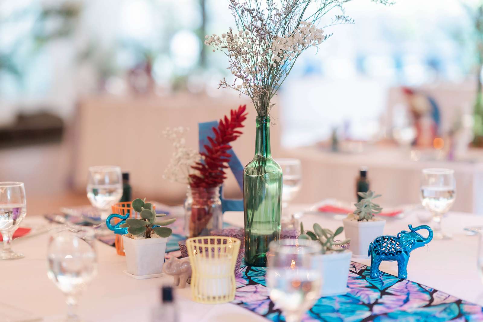 The DIY projects were plentiful, from the flowers (which were bought in bulk and put together by the wedding party and couple) to the handing parasol decorations and hand-me-down mason jars and wine bottle centrepieces. Random ornaments were bought from Goodwill and added to the tables too. The table runners were made from different off-cuts of fabric, which were reused for various things afterwards so there was no waste. All in all, the décor and all the flowers (including the bouquets) for the day came in at under $800.