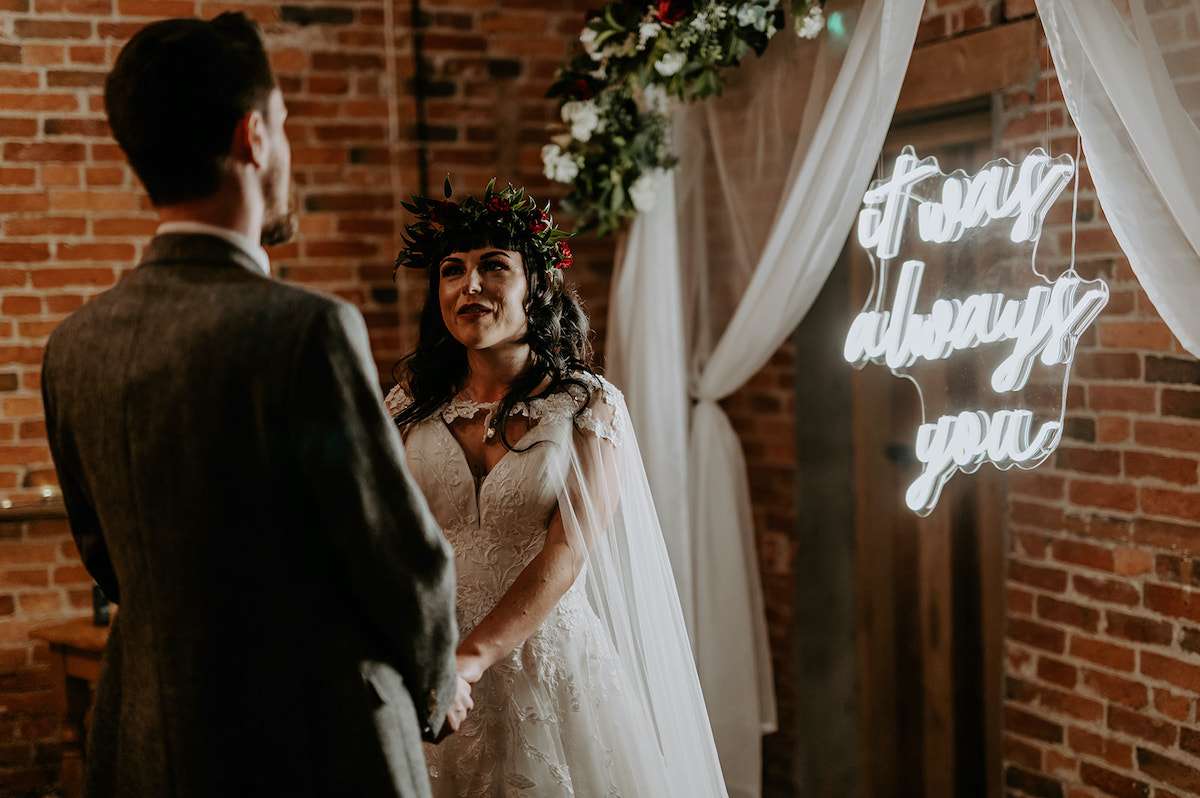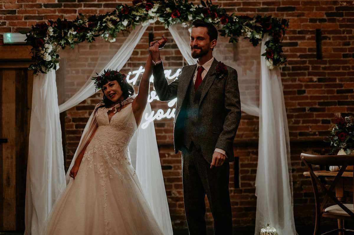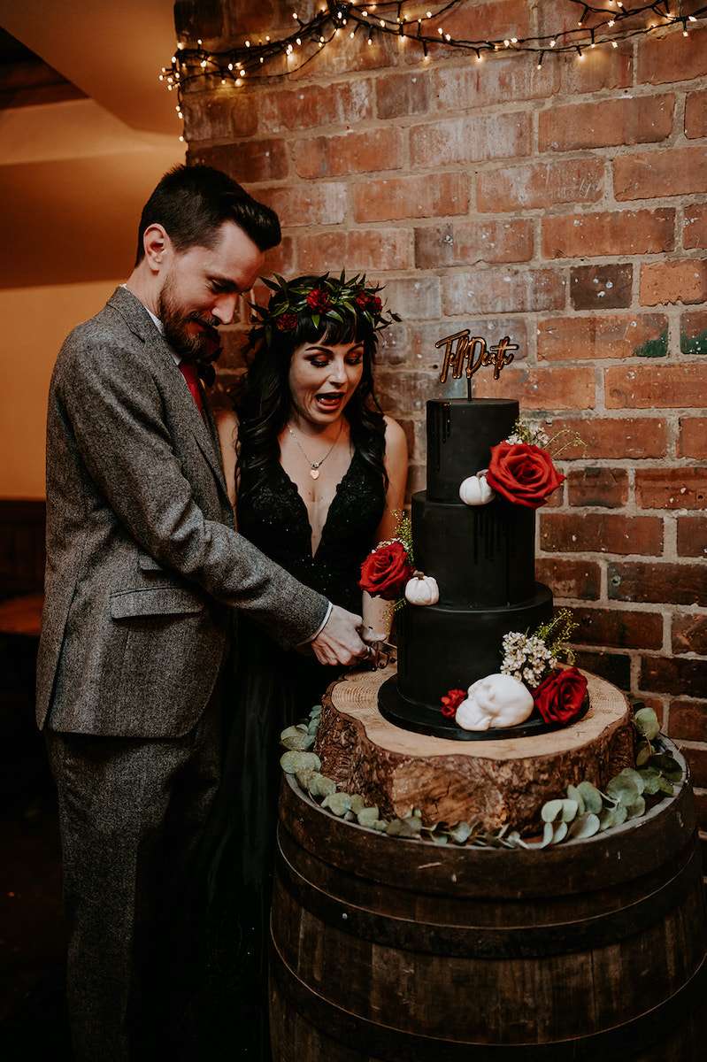 Remember MySpace? Kerrie and James met on the site back in 2007 before moving on to MSN to chat for hours. Come 2010 they were a couple, and 2021 finally brought their wedding. With a dark, autumnal feel, the couple were keen to have an unusual wedding vibe, incorporating Kerrie’s three favourite things – Halloween, Disney and Rock n Roll.