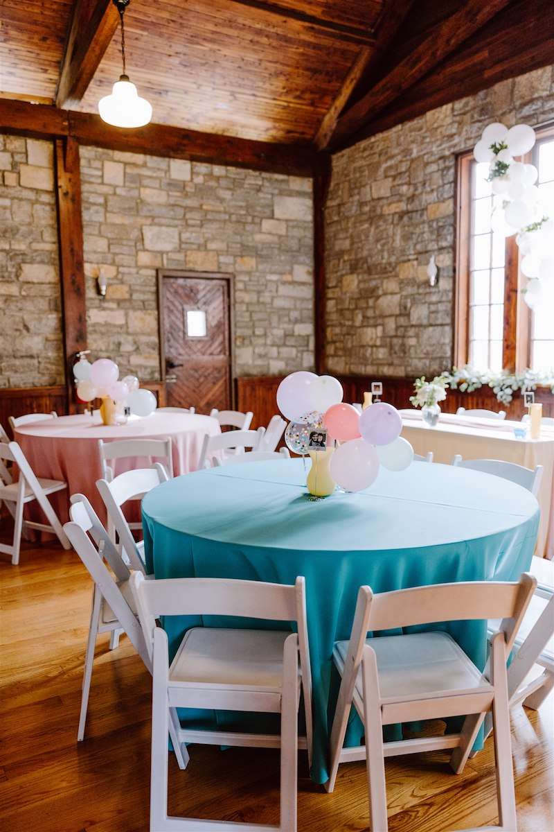 Saving money on flowers, replacing them with fun bouquets of balloons, Maddie and Paul’s friends helped them create centrepieces for their tables using the colours from their chosen palette mixed with confetti balloons and placed in vases Maddie had found in thrift stores and painted.