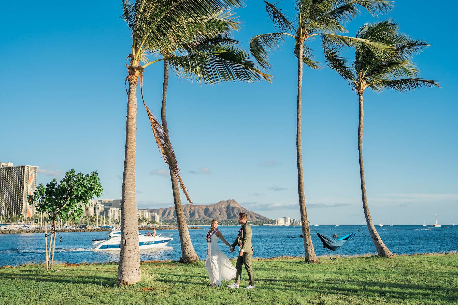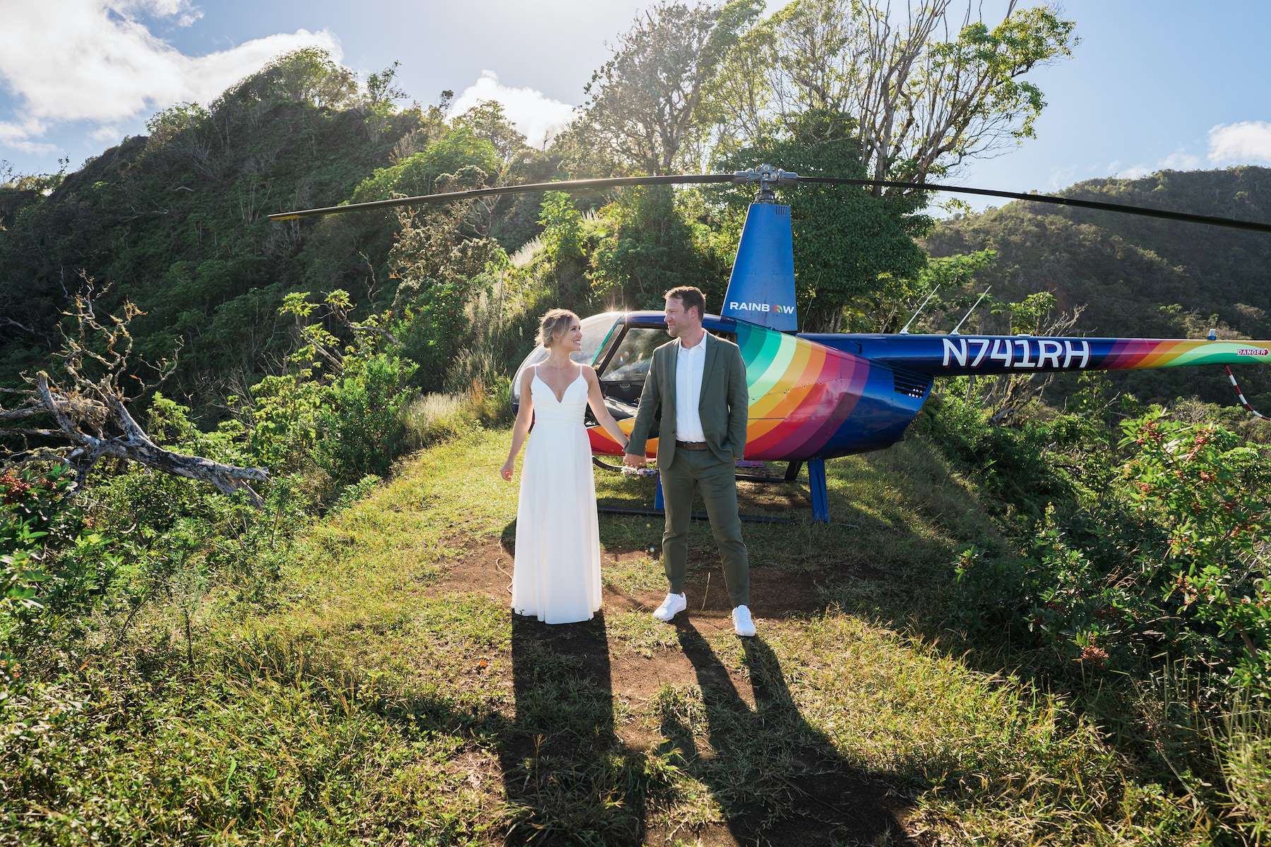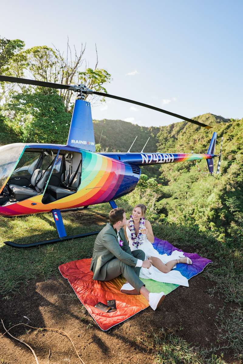 Ditching a big wedding in favour of a small celebration with just the two of them present, Andrea and Jason wanted to do something special. They chose a tiny ceremony, before heading up in a rainbow-coloured helicopter for a bird’s eye view of the island of Oahu, Hawaii.