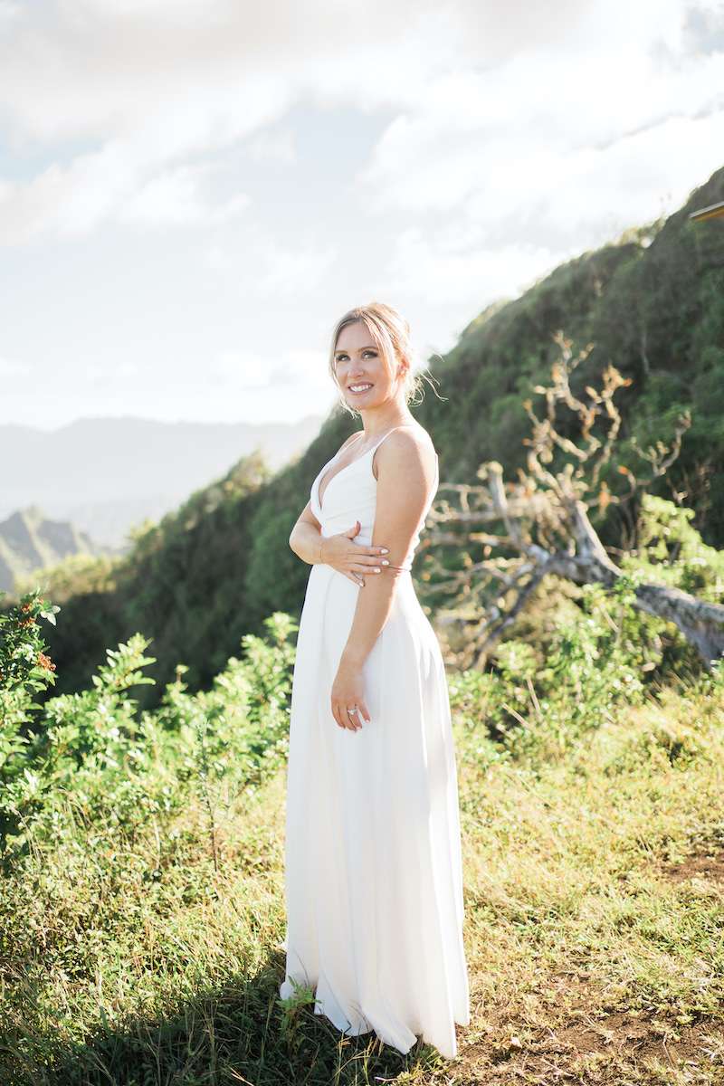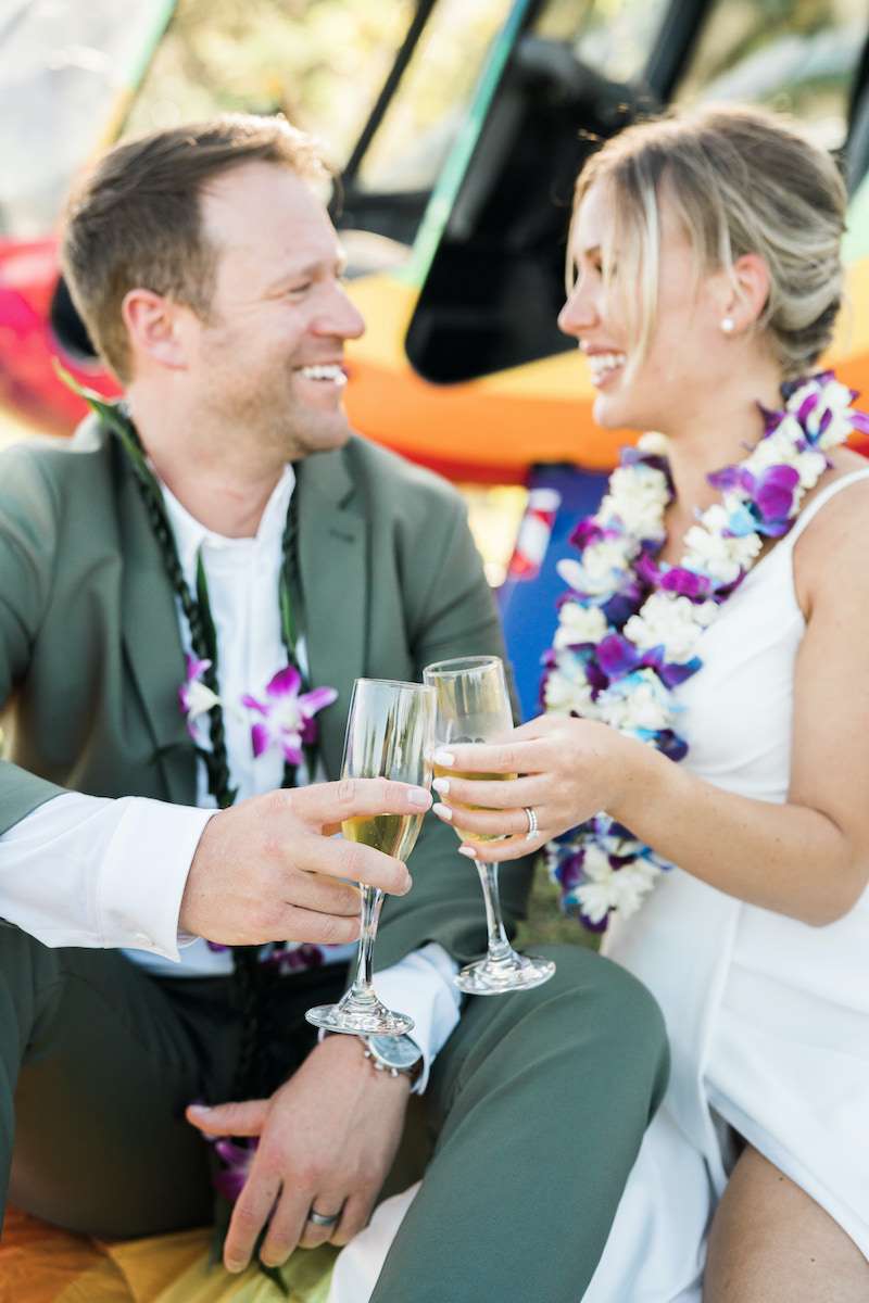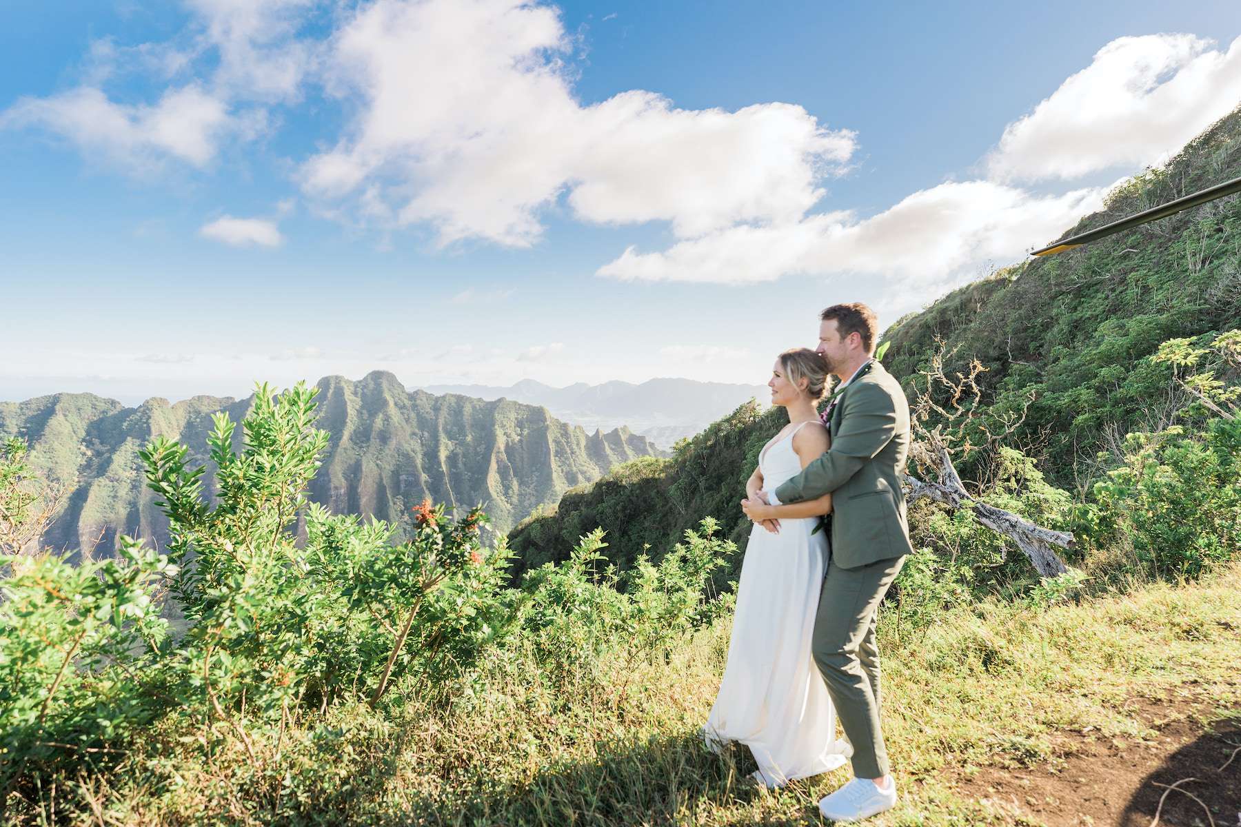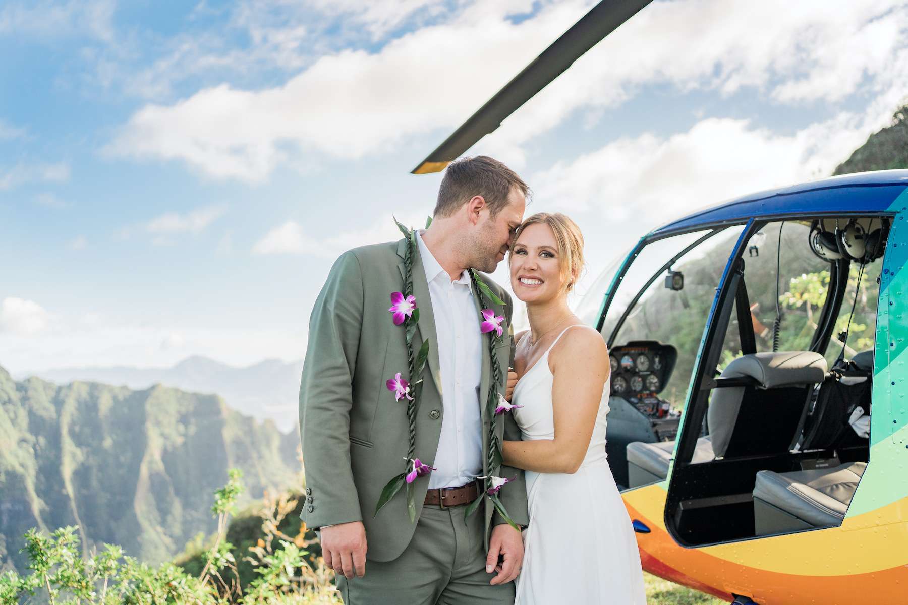 A photographer was an essential part of the day, and Rae Marshall captured the beautiful adventure which included a romantic champagne interlude to toast their love. Rae told us, “There is no better way to see the island of Oahu than by helicopter, seeing a waterfall you can’t normally see from the ground, incredible mountain ranges and the view of the city of Honolulu. The pilot told us what we were seeing as well, giving a little more insight. Photos on the ledge of the Ko’olau Mountain range were some of the coolest and most challenging I’ve done yet, but when our pilot headed toward the landing spot, I did question whether it was too small to land on!”