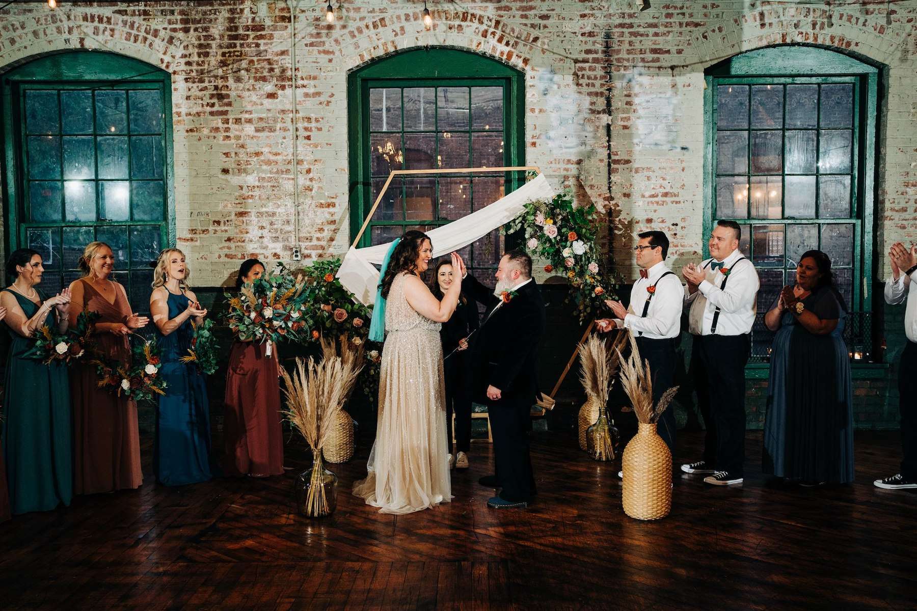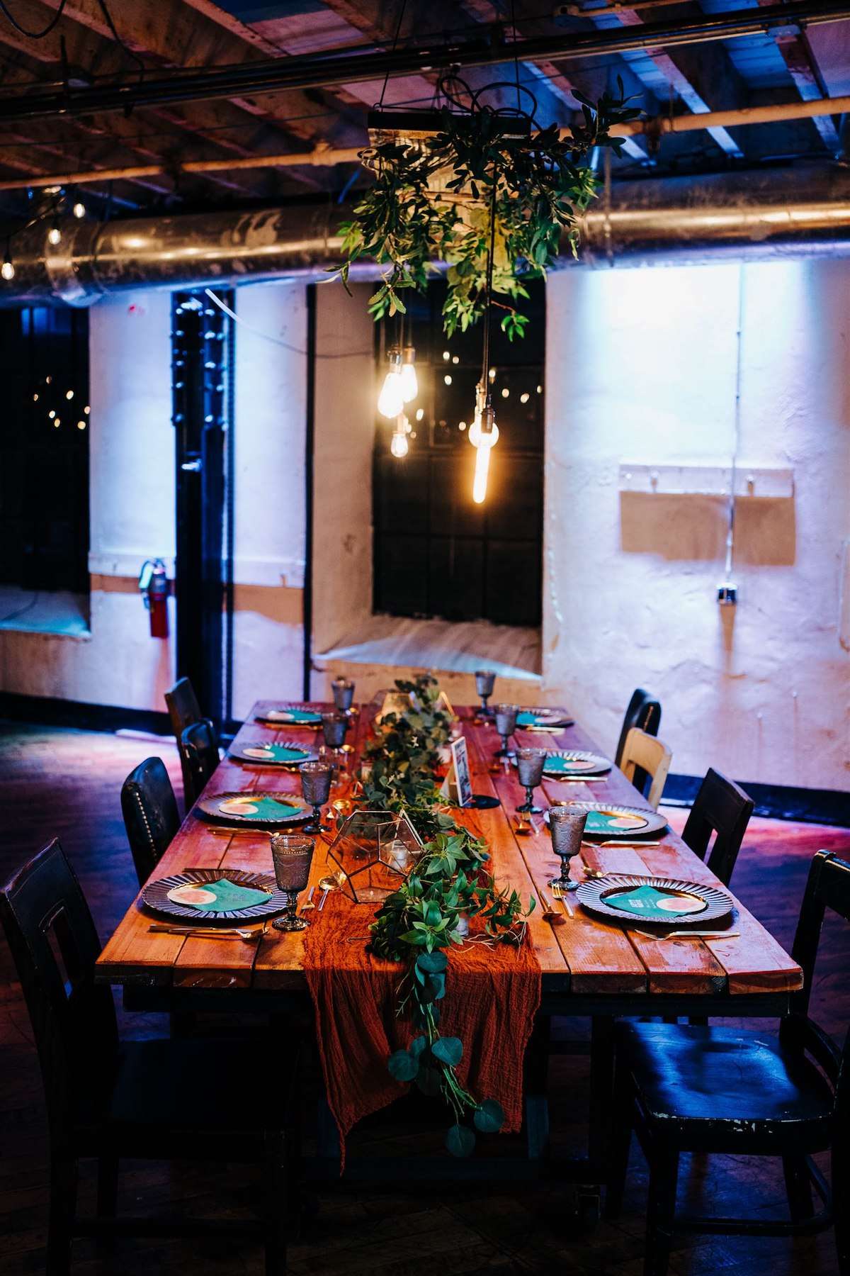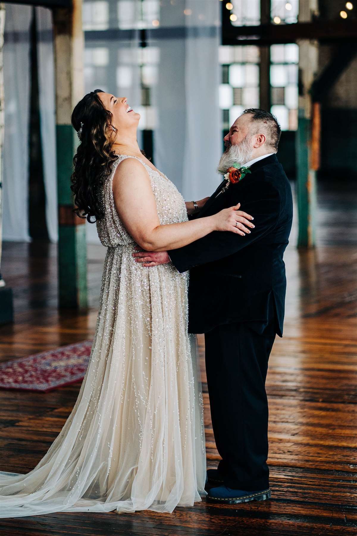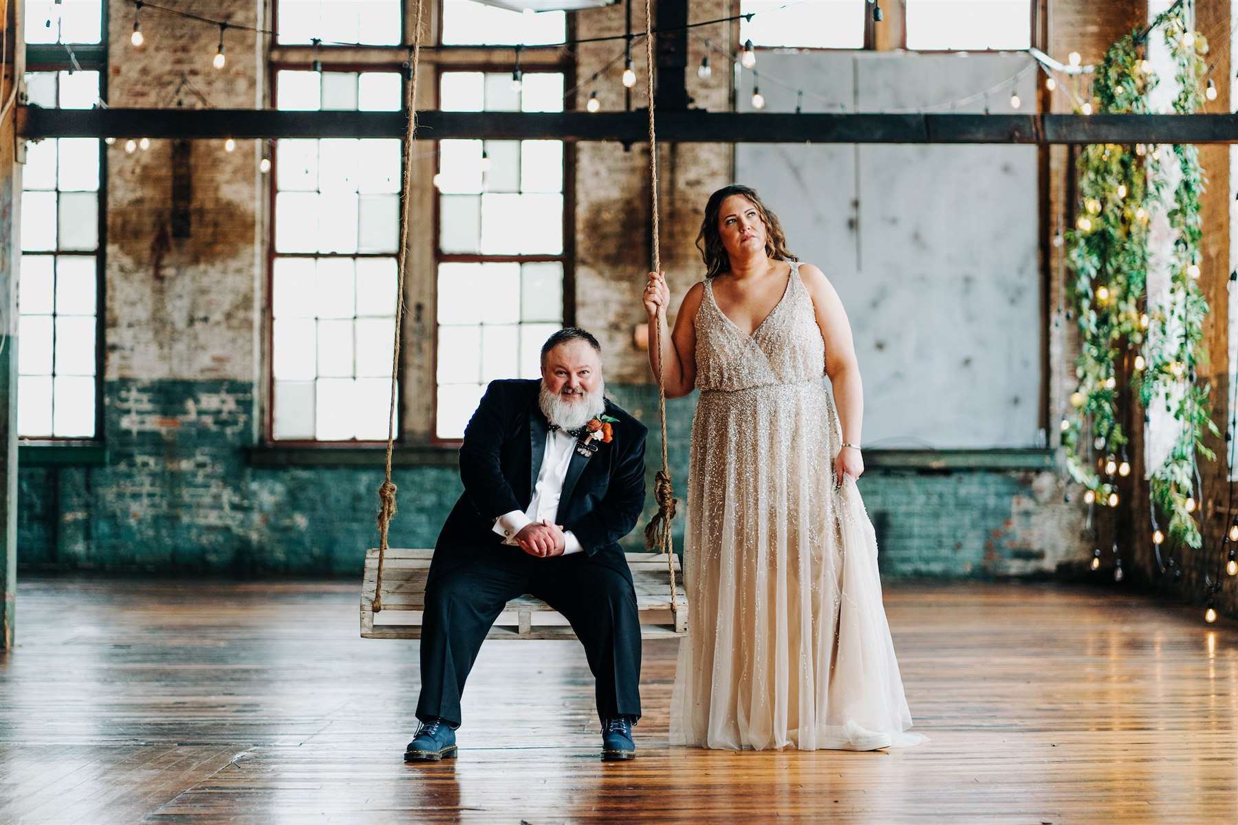 They chose the Art Factory as their venue, a historic factory loft space in New Jersey about 12 miles from New York City. A popular location for weddings and events, it also hosts film crews, as the couple found out, “While outside taking photos we noticed two scantily clad women with a videographer… turns out that a music video was being filmed right around the corner from where we were taking photos!” There are also swings throughout the Art Factory, and Ellen told us, “Dan loved creating his own Miley Cyrus Wrecking Ball moment and claims that was his favourite part of the day!”