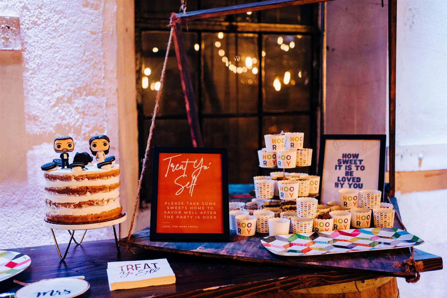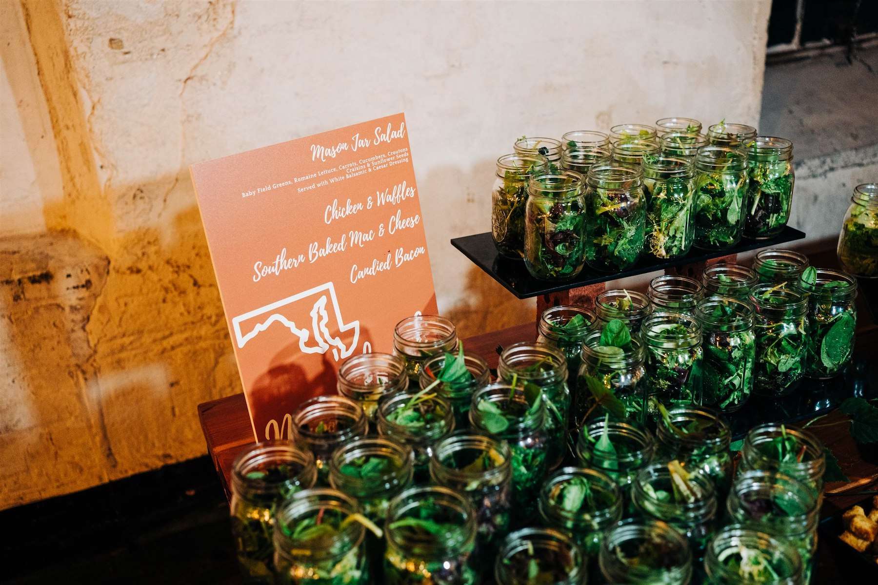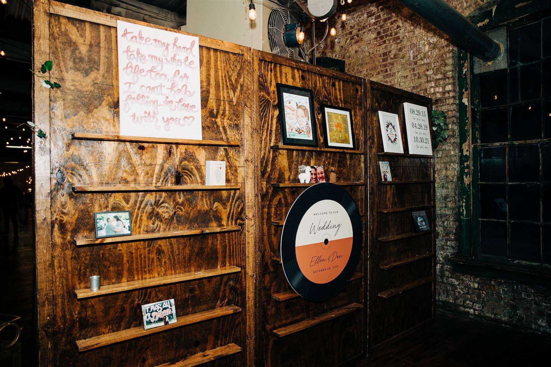 Ellen and Dan created a day full of personal touches. They are grilled cheese sandwiches as they had done on their first date, hired a caricature artist inspired by a drawing they had done at a Baltimore Orioles game, and marked each table with a miniature version of a poster from concerts they had attended together. The wedding invitation itself was designed to look like a record sleeve.