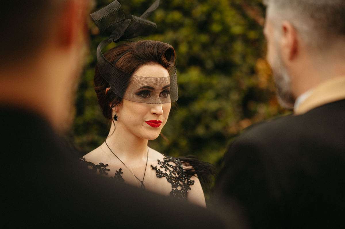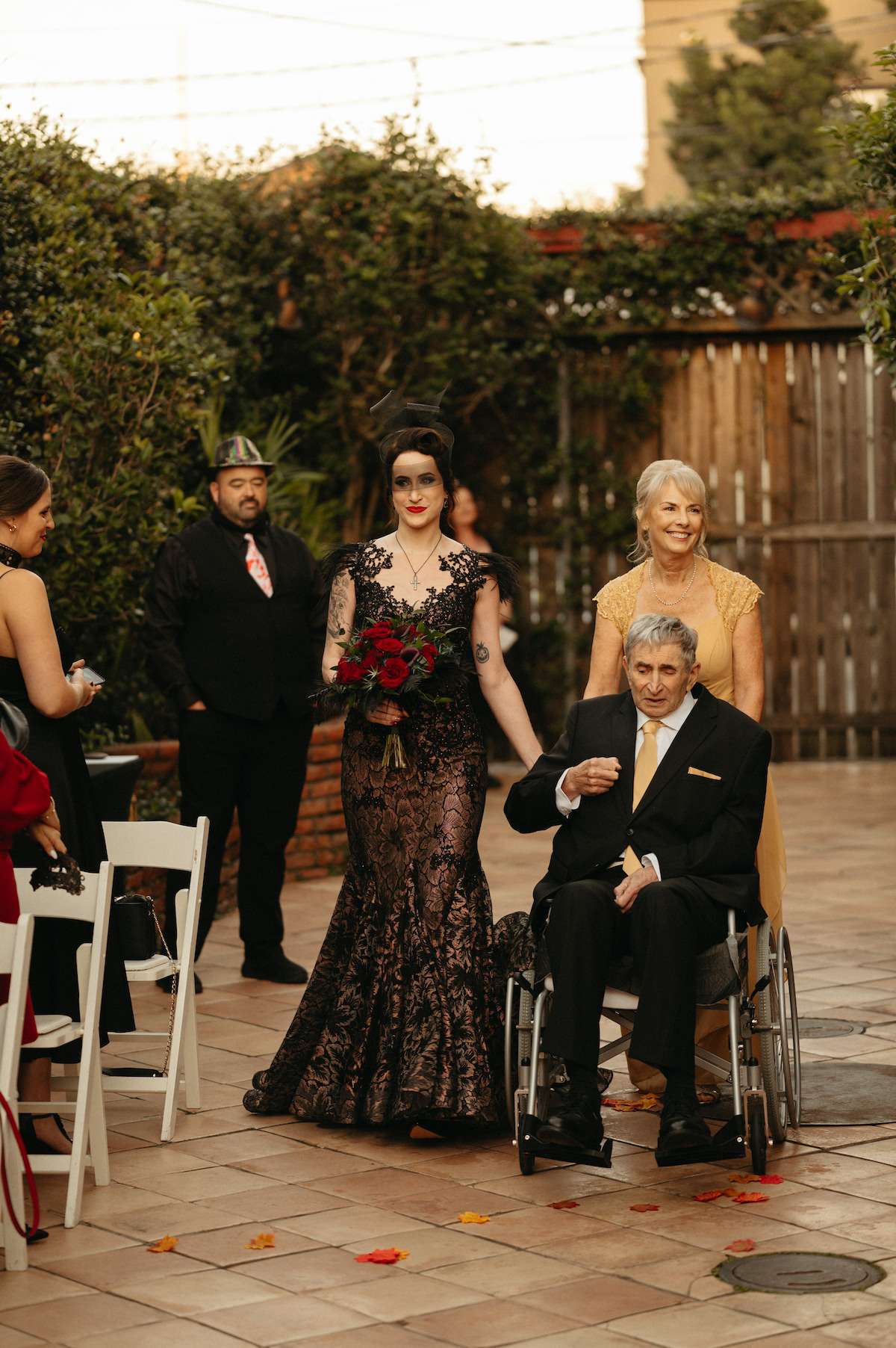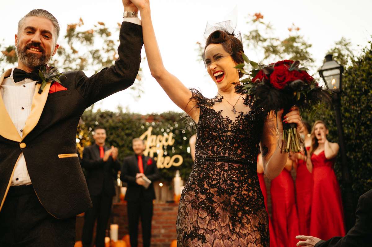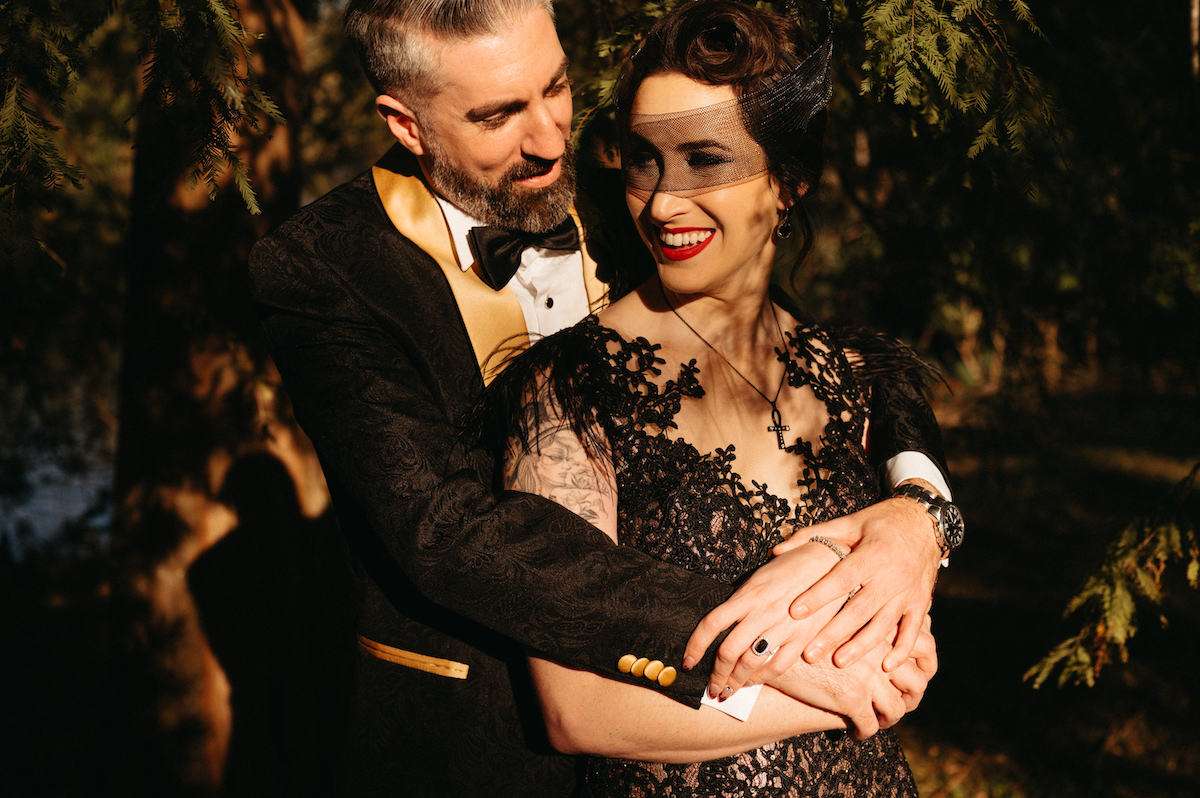 Their friend became ordained so that he could perform the ceremony, and the couple’s vows focused on mutual respect and earthly elements. Jacci continued, “I wrote the ceremony script, including ‘Through their marriage, they will find protection and sanctuary as they journey through life, and through haunting, together’. Our rings exchange was a nod to vows from Tim Burton’s The Corpse Bride. Luke’s step-mom read James Kavanaugh’s poem To Love is Not to Possess, and we lit a spell candle crafted at my favourite shop in Burbank, The Crooked Path.”