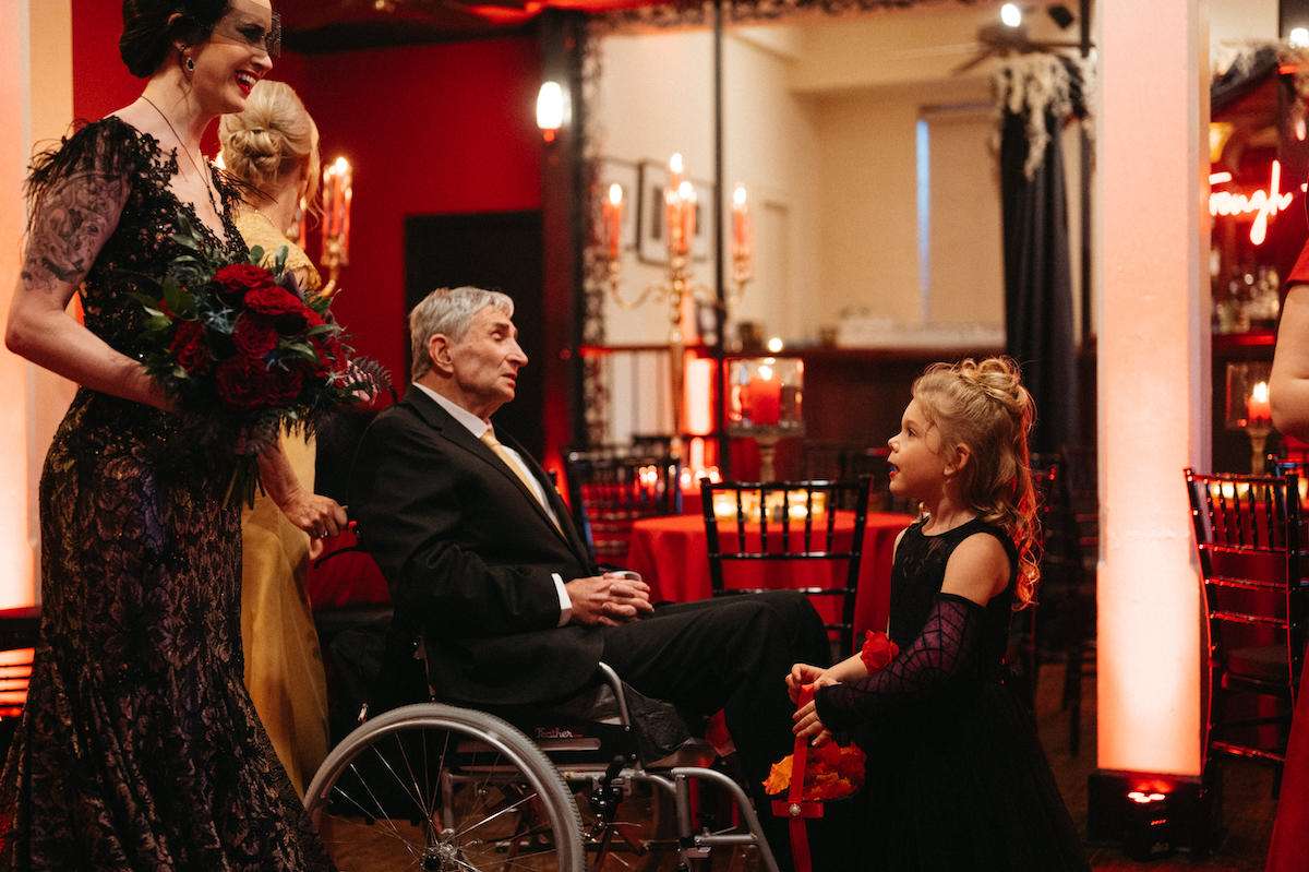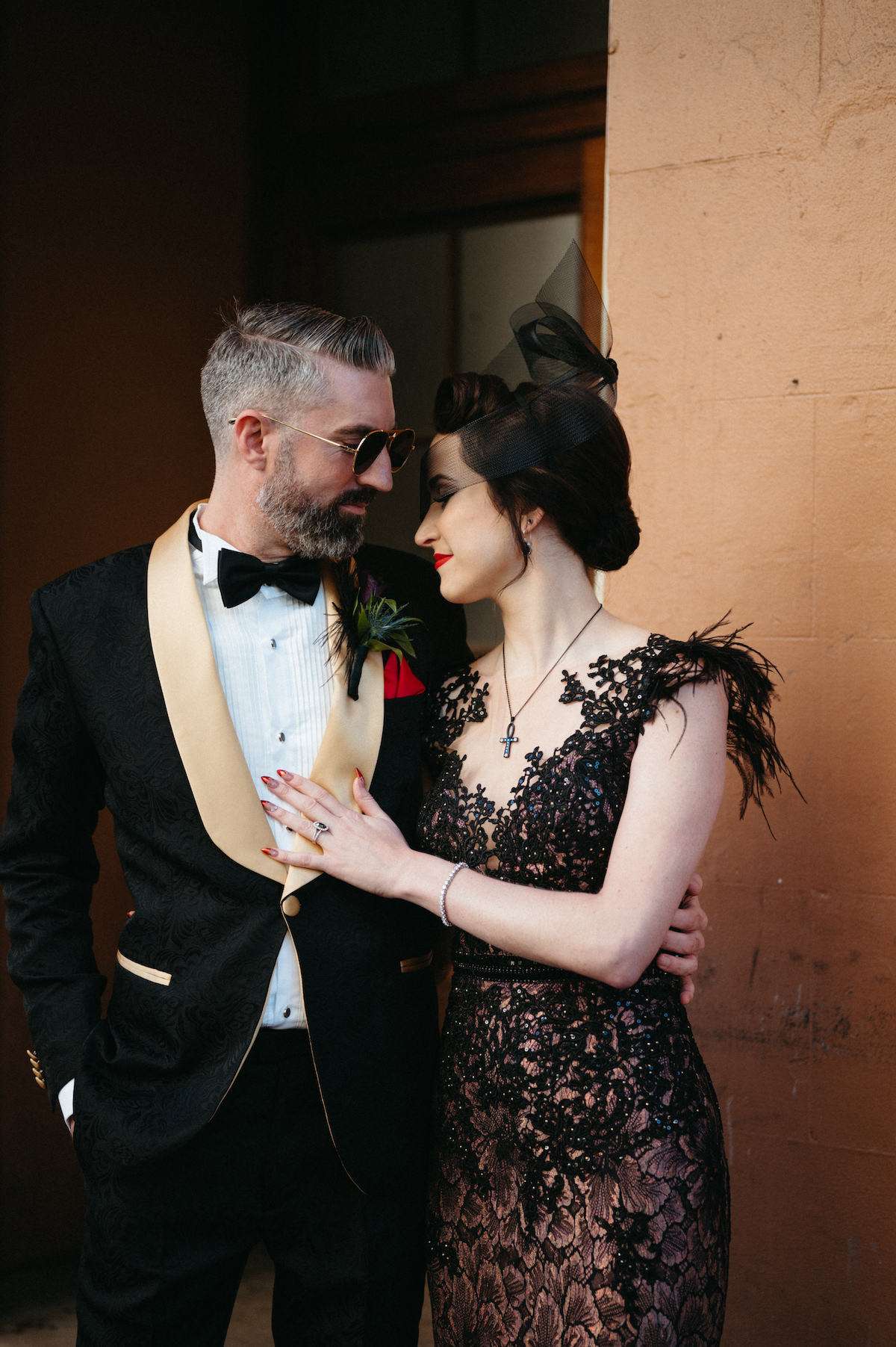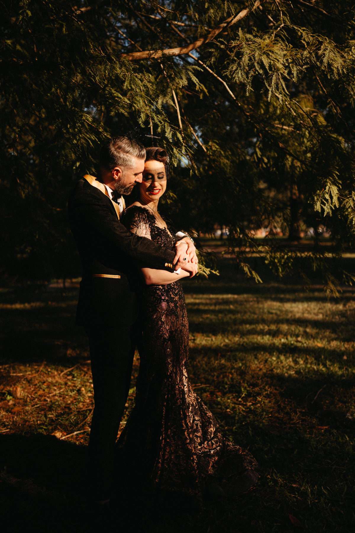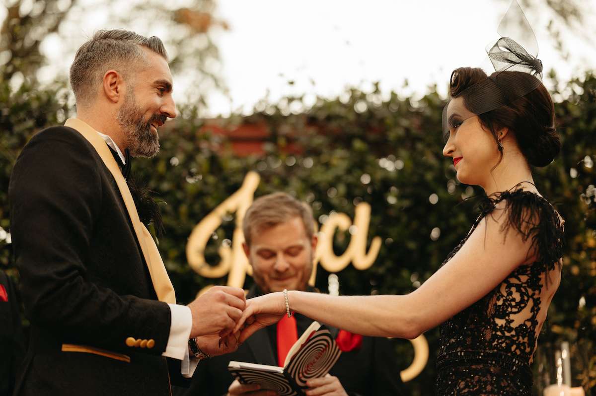 Their friend became ordained so that he could perform the ceremony, and the couple’s vows focused on mutual respect and earthly elements. Jacci continued, “I wrote the ceremony script, including ‘Through their marriage, they will find protection and sanctuary as they journey through life, and through haunting, together’. Our rings exchange was a nod to vows from Tim Burton’s The Corpse Bride. Luke’s step-mom read James Kavanaugh’s poem To Love is Not to Possess, and we lit a spell candle crafted at my favourite shop in Burbank, The Crooked Path.”