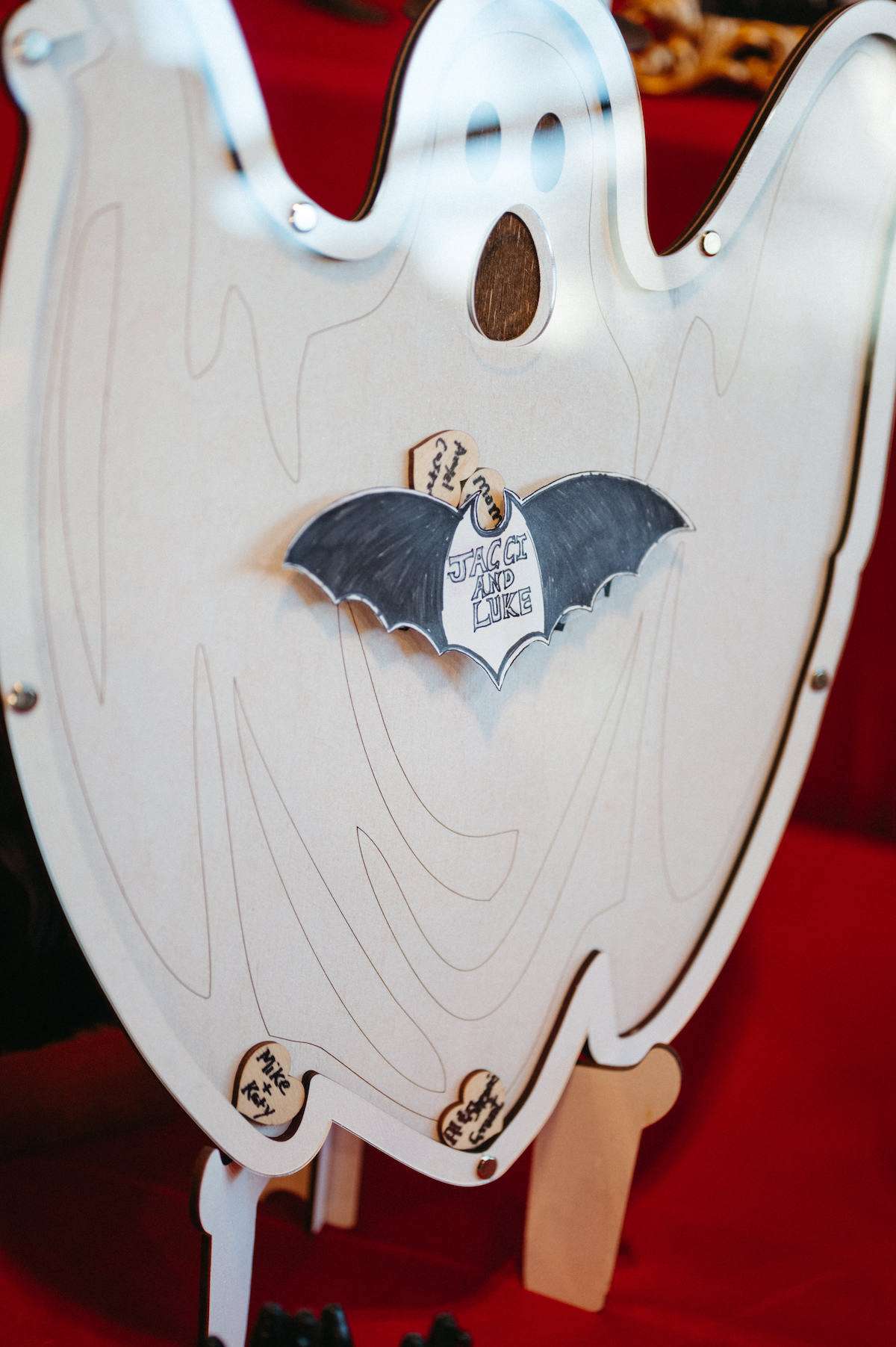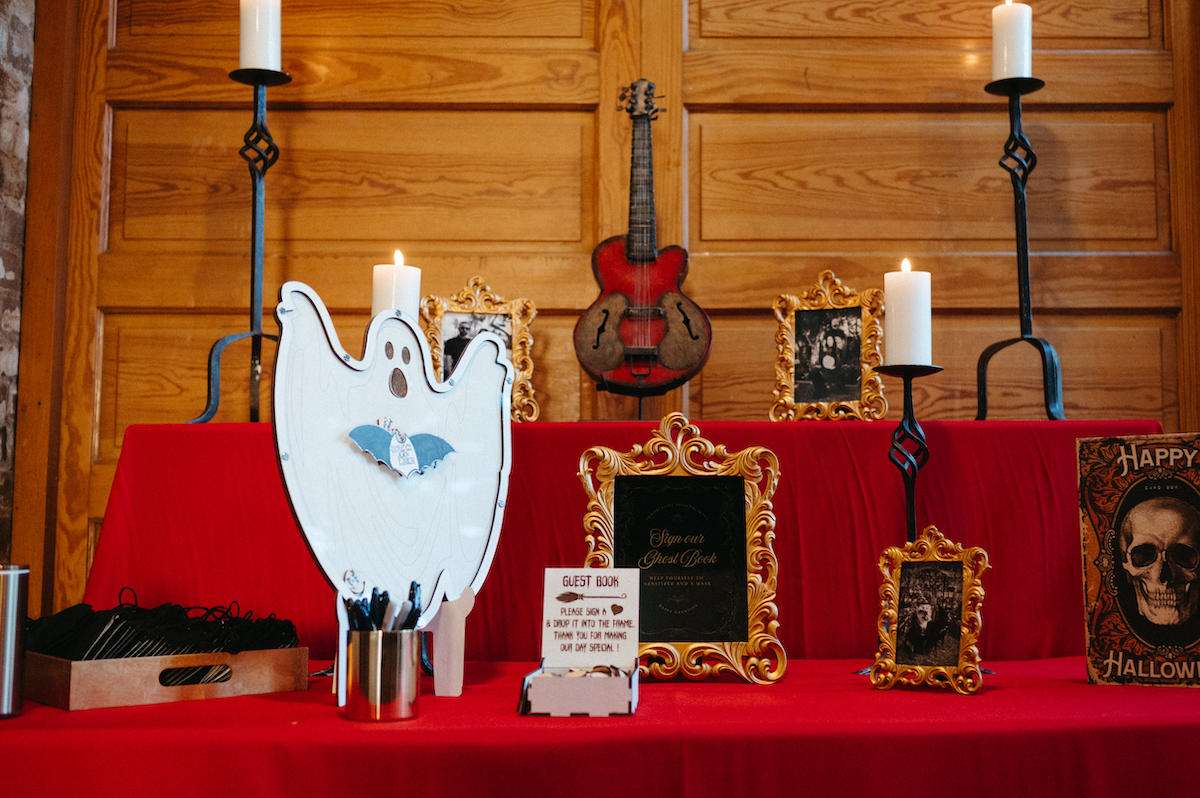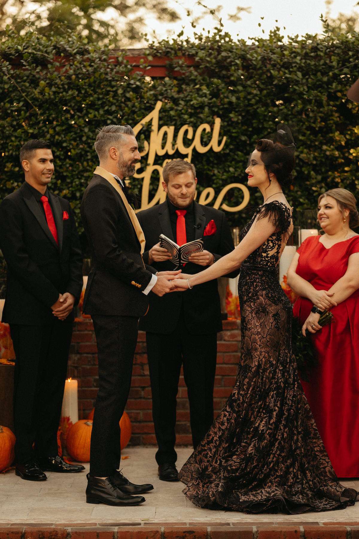 With the Halloween theme firmly embedded in their celebration, they also wanted to incorporate their beliefs, as Jacci explained, “Our nuptial theme for our wedding was Through Haunting. We believe energy continues after passing and ‘Til Death felt final, so wanted to commit beyond that.”