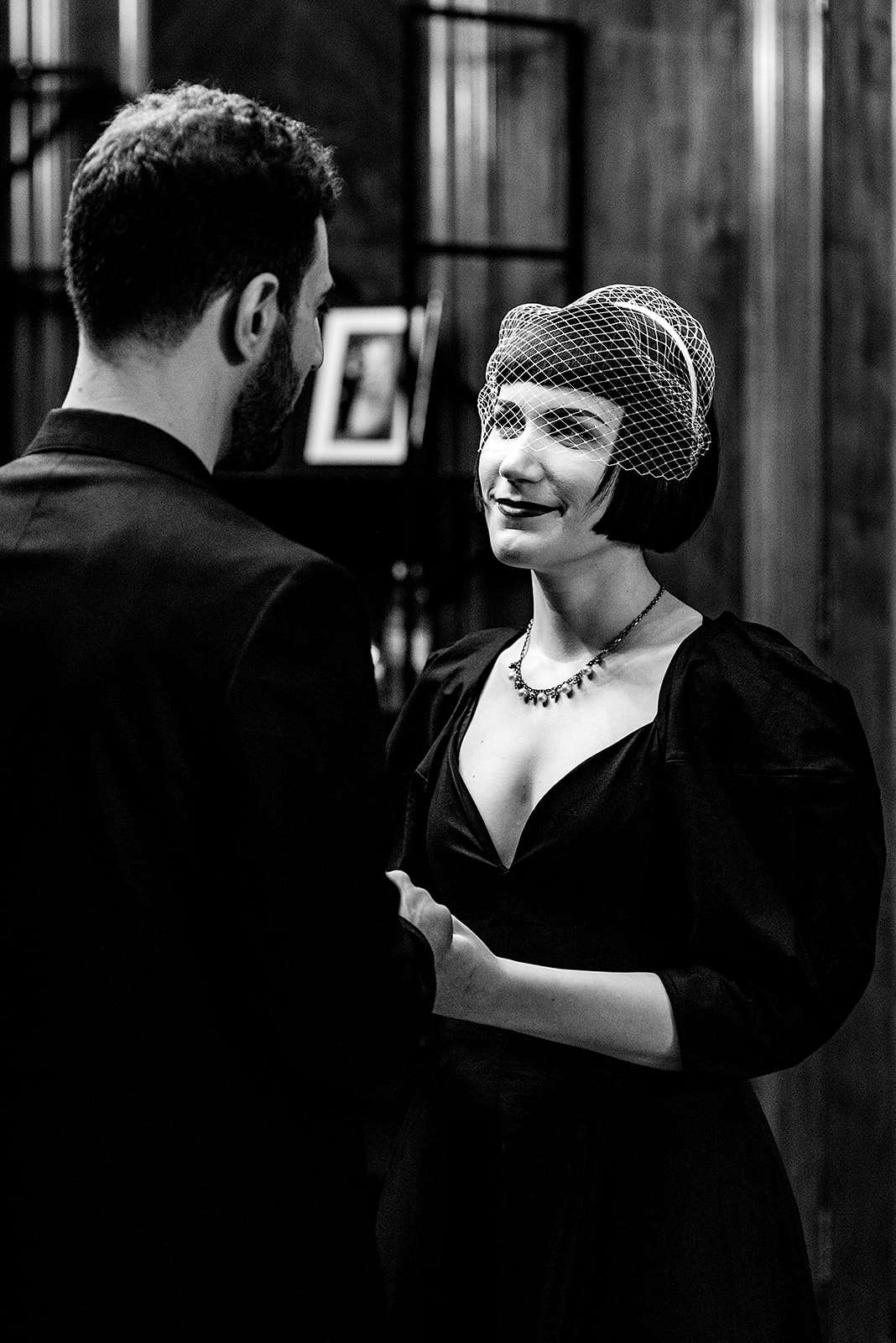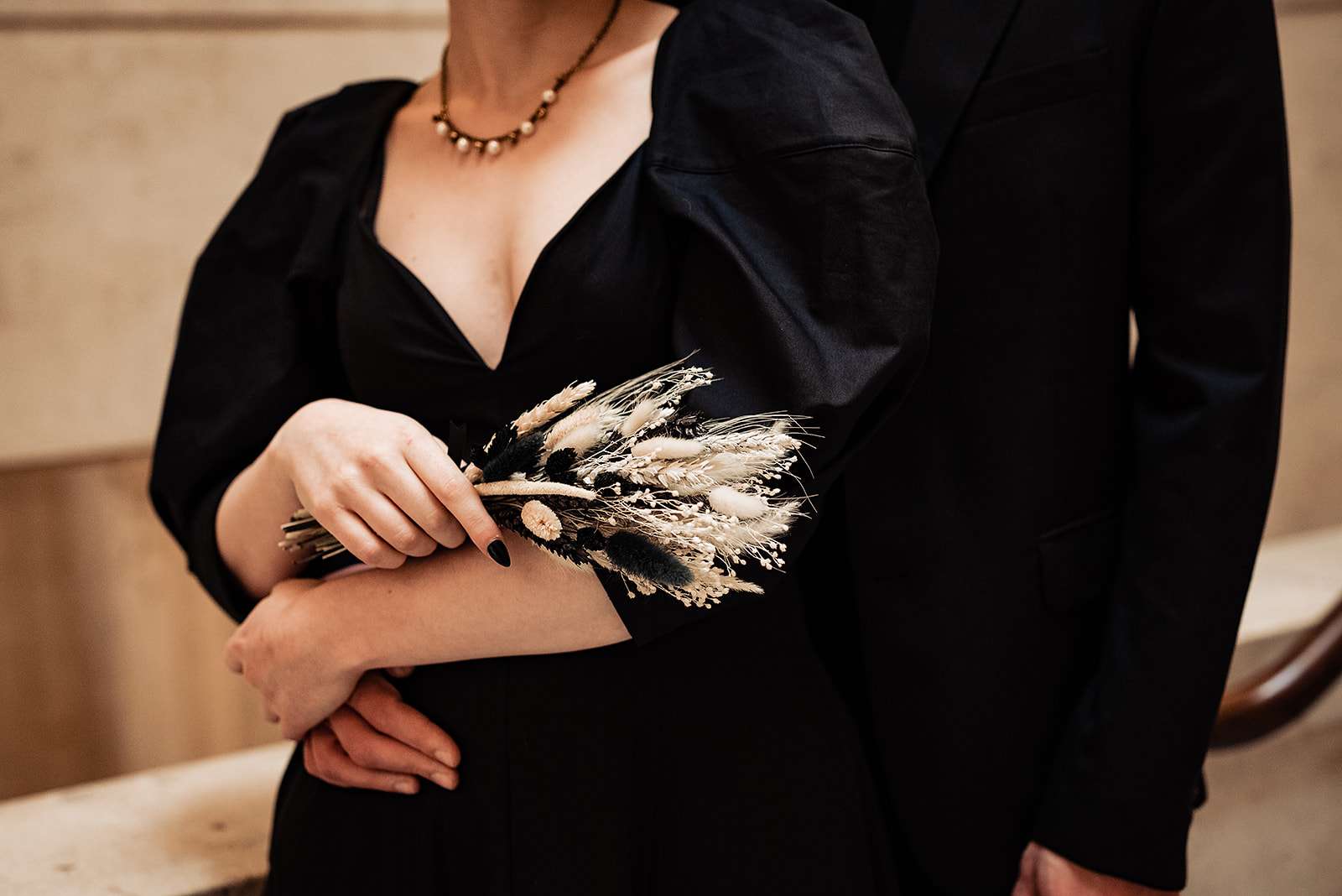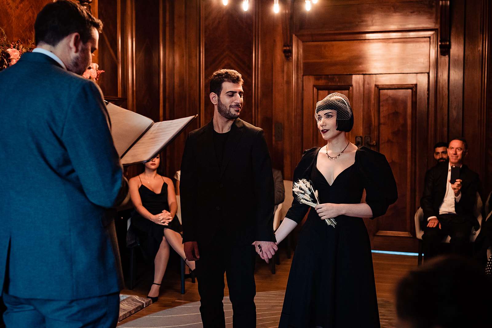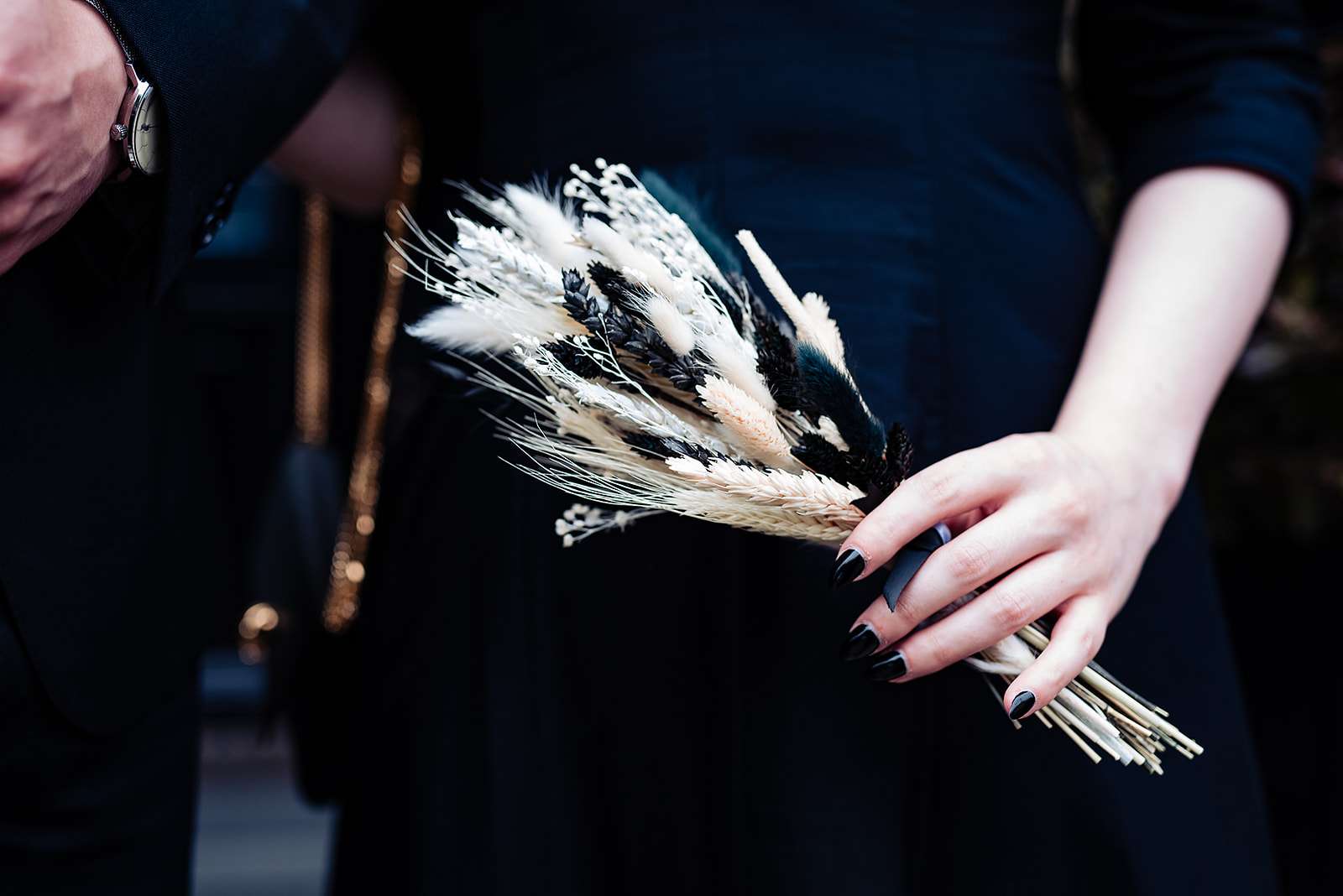 “We had a civil partnership ceremony, which meant we didn’t have to follow any scripts based on tradition that didn’t align with our relationship”, the bride told us. “We organised everything within a month and we only picked the music the morning of the ceremony! For the entrance we had I’ll Follow You into the Dark by Death Cab for Cutie, and for the signing we had Dance of the Dream Man from Twin Peaks (a favourite show of ours). The ceremony was super quick because we didn’t want any vows or readings, we ended up cutting a lot of the script off.”
