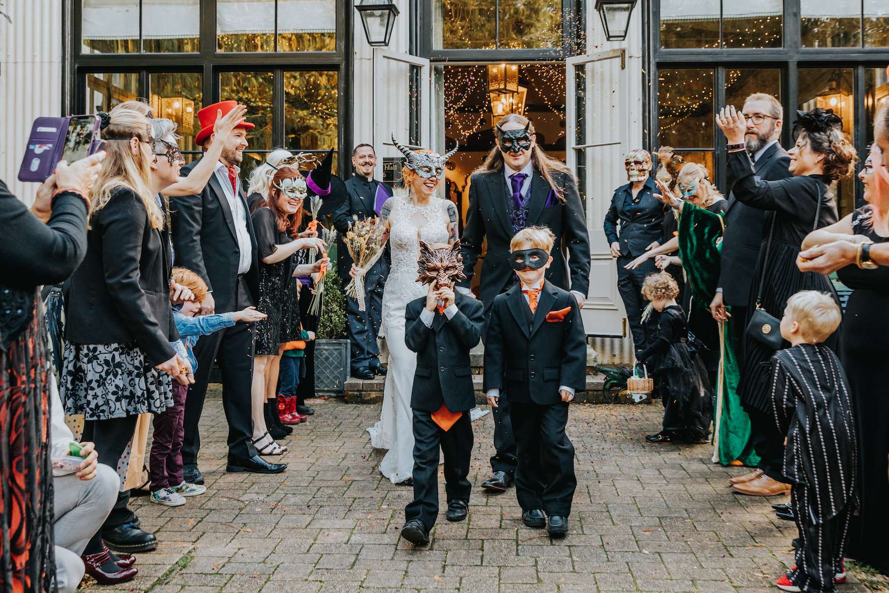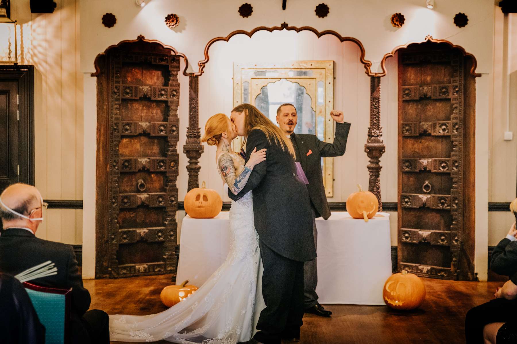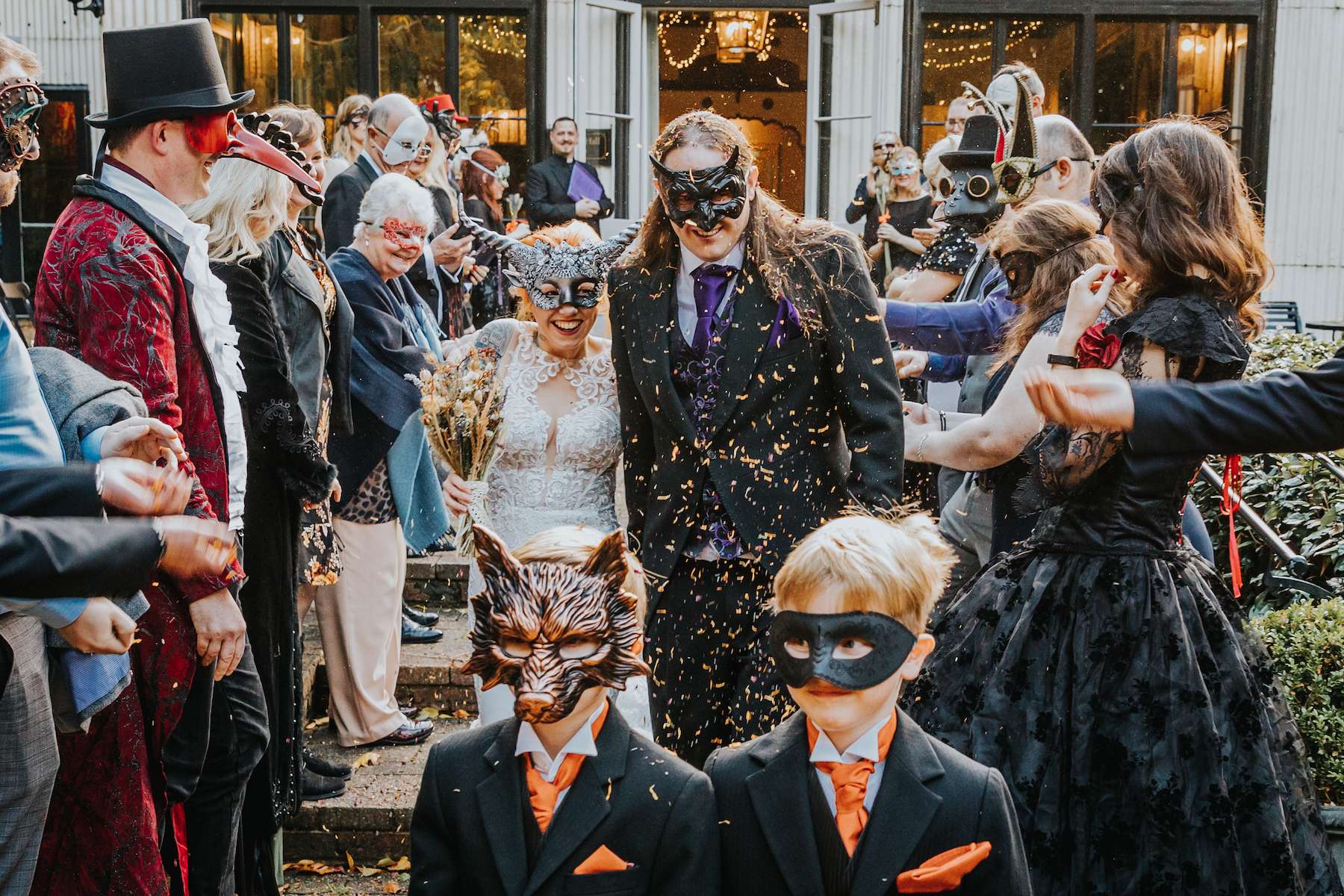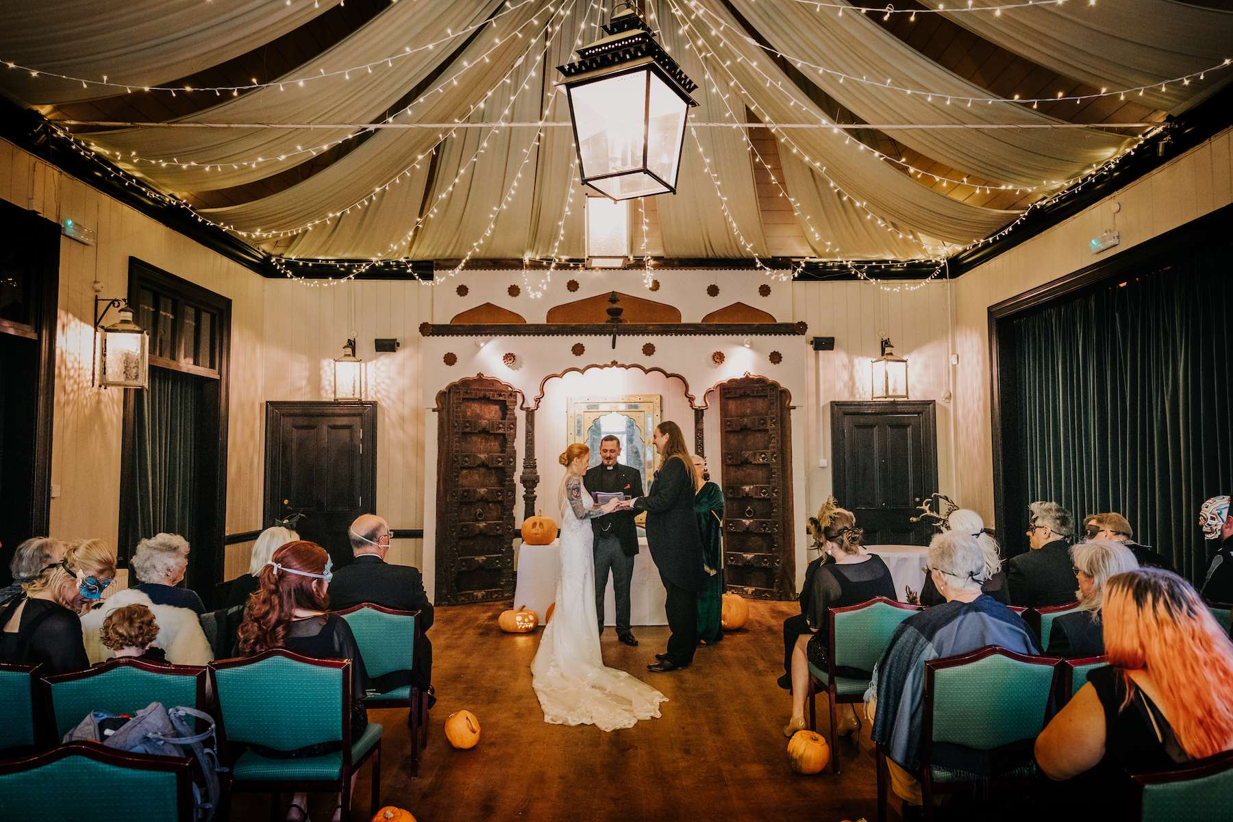 With all the guests in costume and a showing of Rocky Horror Picture Show, Lea and Mazz embraced a Halloween theme for their wedding. They had masquerade masks for their aisle walk and an autumnal colour scheme.