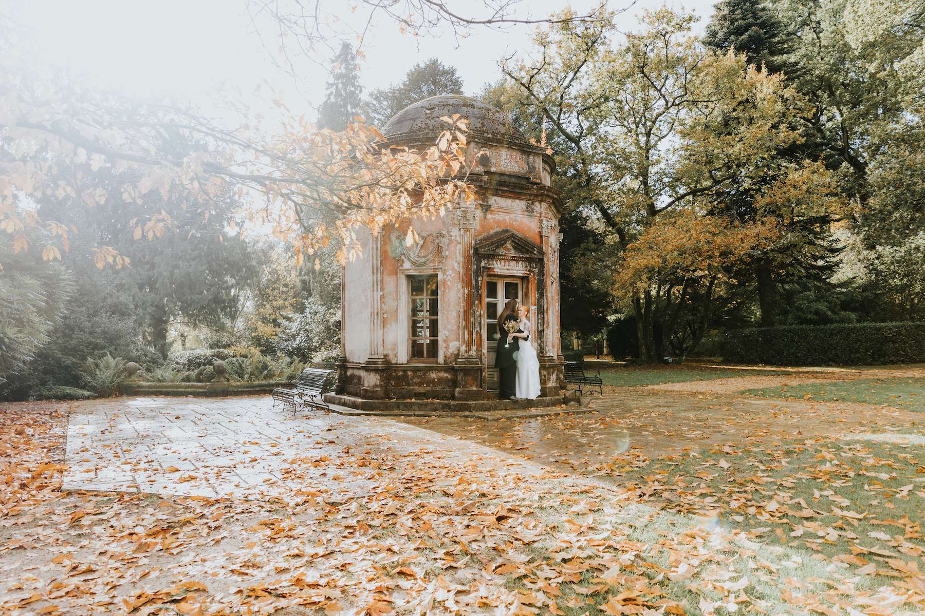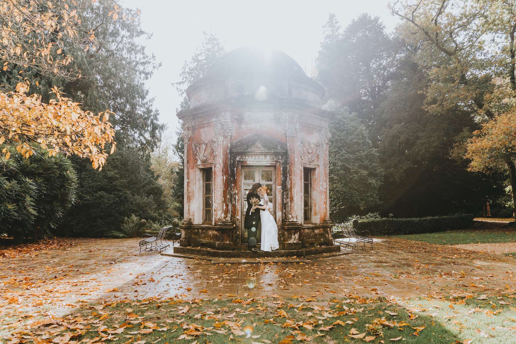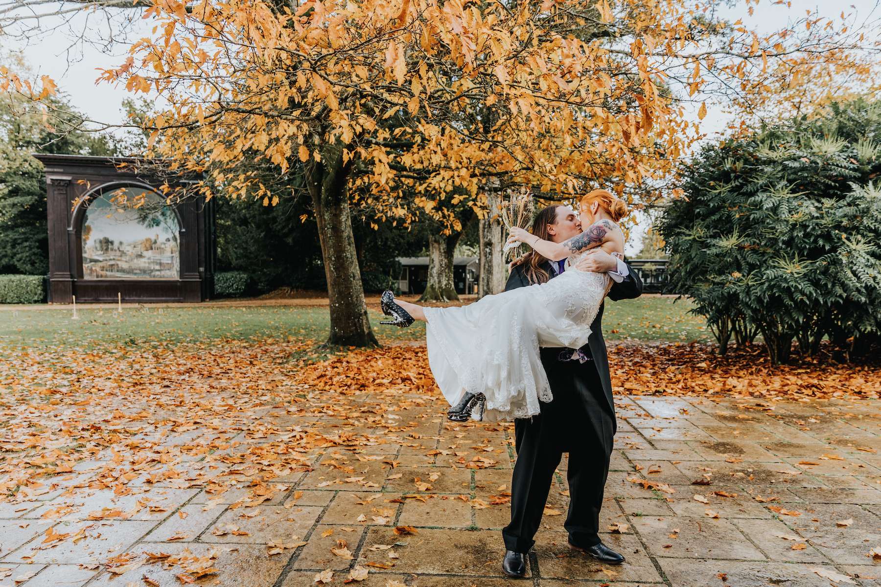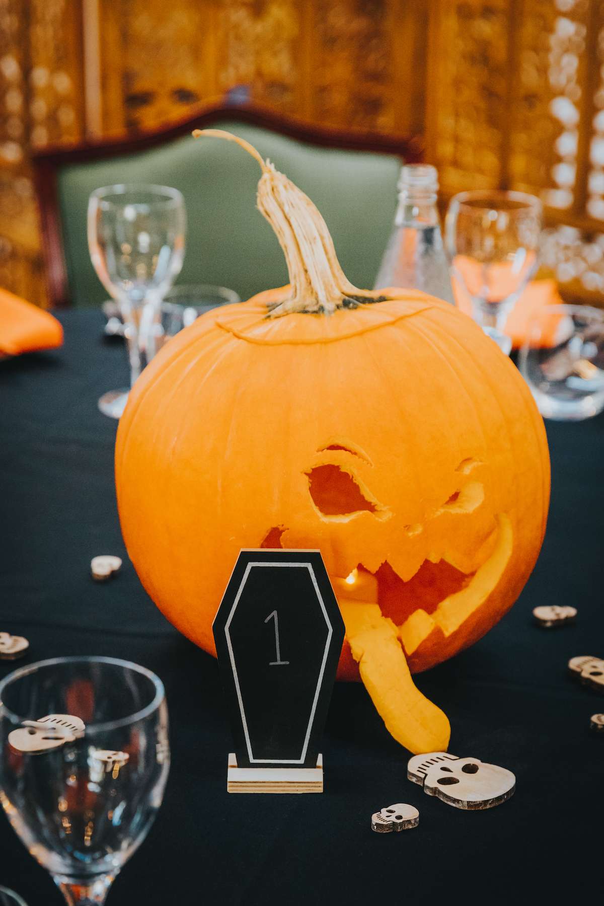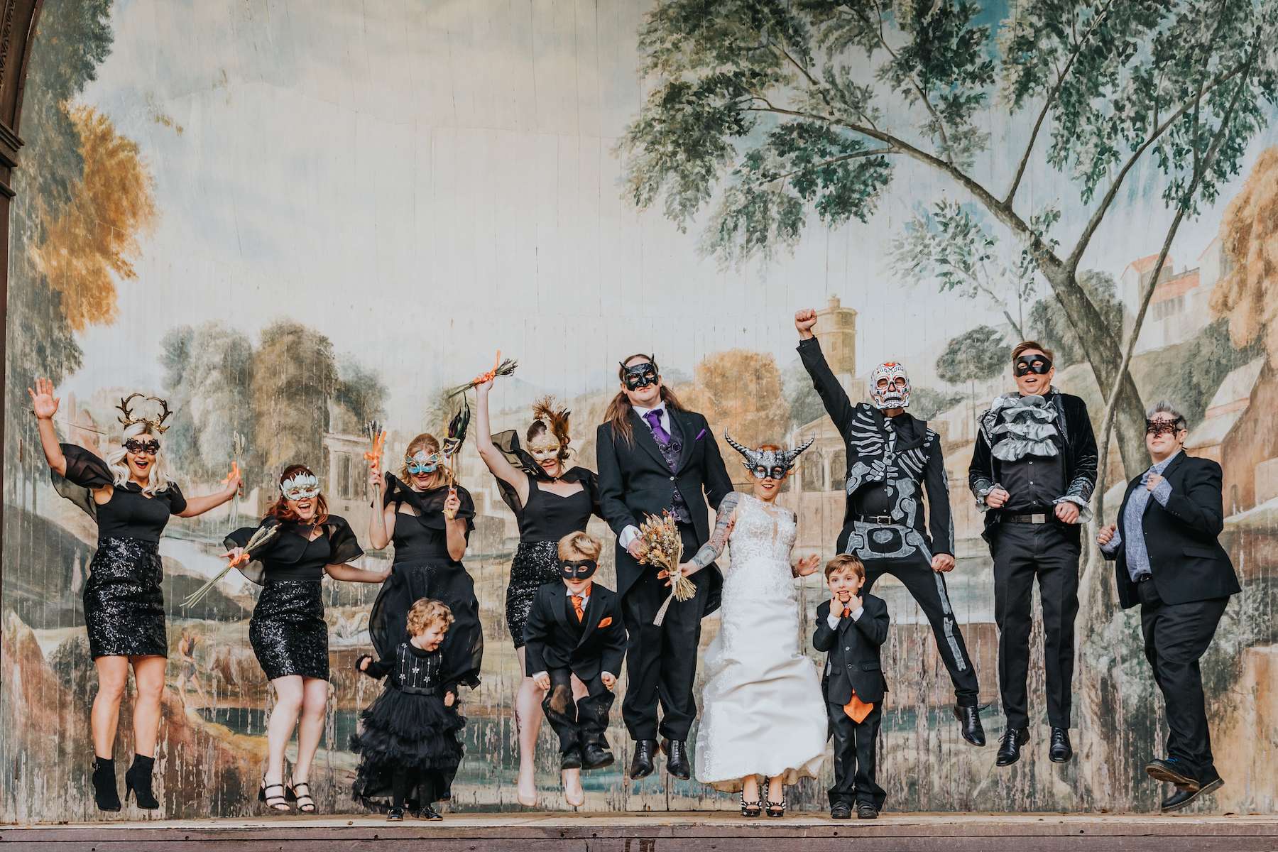 With all the guests in costume and a showing of Rocky Horror Picture Show, Lea and Mazz embraced a Halloween theme for their wedding. They had masquerade masks for their aisle walk and an autumnal colour scheme.
