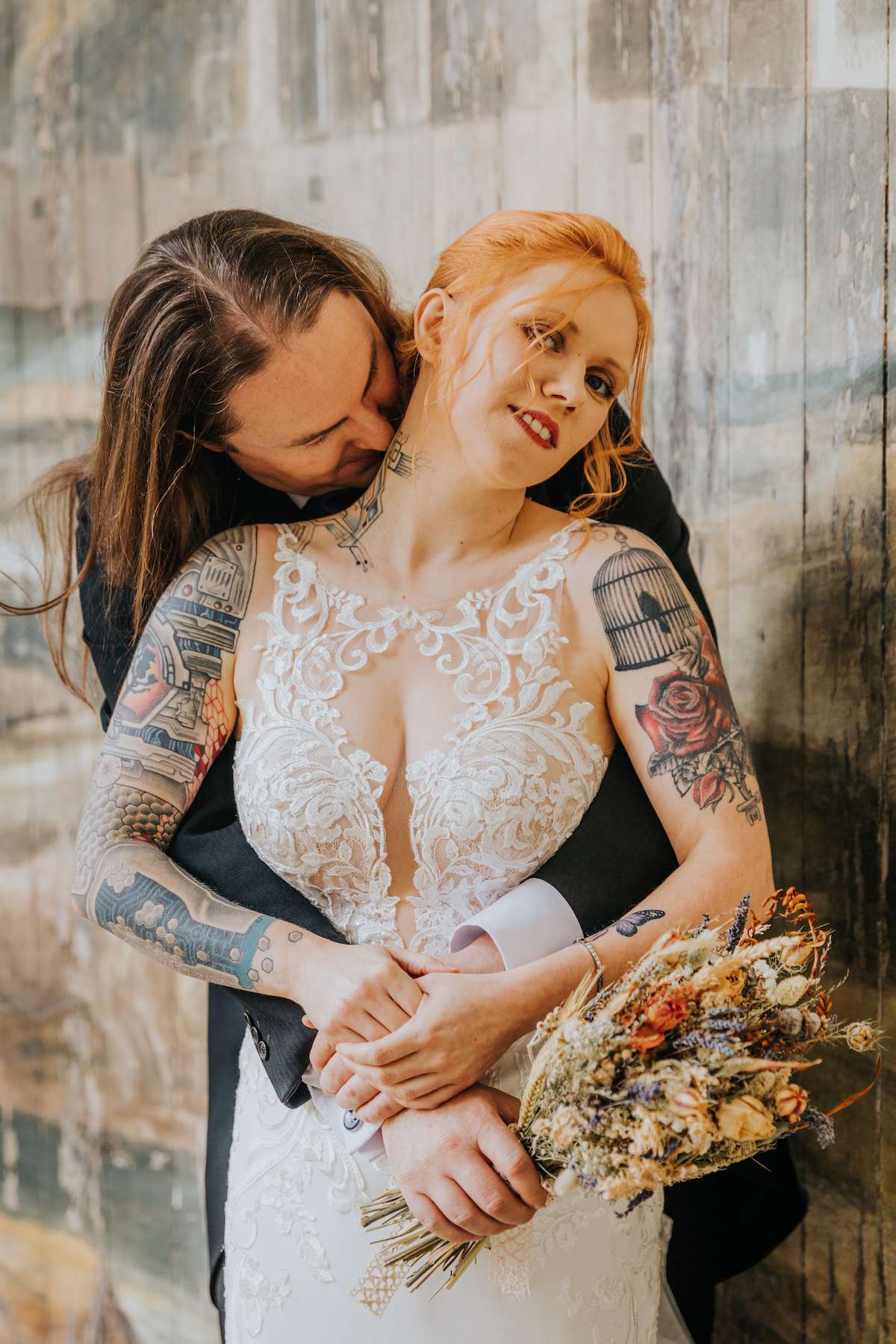 The couple had two ceremonies; a legal one and a personal ceremony with their celebrant. With a quick, last minute change of venue for the legal bit, Lea and Mazz focused on their ‘big’ ceremony. Lea told us, “I walked down the aisle to Raise Hell by Dorothy, with our youngest son in his wolf mask and the wedding coven of bridesmaids and our flower girl. The bridesmaids performed a circle blessing and elemental blessing. We both wrote our own vows – Mazz’s vows were themed on lyrics to my favourite songs.”