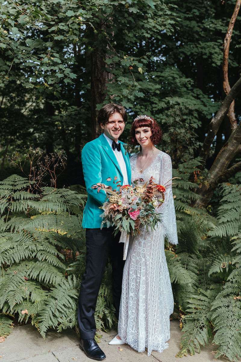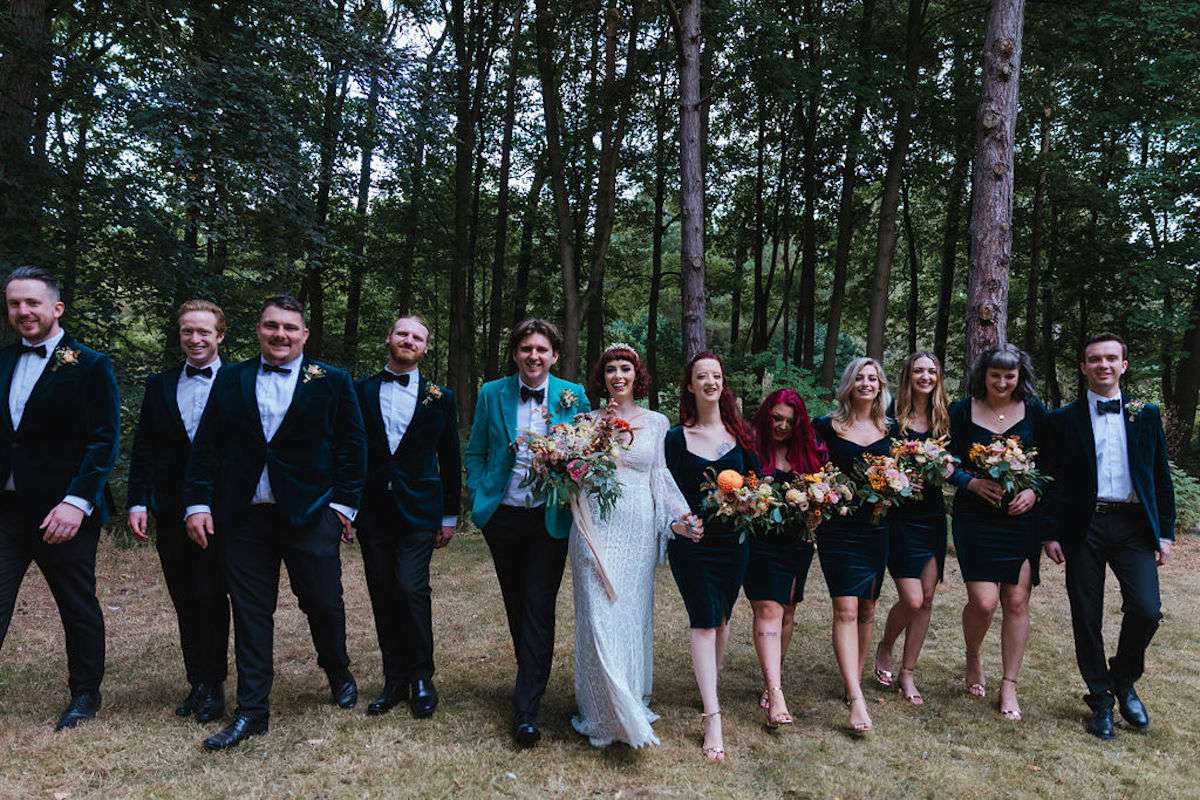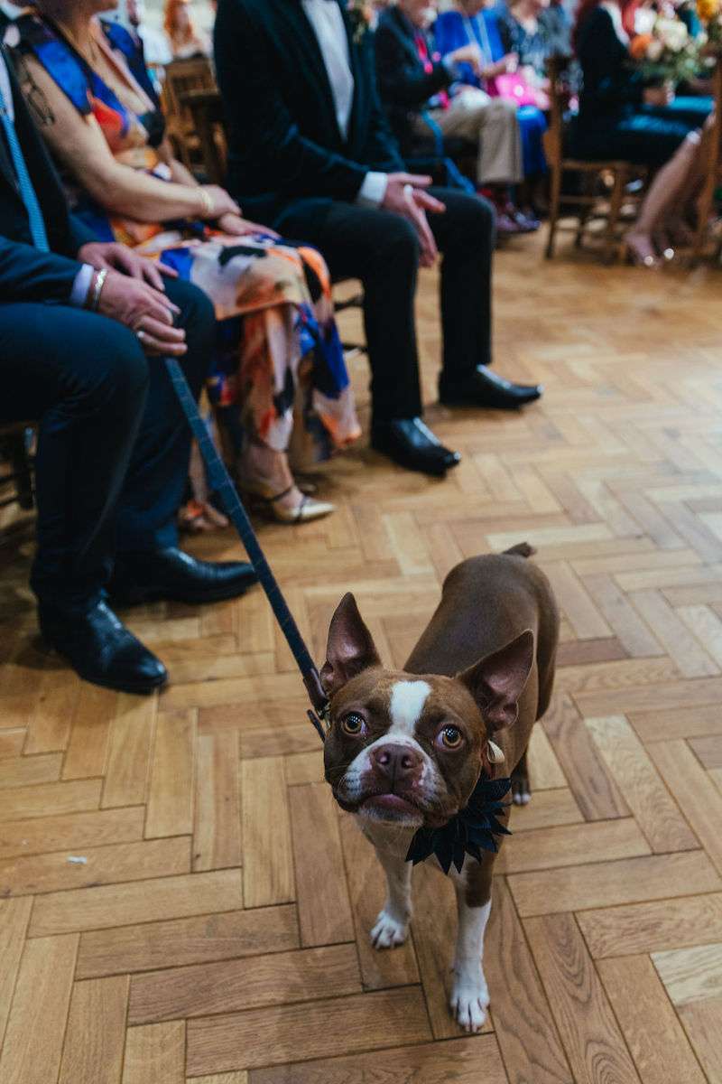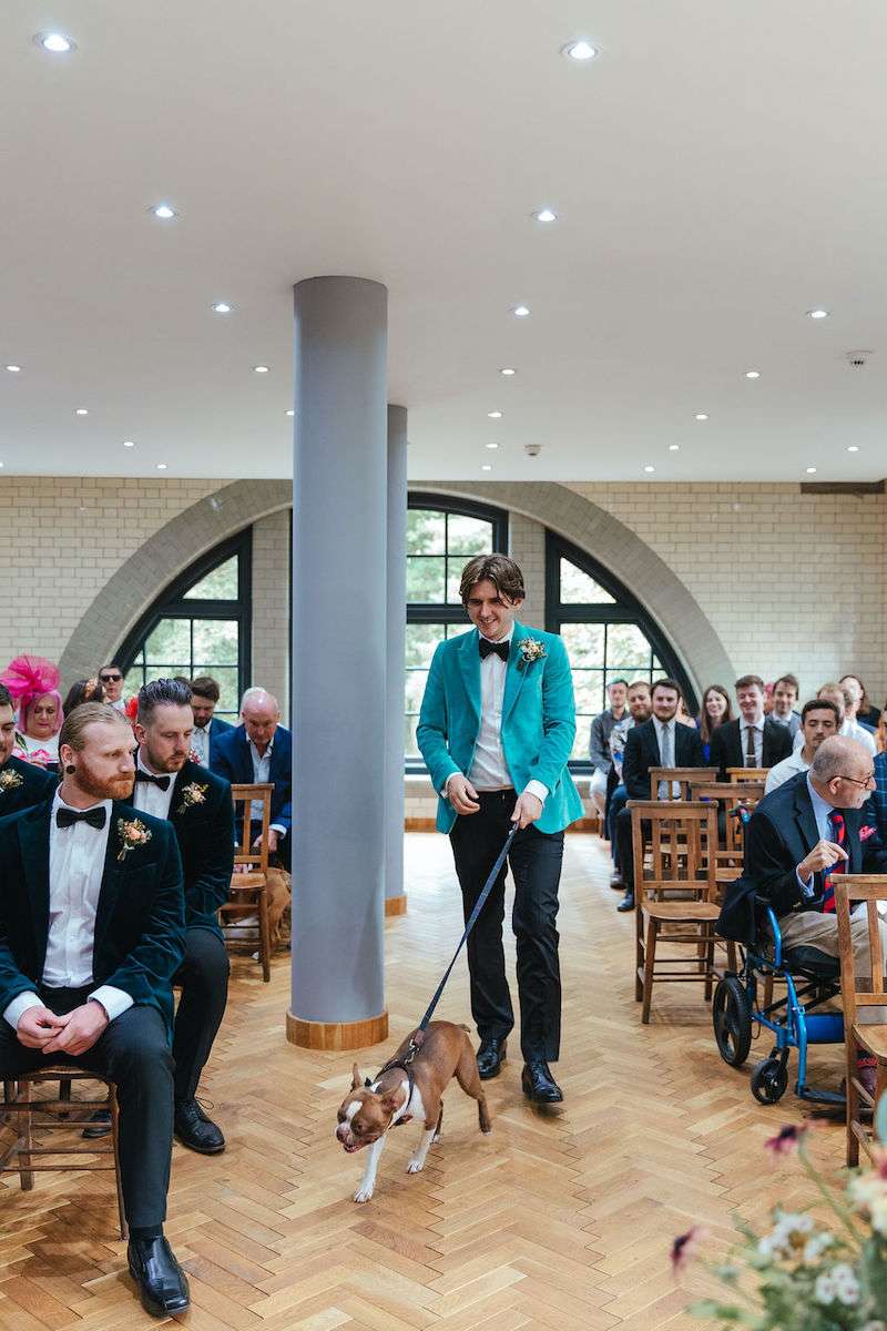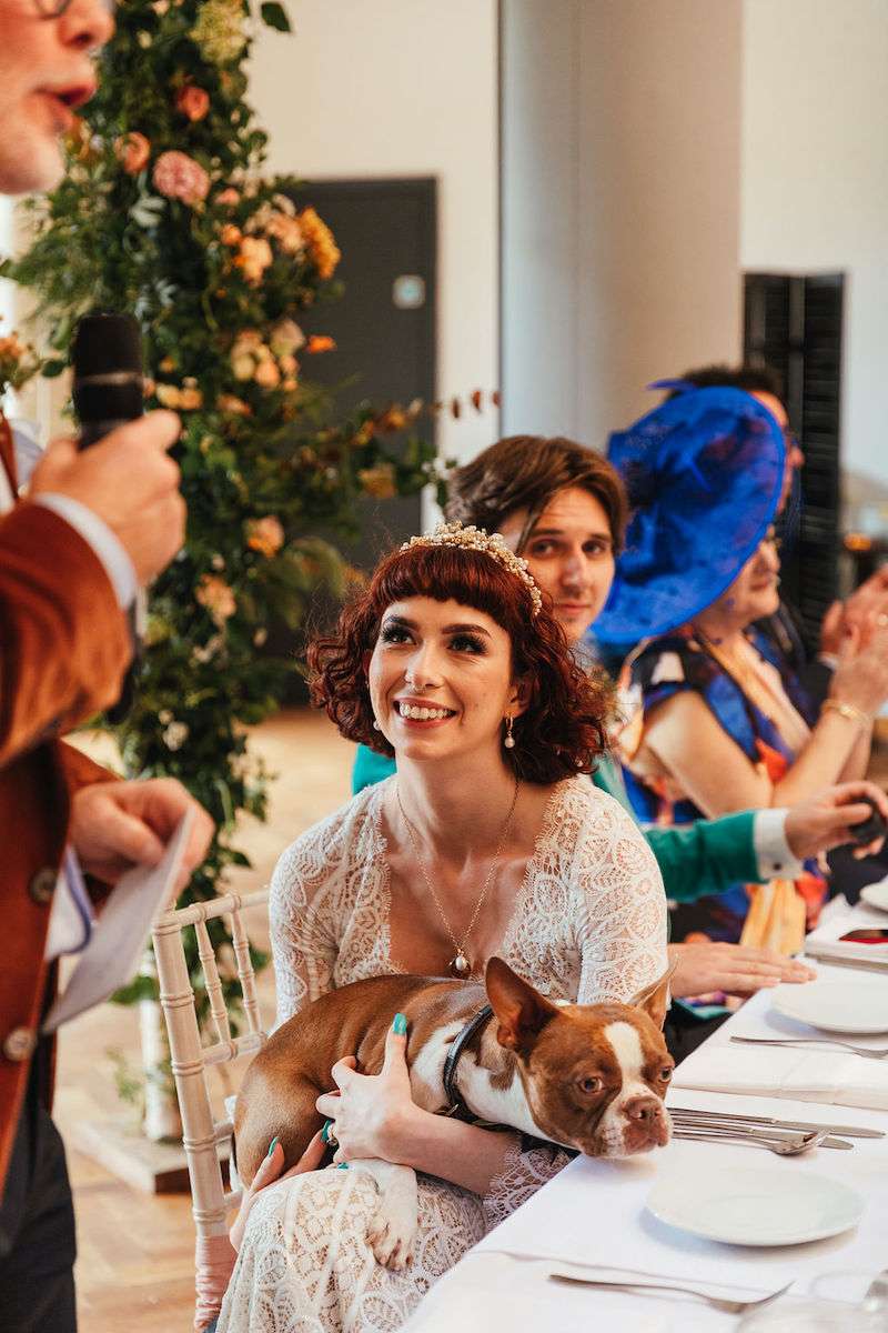 Vincent the dog was the main attraction of Imogen and George’s wedding, getting involved in the ceremony and being the best boy throughout the day! Their wedding was filled with colour, amazing outfits, big florals and dark velvet bridesmaids’ dresses. They were inspired be Fleetwood Mac (Stevie Nicks in particular) for their outfits, and wanted a general boho vibe throughout.