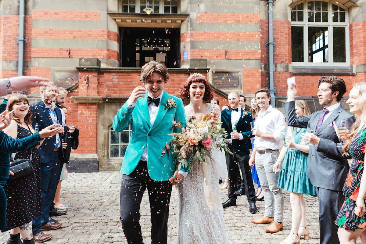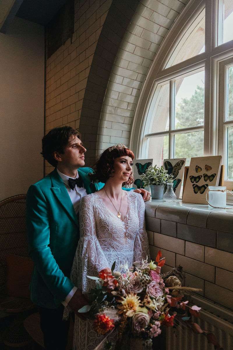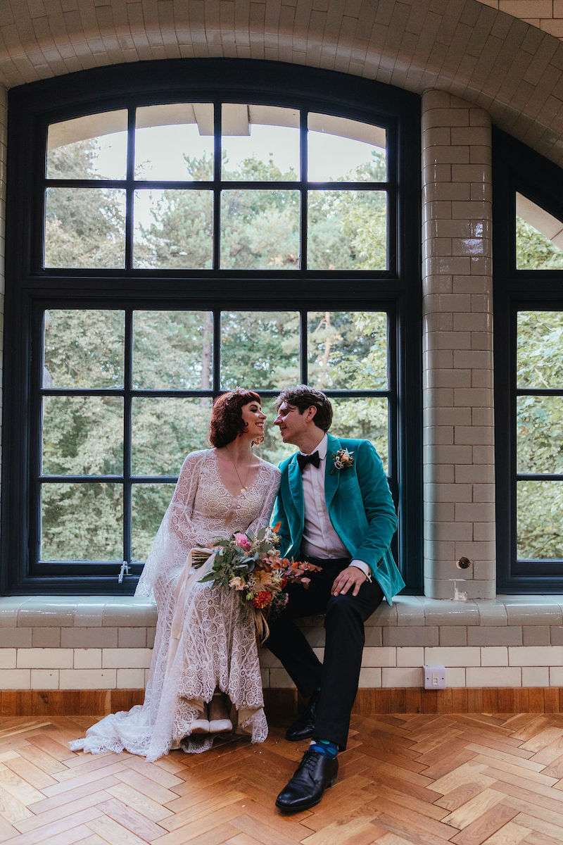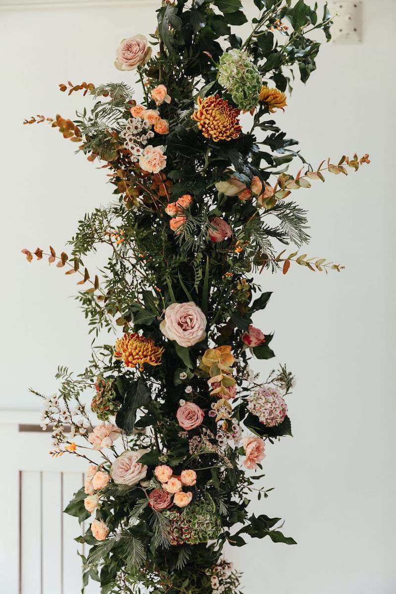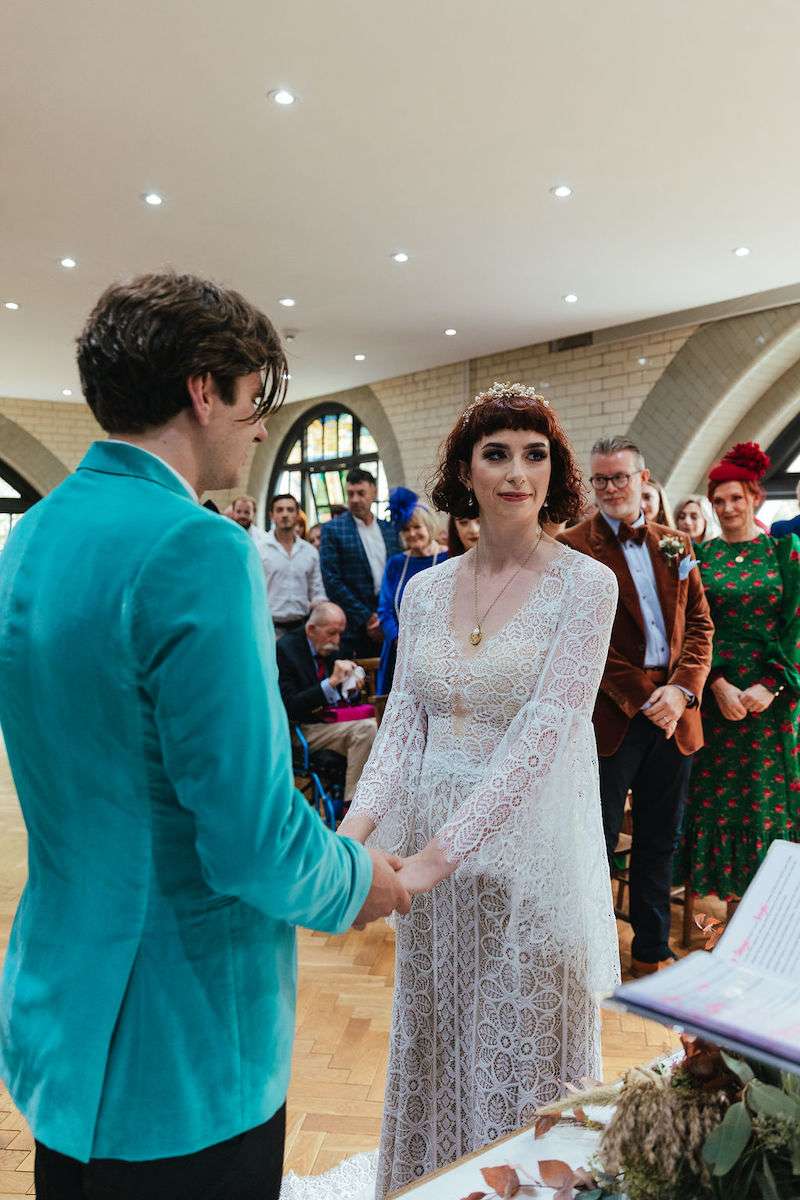 Vincent the dog was the main attraction of Imogen and George’s wedding, getting involved in the ceremony and being the best boy throughout the day! Their wedding was filled with colour, amazing outfits, big florals and dark velvet bridesmaids’ dresses. They were inspired be Fleetwood Mac (Stevie Nicks in particular) for their outfits, and wanted a general boho vibe throughout.