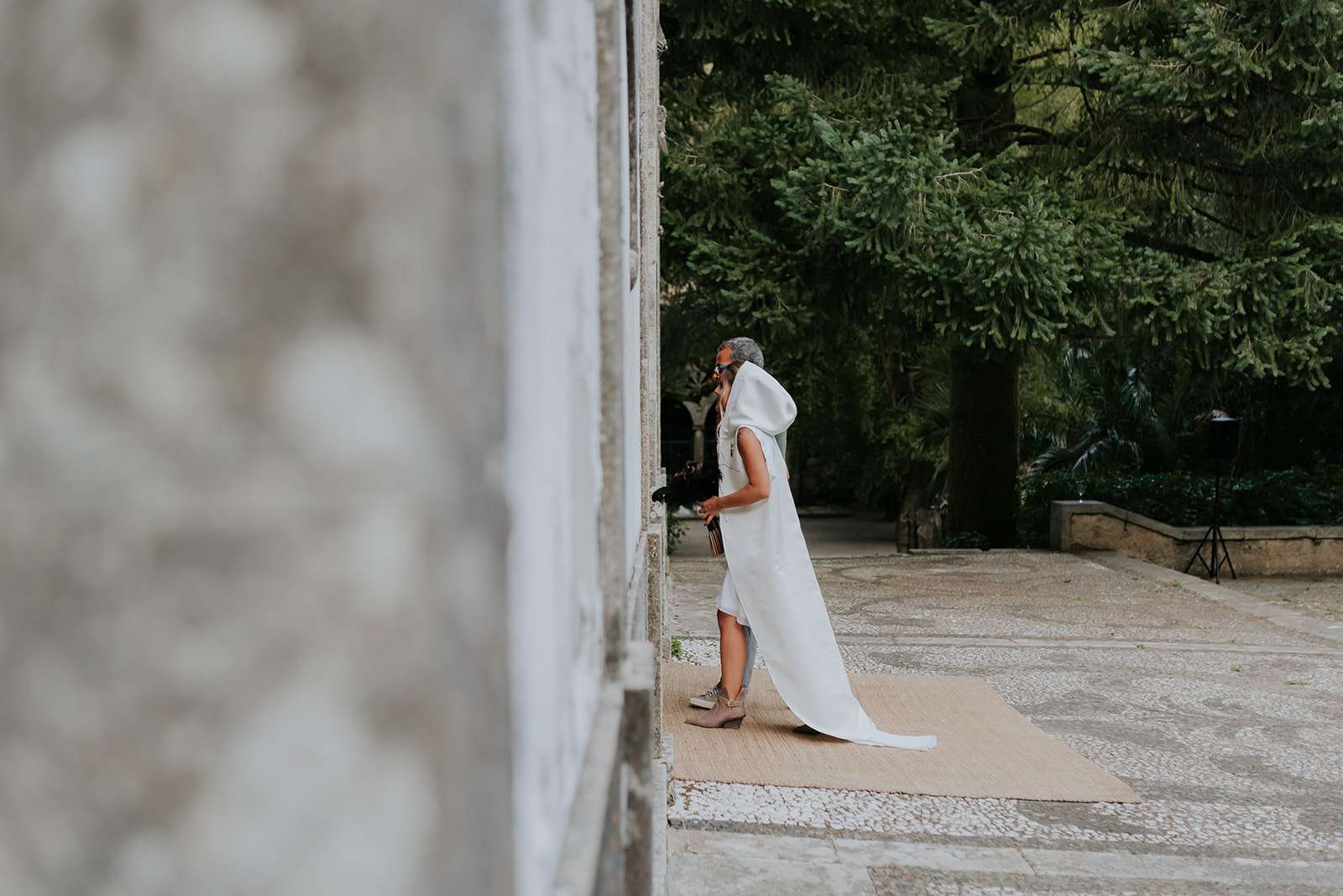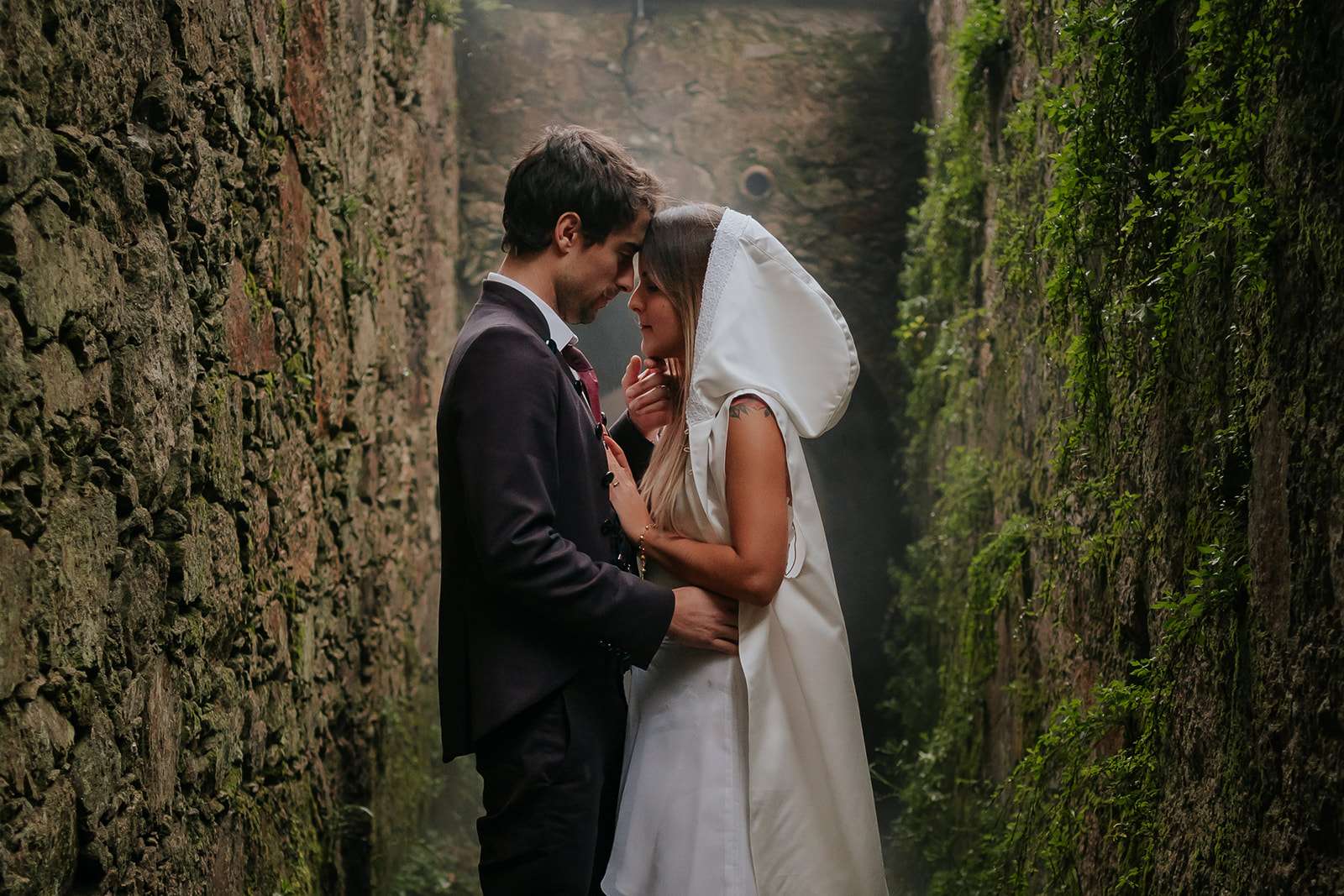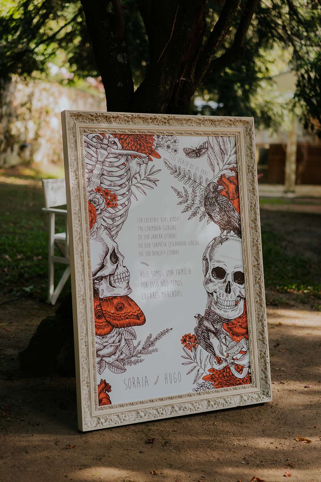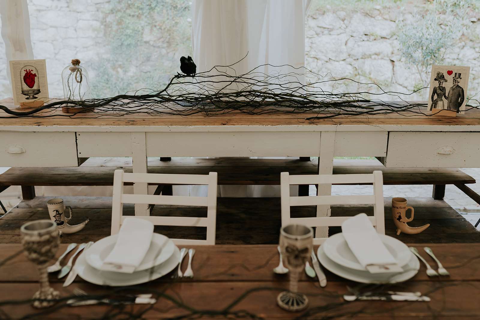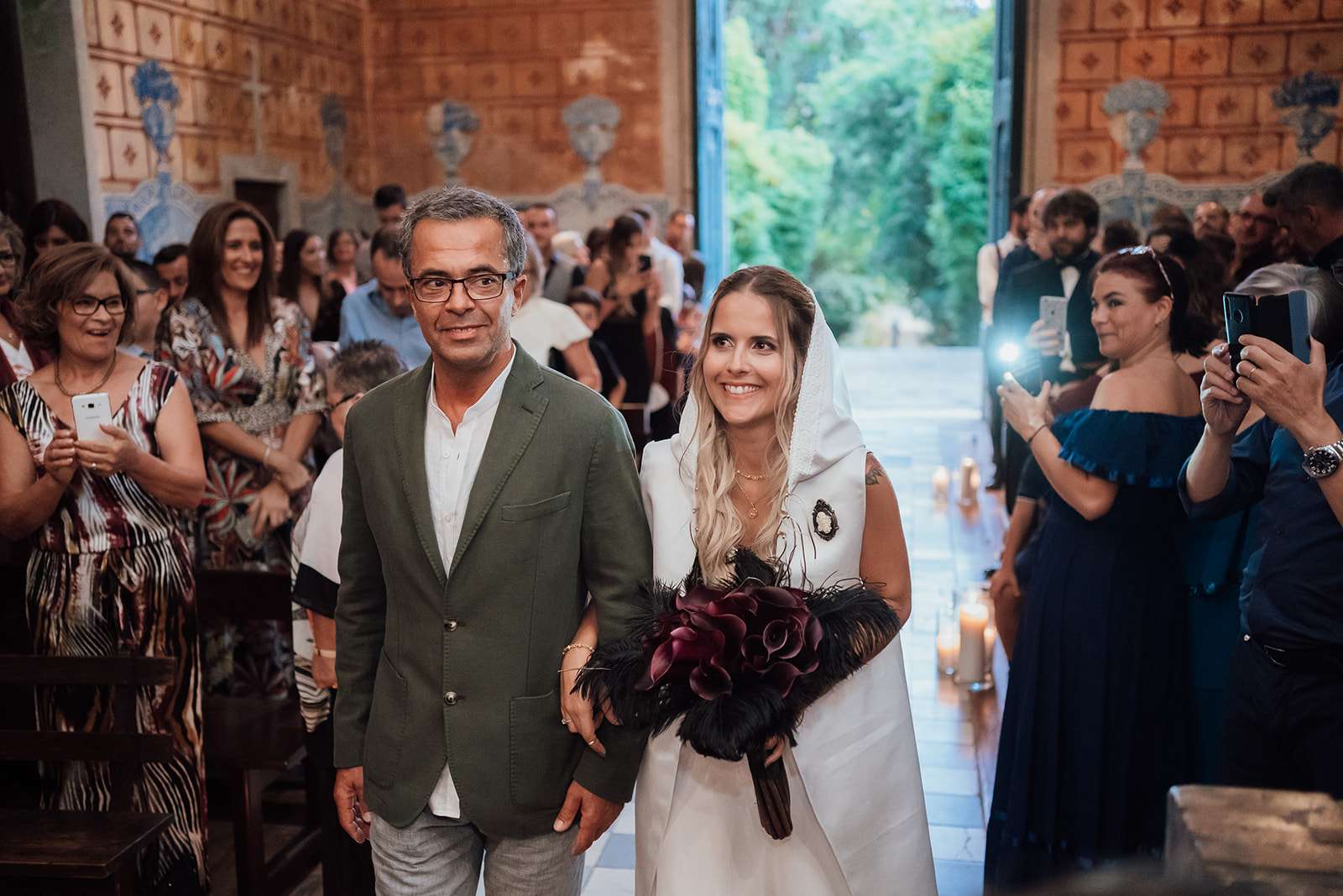Soraia and Hugo’s dark and spooky wedding was held on Friday 13th in Oliveira de Azeméis, Portugal. Although they didn’t have really specific inspiration or references they went back to when pulling together the theme, they wanted it to be dark, yet meaningful to them. The bride wore her mother’s wedding dress, for example, which she had altered into her own style including adding a hooded cape!