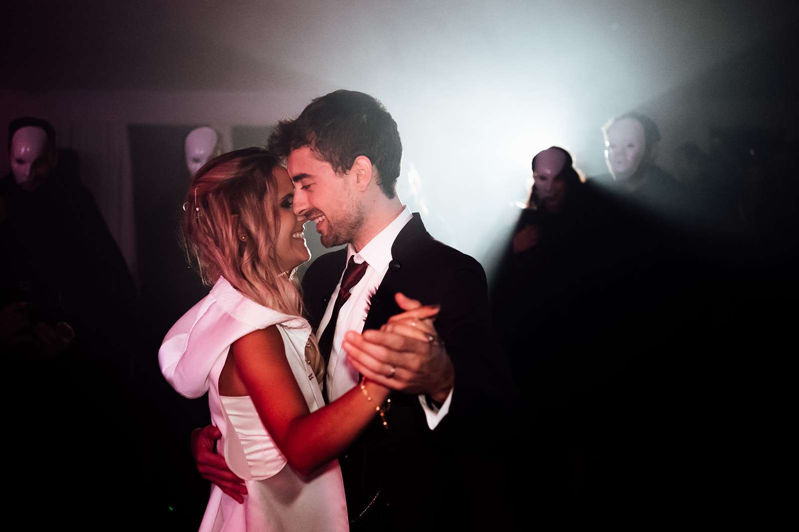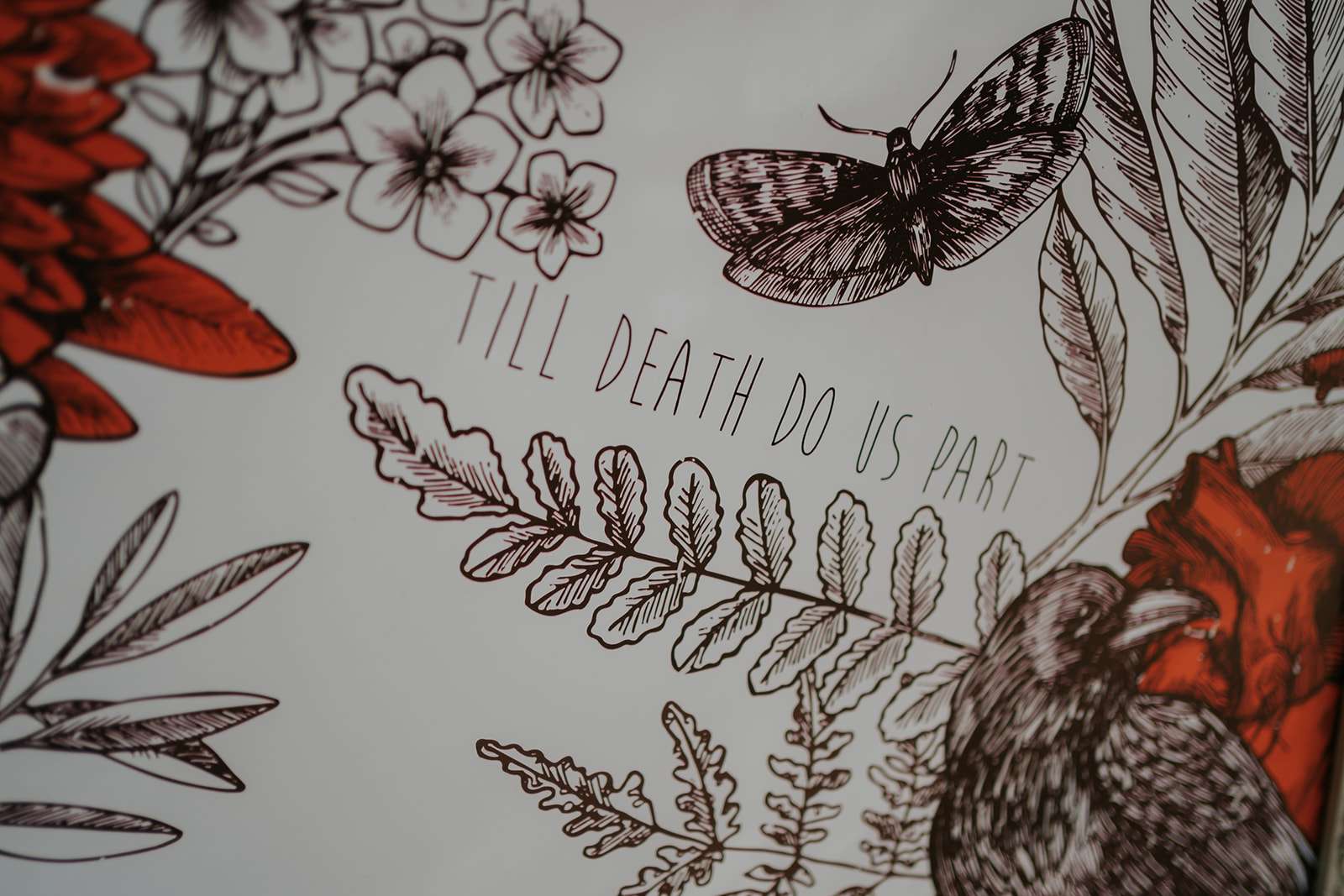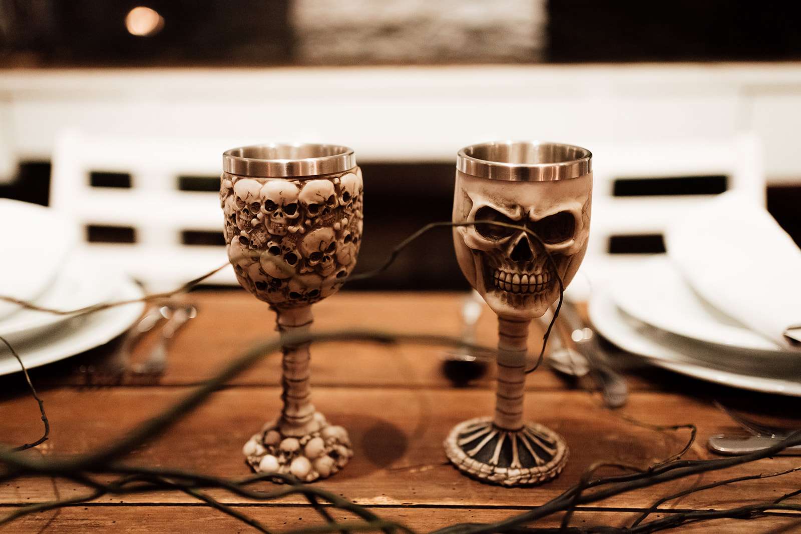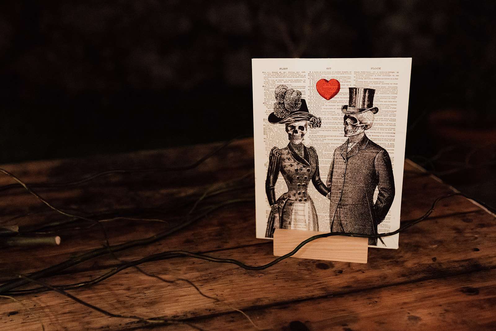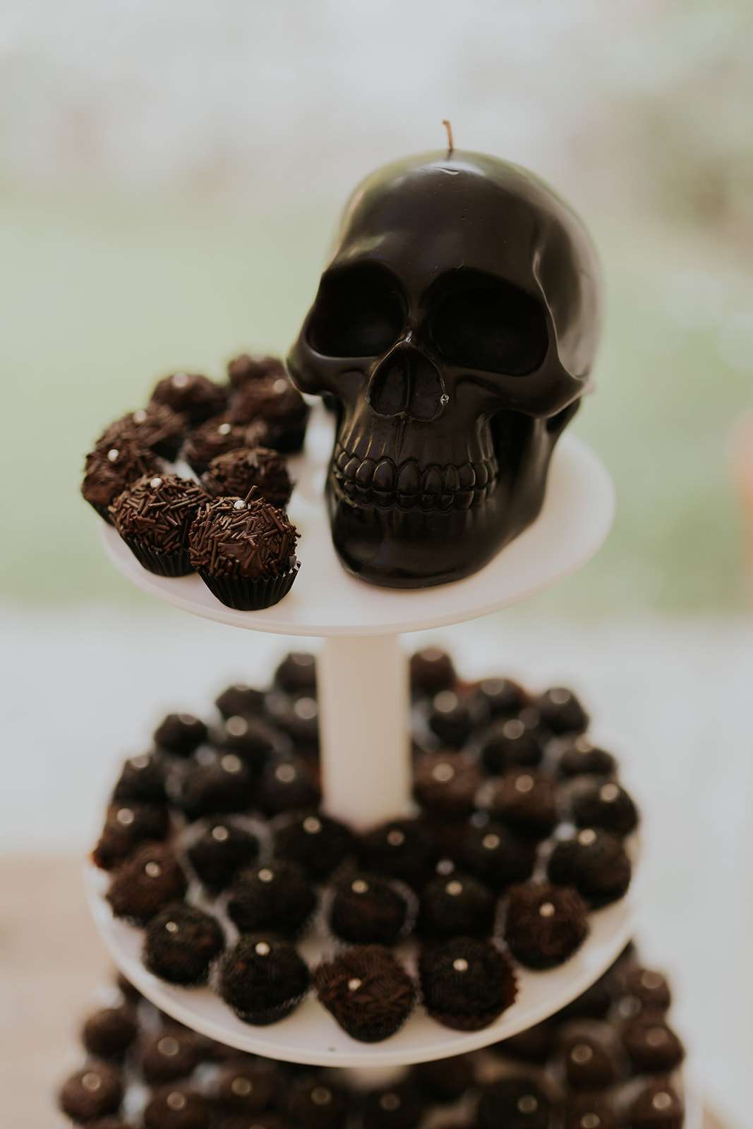 “Every little detail was meaningful,” the bride told us, “like my dress, the date we chose (Friday 13th) and the dark but beautiful decorations,. We used a coffin to put the beverages at the reception and a little coffin to put the rings in. Our first dance was inspired by the demon dance from Eyes Wide Shut.”