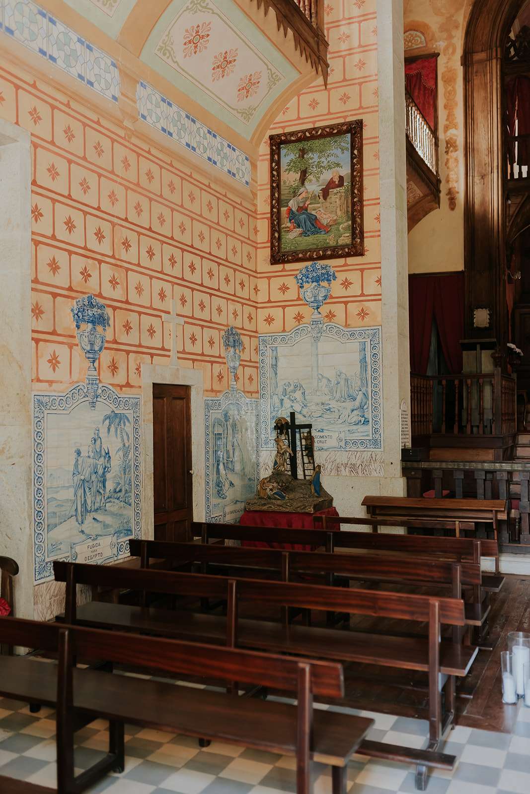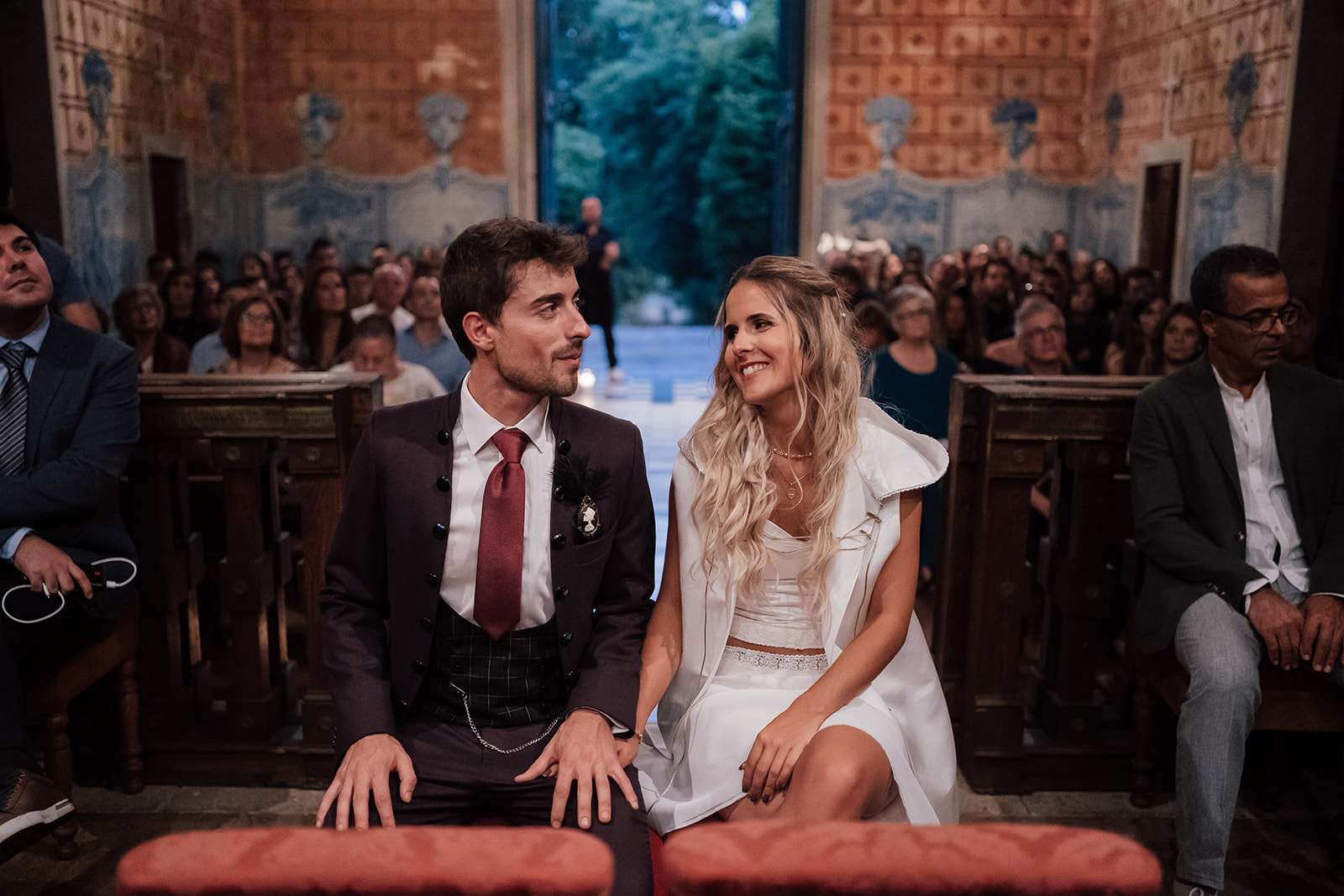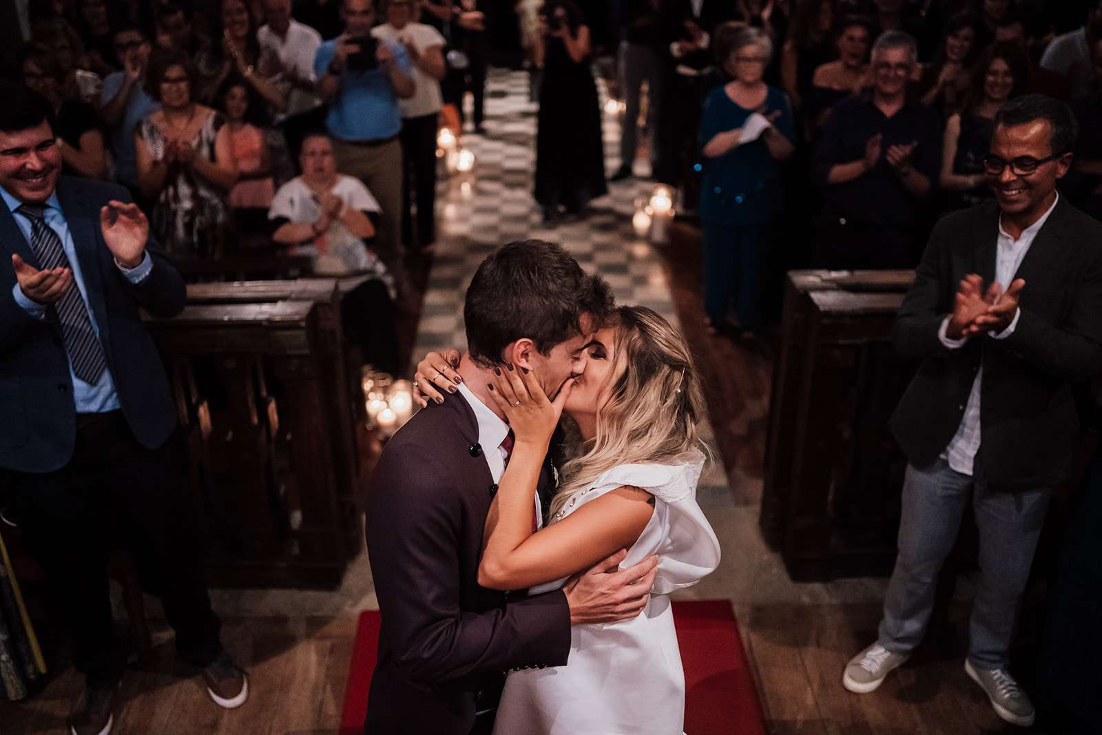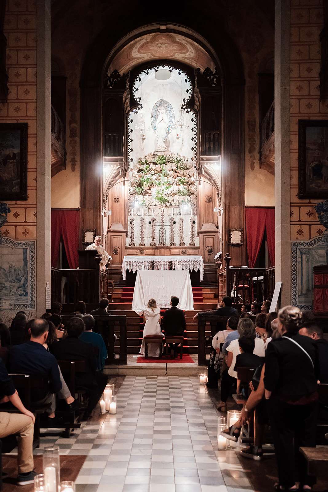 After a cocktail hour outside, the ceremony was held at Quinta da Costeira Church. It was dark when they exited (lit by lanterns held by their guests) and then they went straight into the dinner and party. “Our dog was there for the all ceremony so they witnessed our wedding vows and delivered the rings. To finish, we exit the church