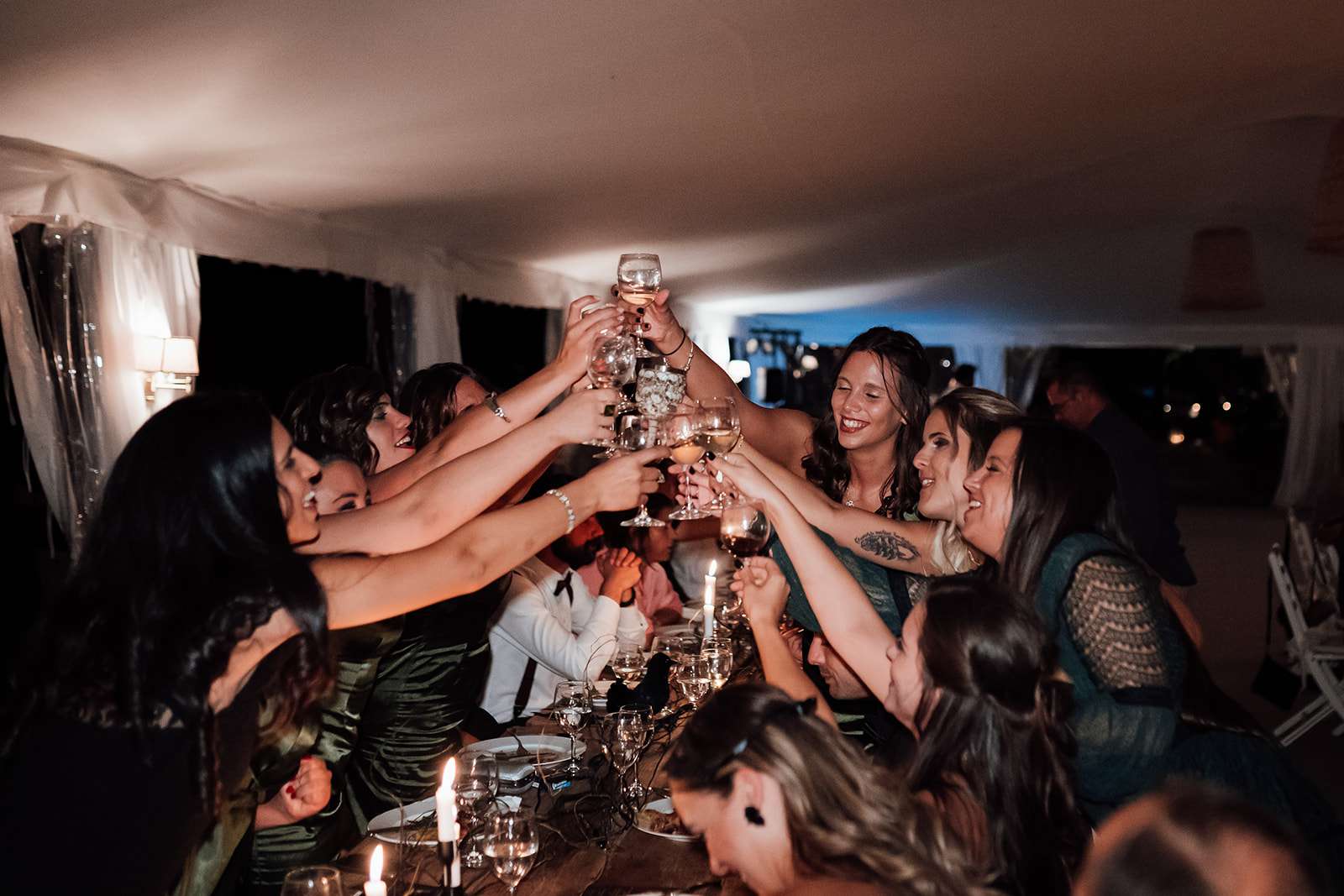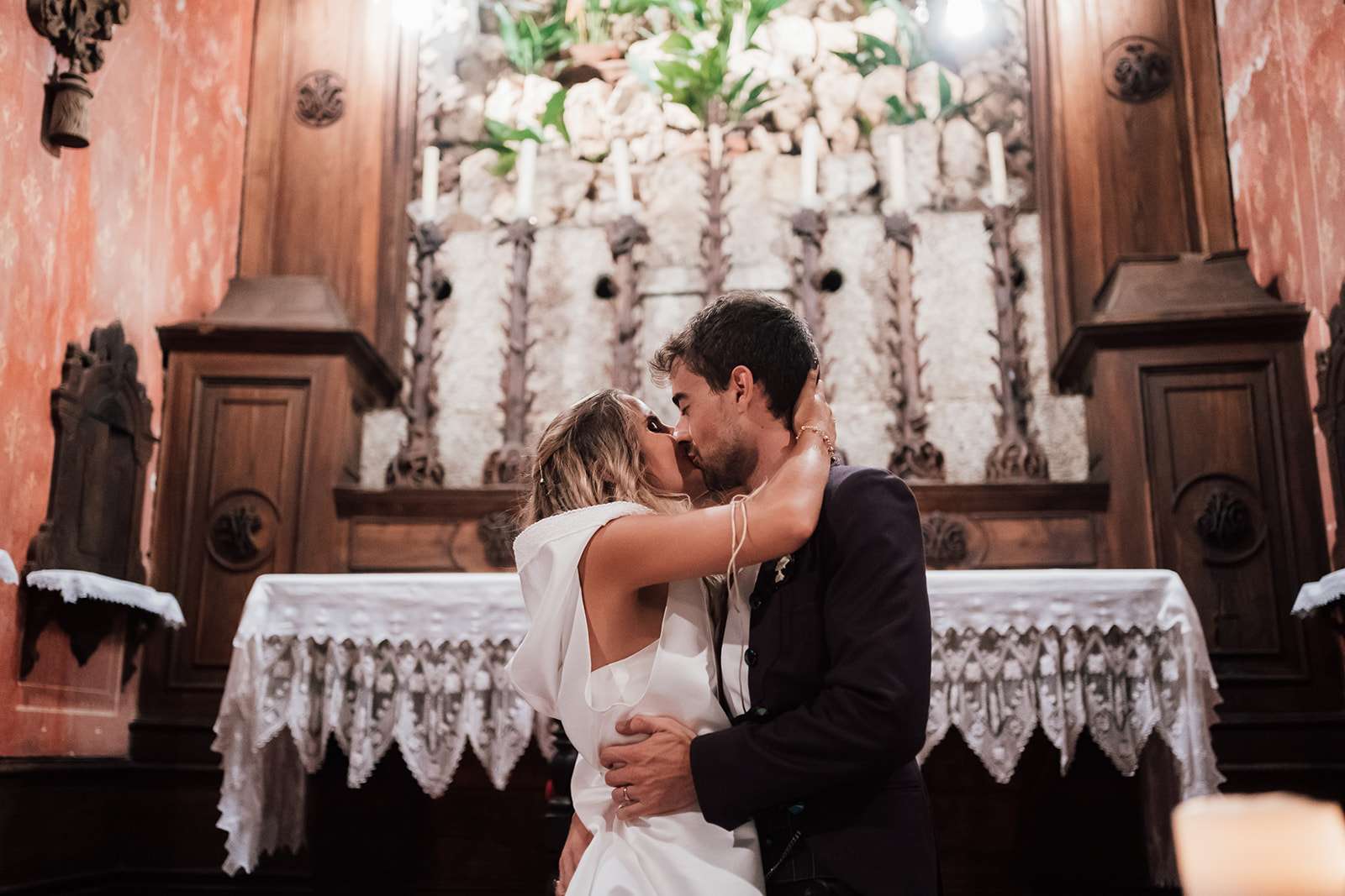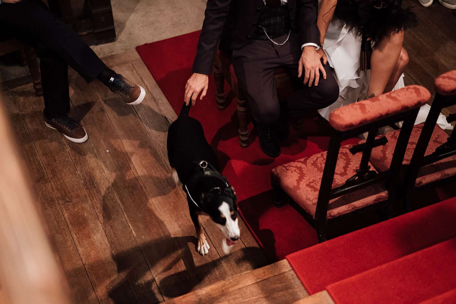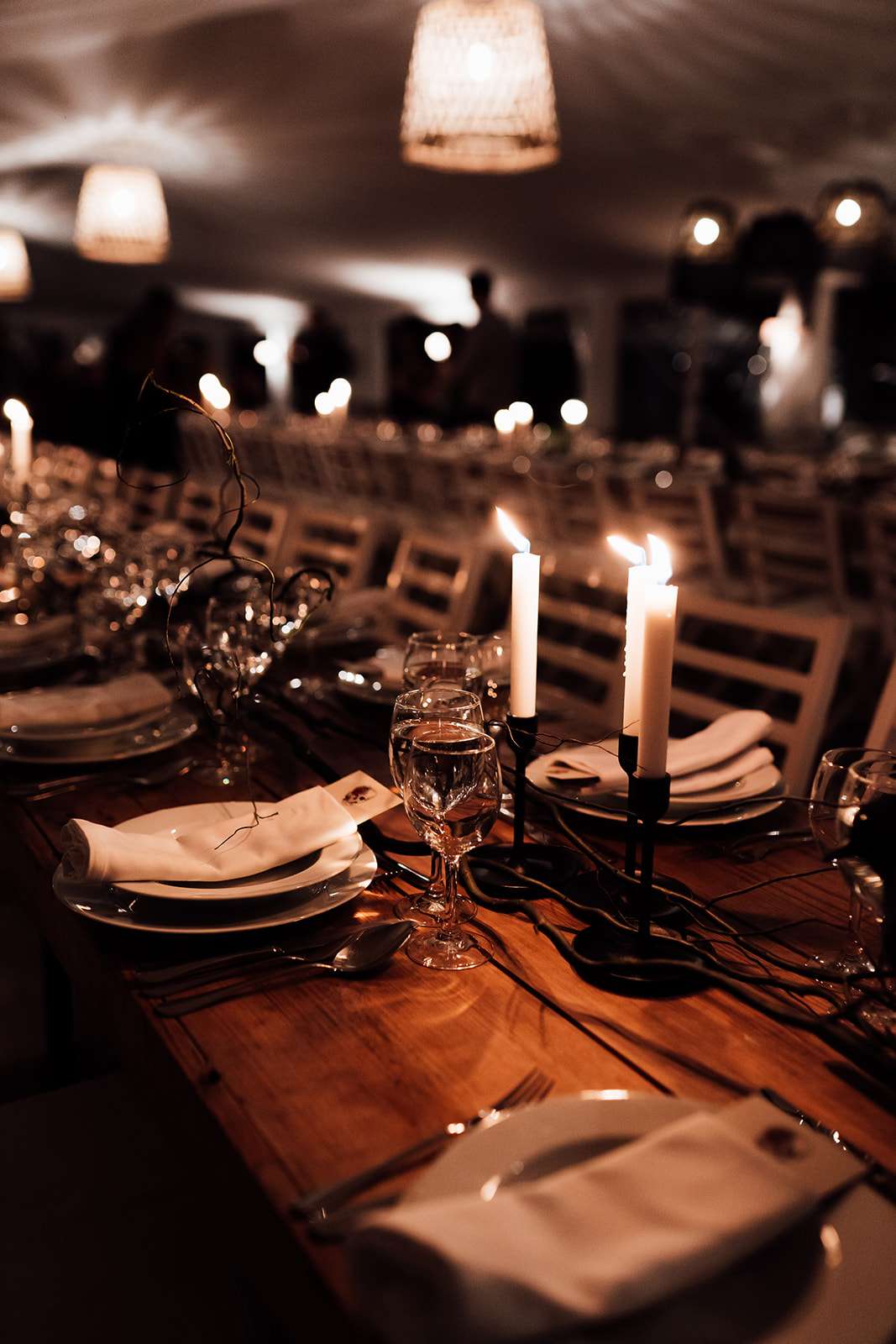 After a cocktail hour outside, the ceremony was held at Quinta da Costeira Church. It was dark when they exited (lit by lanterns held by their guests) and then they went straight into the dinner and party. “Our dog was there for the all ceremony so they witnessed our wedding vows and delivered the rings. To finish, we exit the church