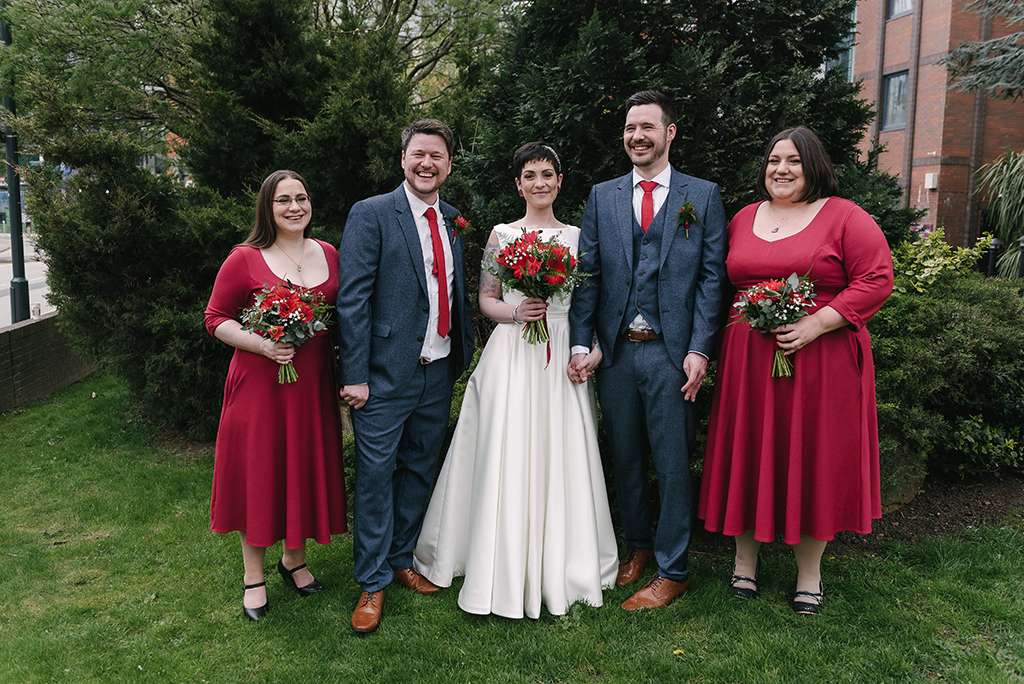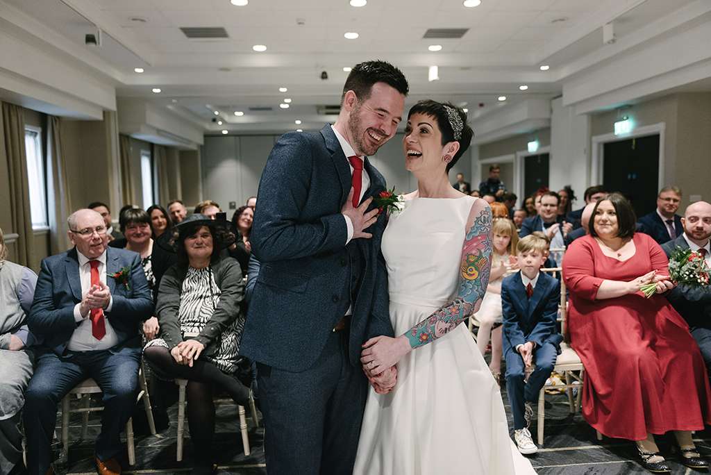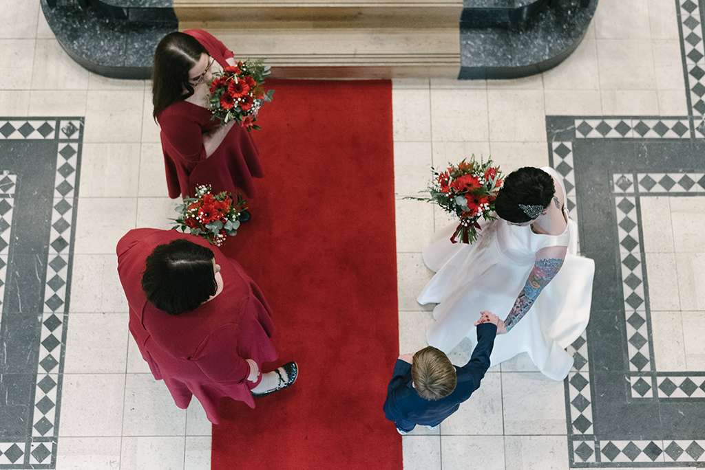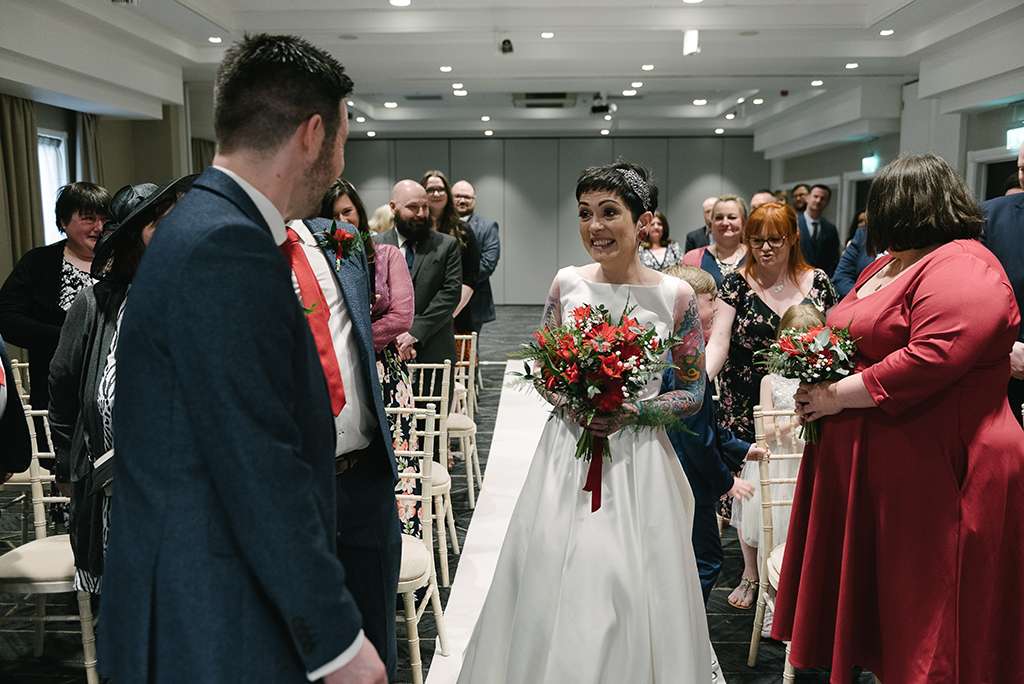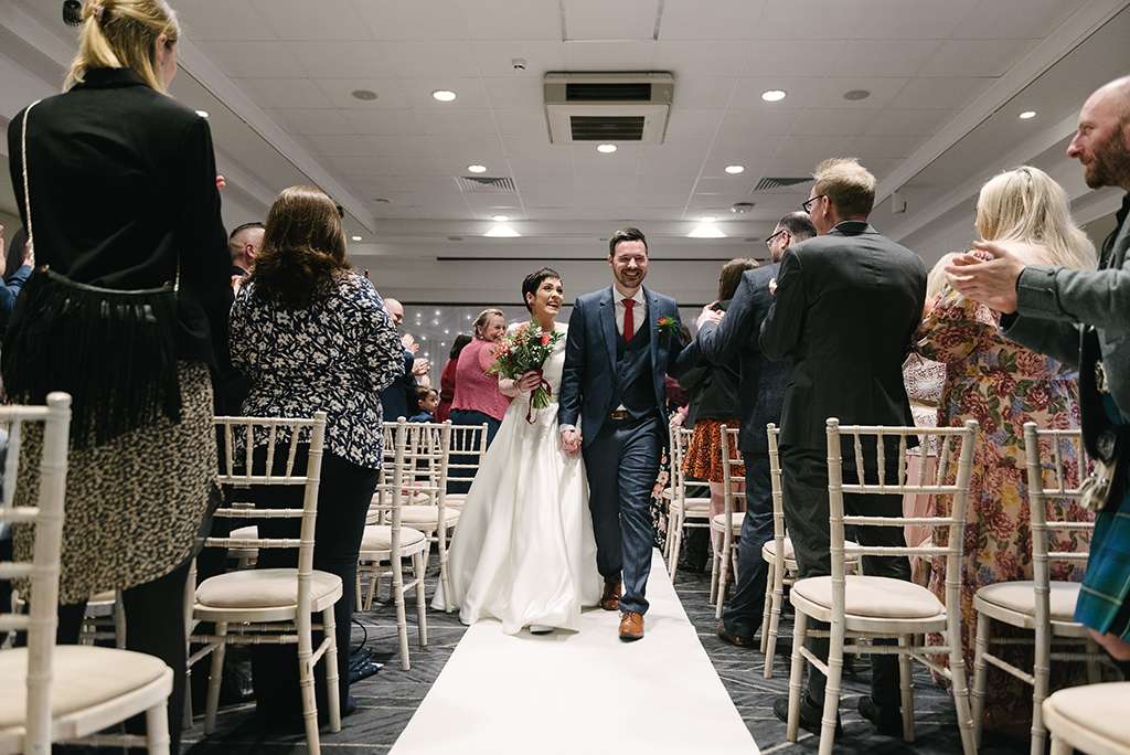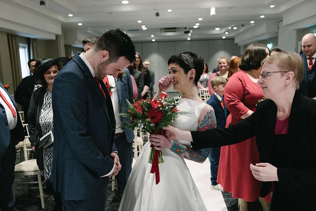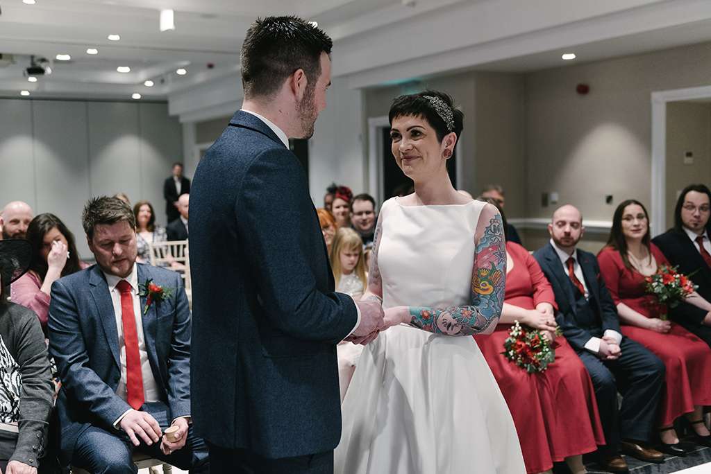 Their ceremony, with a soundtrack of instrumental video game music, was an emotional one; “There were a lot of tears, and I feel like most of that was just because we had waited for so long to get to that moment!” Sian continued. “My nephew, Finnley, walked me down the aisle, and that was really special. When I got to the front, we just giggled at each other for a few minutes – the registrar had told me to put my bouquet on the table, but she had to take it from me because I was laughing so much! Looking back at the photos, I’m so happy that it was a day full of laughter. Our vows were standard ones selected from a menu from the registry office – I think we used all our creativity on other bits!”
