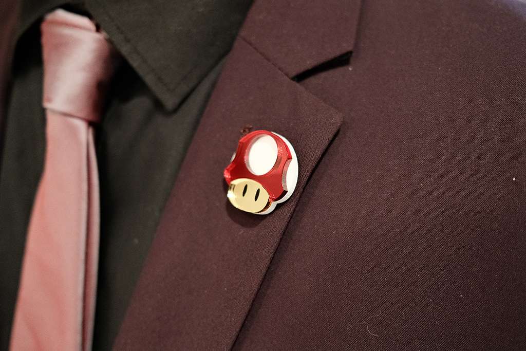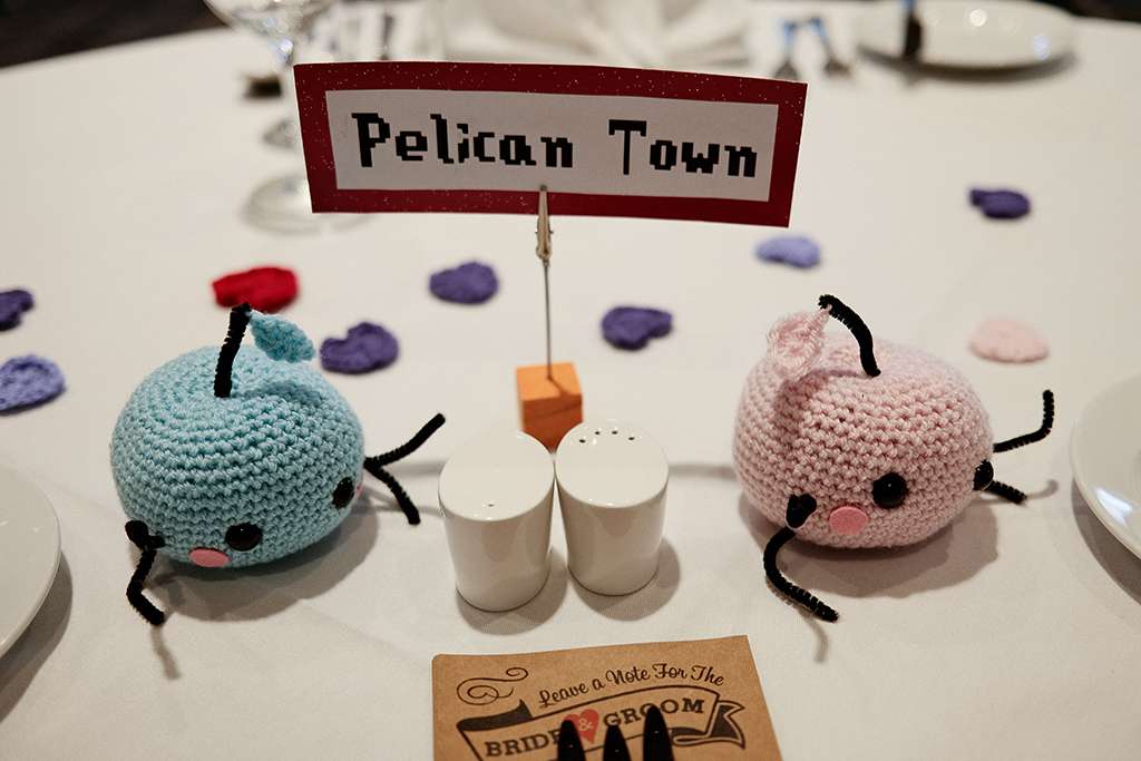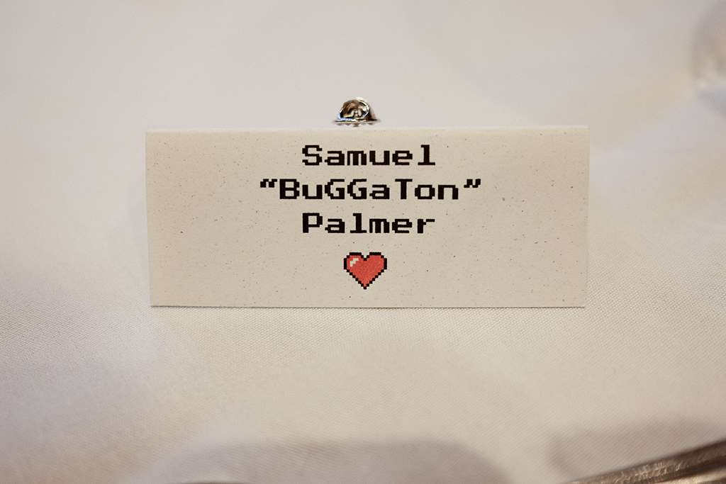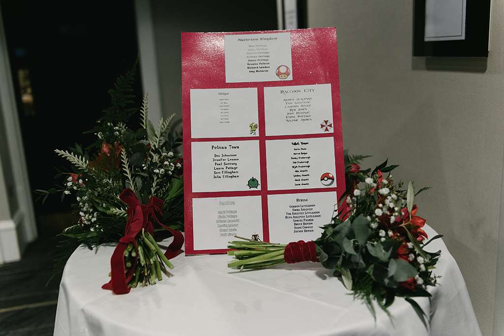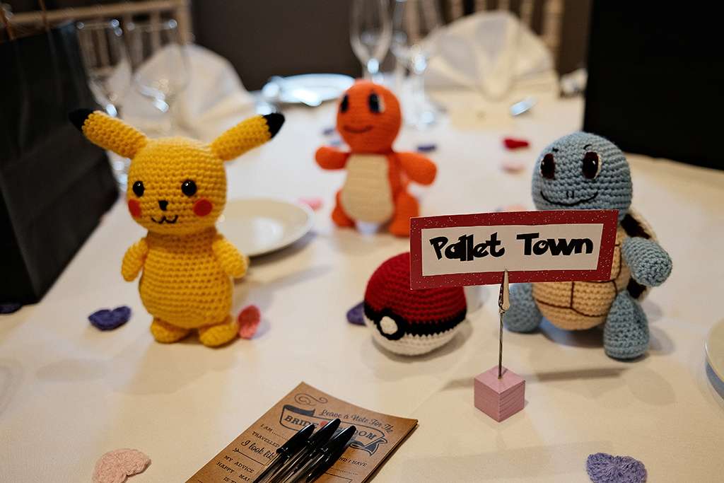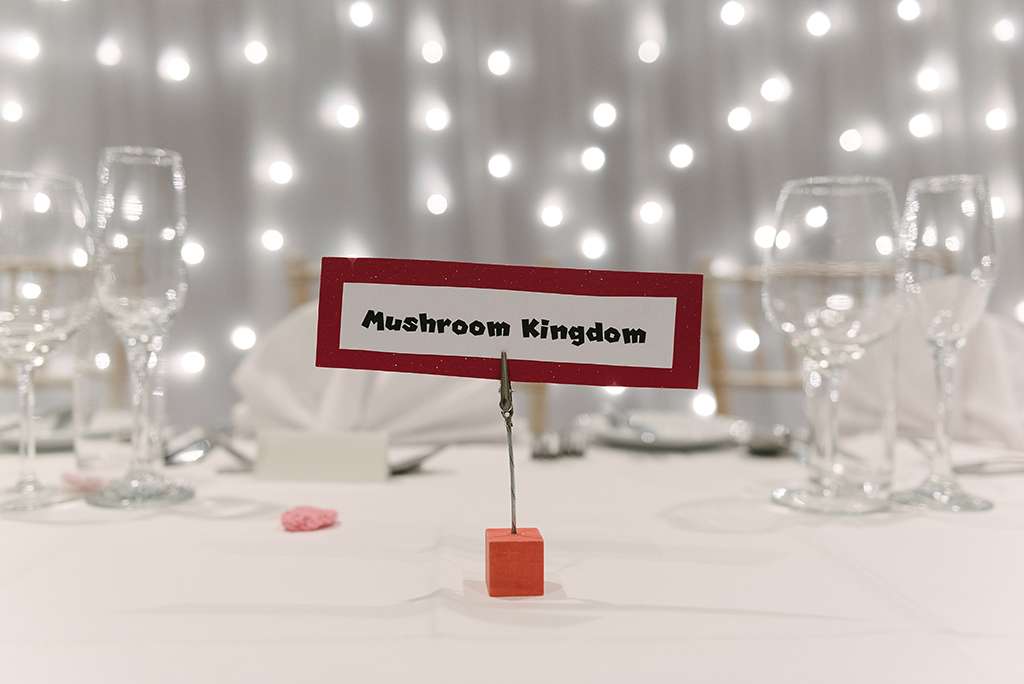 As huge gamers, Adam and Sian knew they wanted to include references to their love of video games in their April wedding in Leeds. “It was never really meant to be a theme, exactly, because a true theme takes an awful lot of commitment! But there were a lot of features that managed to creep in, so it ended up being a lot more themed than we anticipated,” Sian told us. Their name cards on the tables included the gamer name/ tag of the person where applicable and their wedding favours were video game-themed pin badges from Etsy.