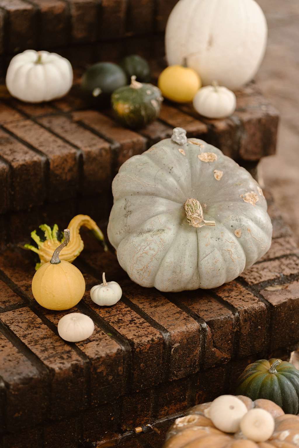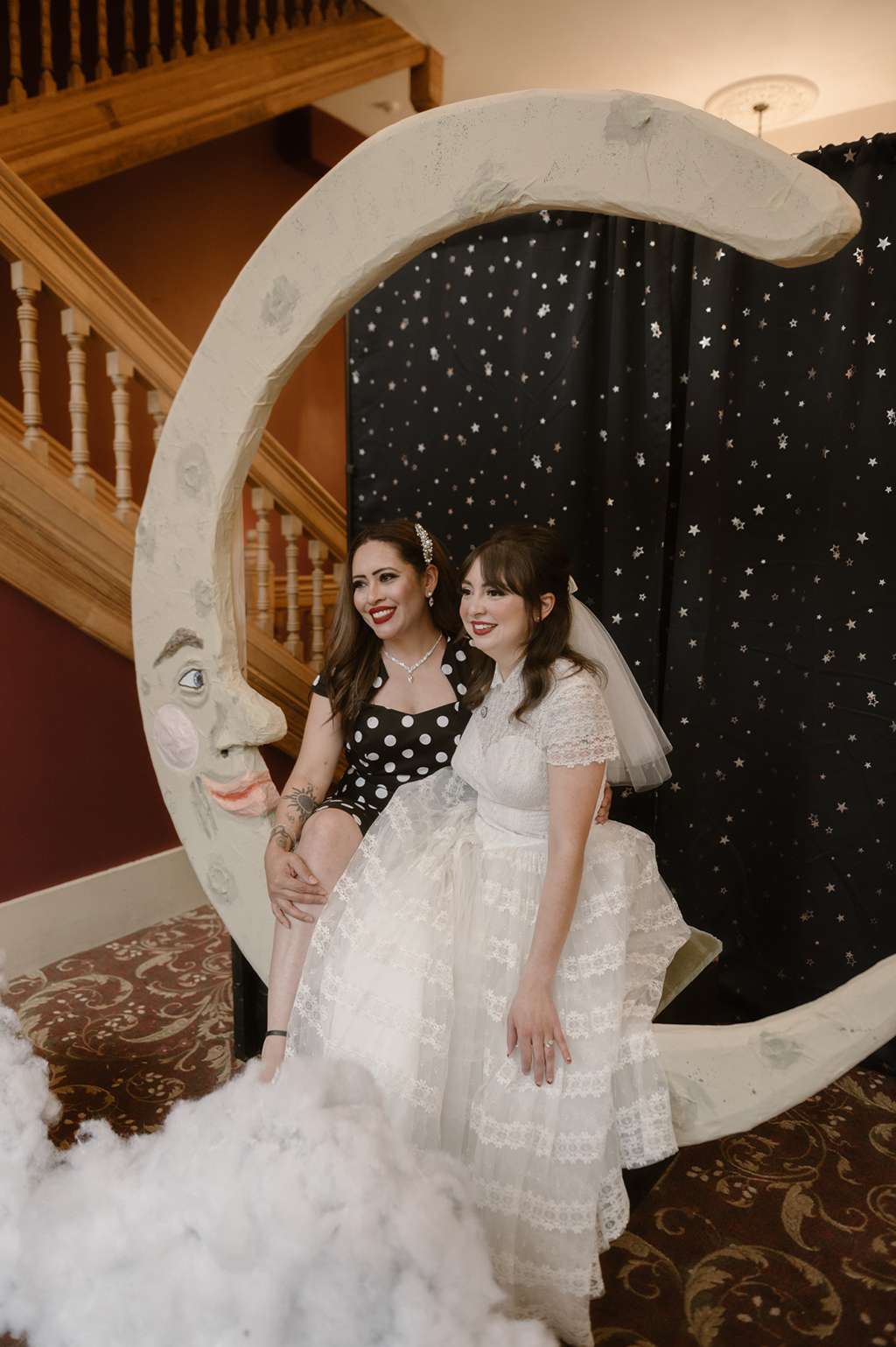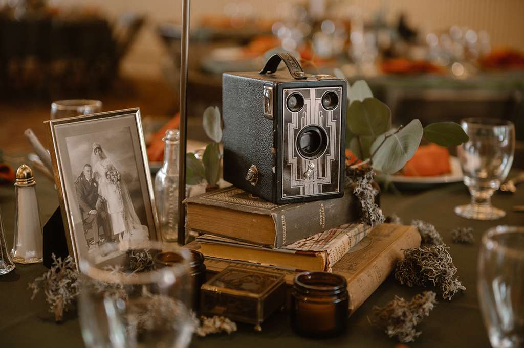 They built their papermoon photo backdrop and paired it with a Lomography instant square camera for a DIY photobooth. They also made their wedding arch, ouija board table and their wands. “We also grew all of the pumpkins in the wedding”, the bride explained. “We used lichen and moss from our yard and we thrifted and framed all of the antique wedding photos for centre pieces.”