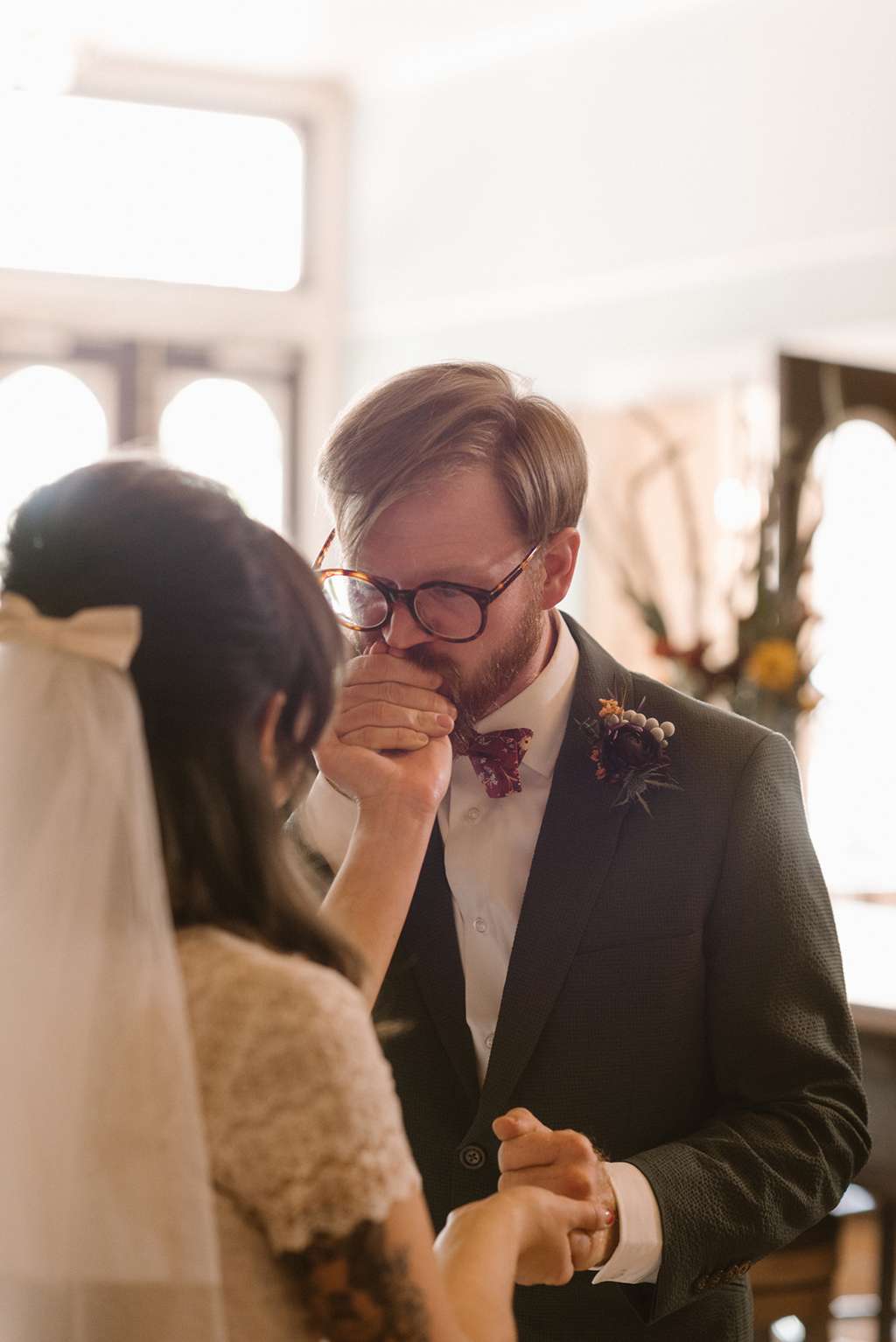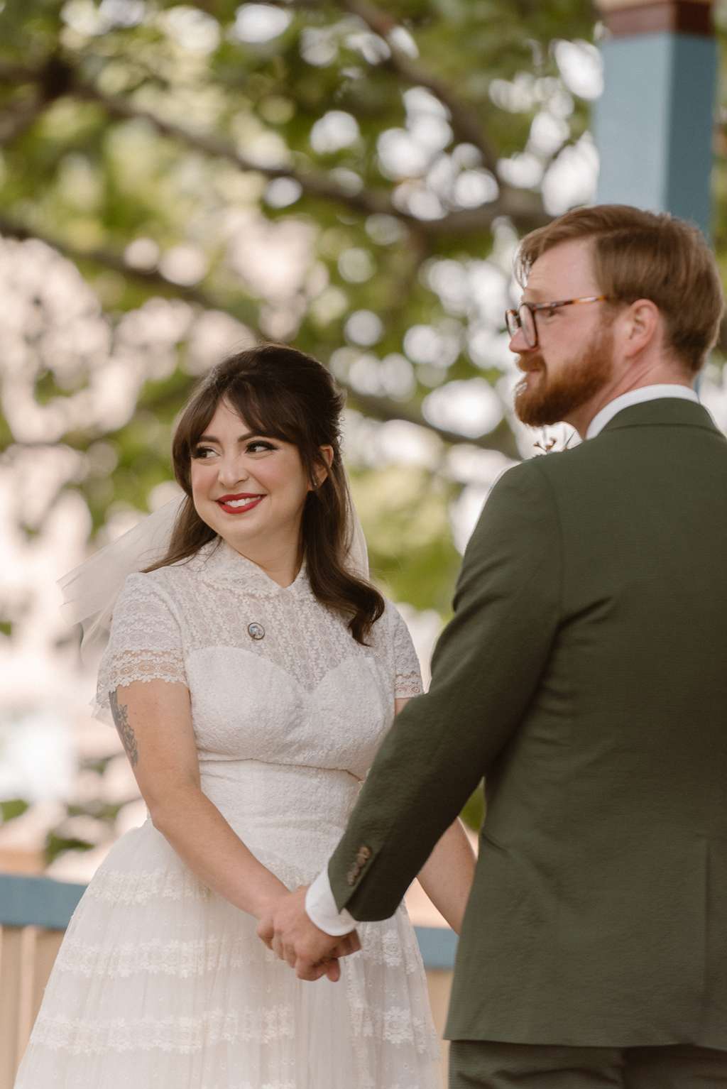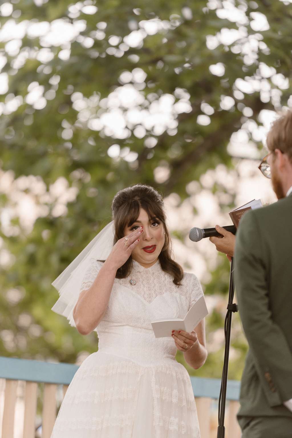 Their ceremony was magical and funny, and their favourite part of the day. “Our good friend Rudy married us and told a lovely fabricated tale about our family histories and how we met. Our vows included inside jokes and heartfelt promises. We played the Over the Garden Wall Soundtrack, the Jurassic Park Soundtrack, and The Rainbow Connection by Kermit the Frog.”