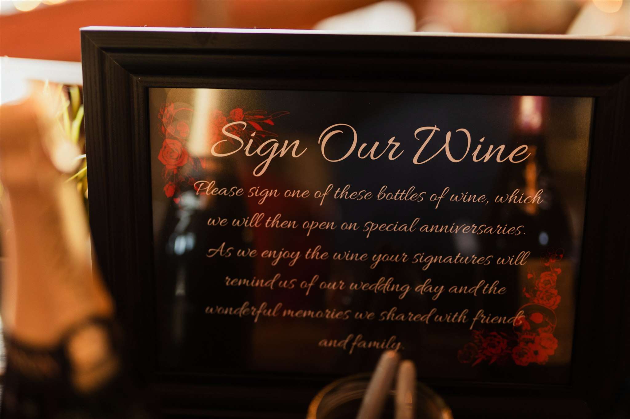 named after our favourite rock and metal bands. In lieu of a guestbook, we had guests sign wine bottles as we love a good bottle of red wine! Instead of a usual ‘card box’ we used Simon’s guitar case. Our house is filled with gothic photo frames, candles and real animal skulls so we used these as the table décor.”