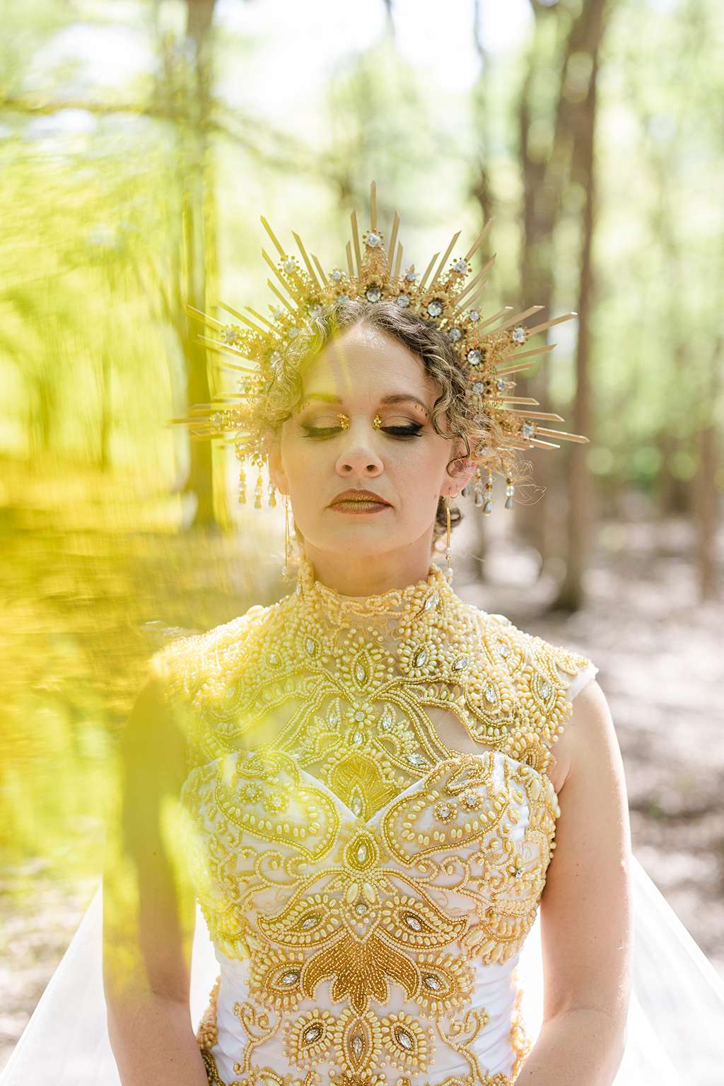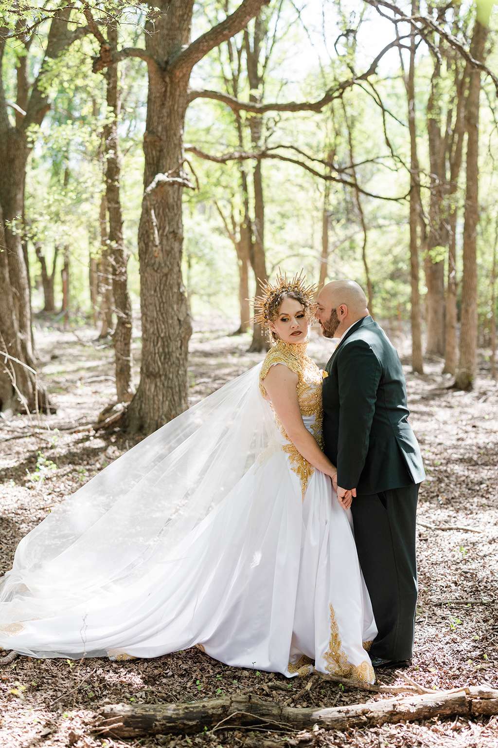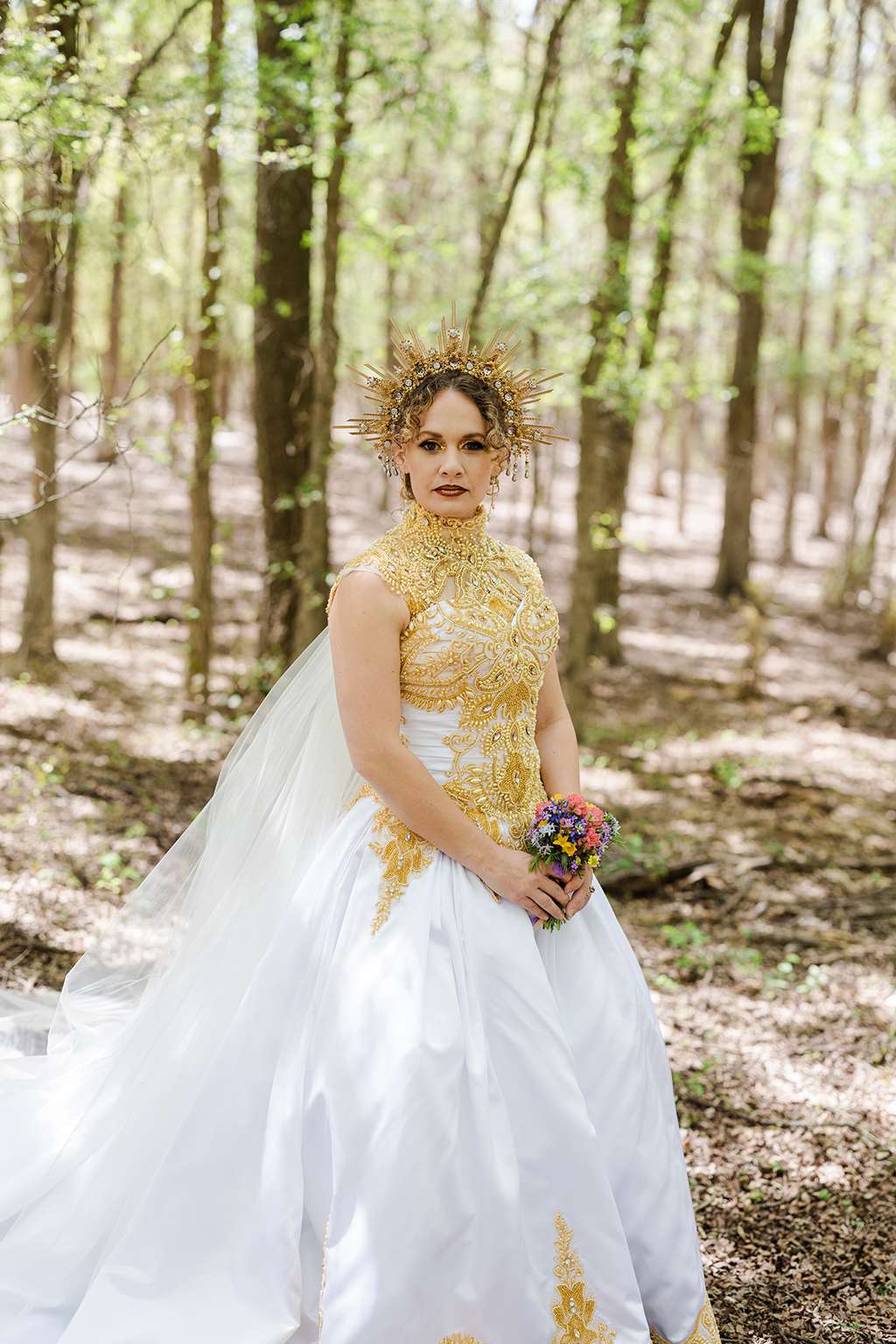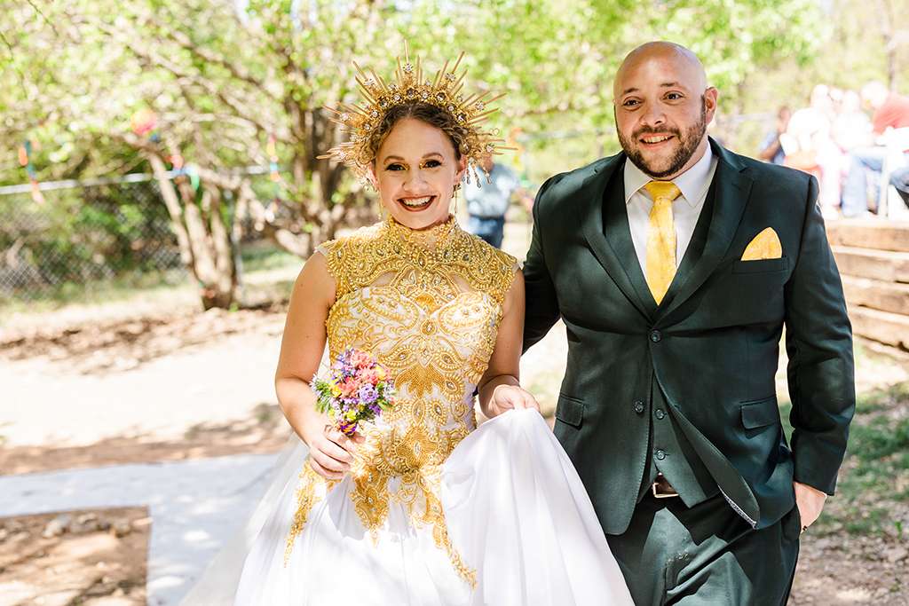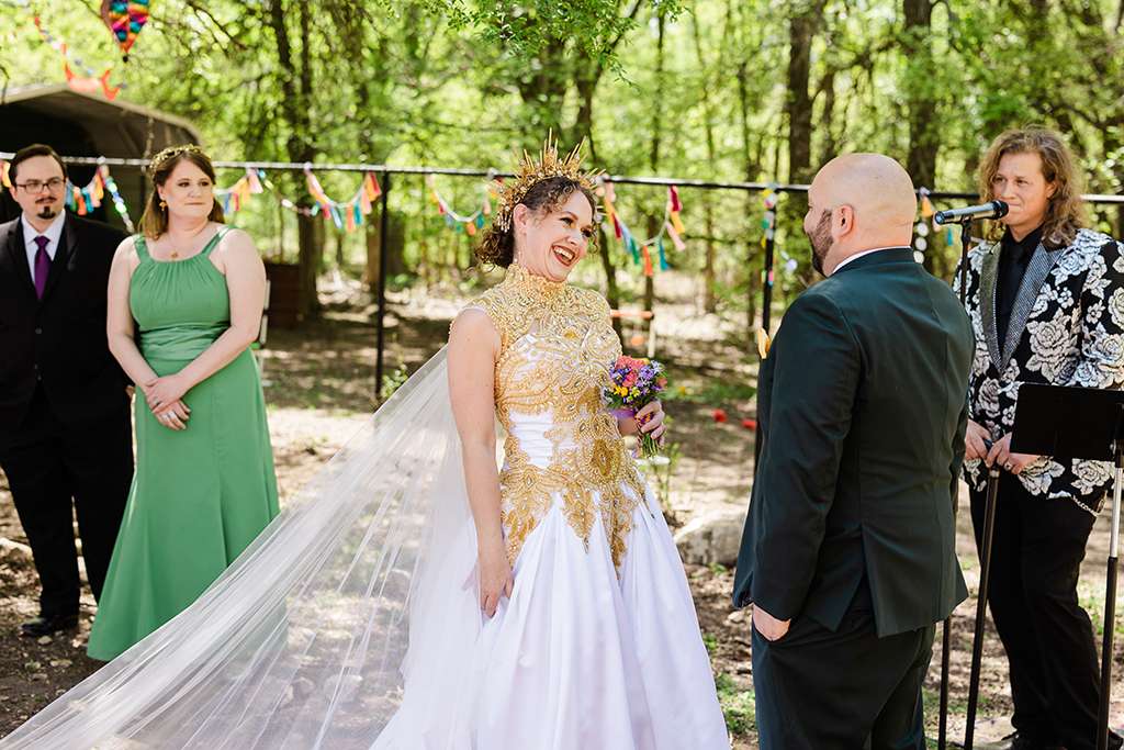 “We live in a beautiful area in Texas, so the cedar elms were just leafing out and the wildflowers were just starting to bloom. We used lots of bright colours in our decorations to reflect the colours of the wildflowers and carnival atmosphere. I had a custom gown made, I wanted to look like a dazzling, terrifying sun goddess, somewhere between a mardi gras krewe queen and a bride. I didn’t want to be ‘pretty’ in my wedding photos, which I guess is quite unusual.”