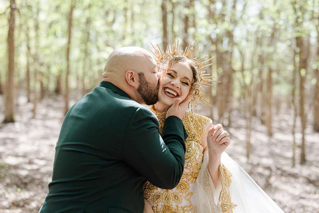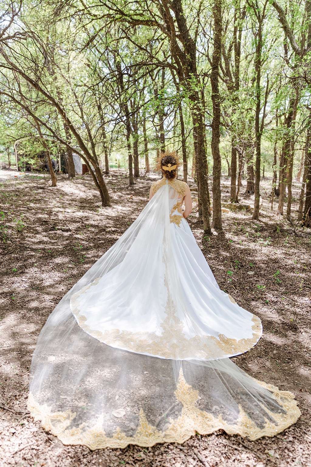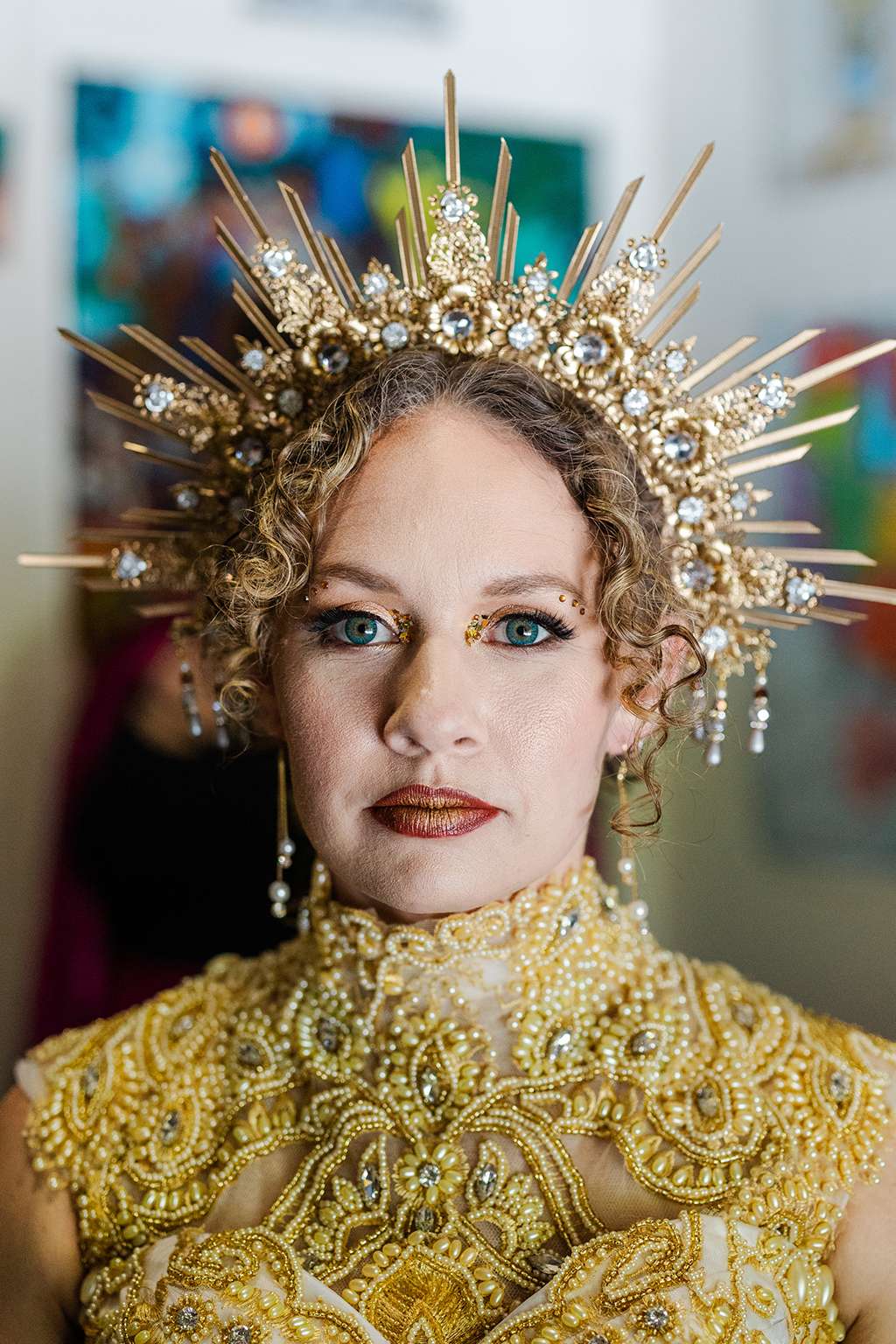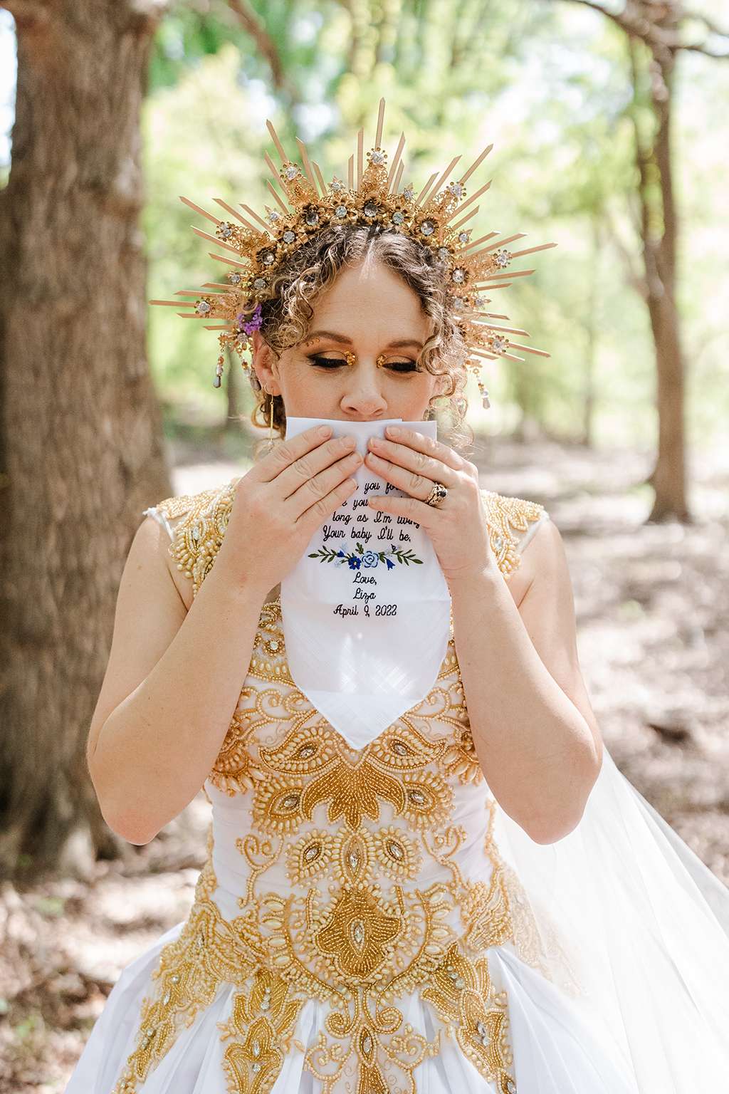 “We live in a beautiful area in Texas, so the cedar elms were just leafing out and the wildflowers were just starting to bloom. We used lots of bright colours in our decorations to reflect the colours of the wildflowers and carnival atmosphere. I had a custom gown made, I wanted to look like a dazzling, terrifying sun goddess, somewhere between a mardi gras krewe queen and a bride. I didn’t want to be ‘pretty’ in my wedding photos, which I guess is quite unusual.”