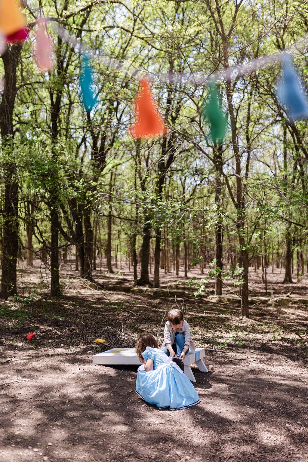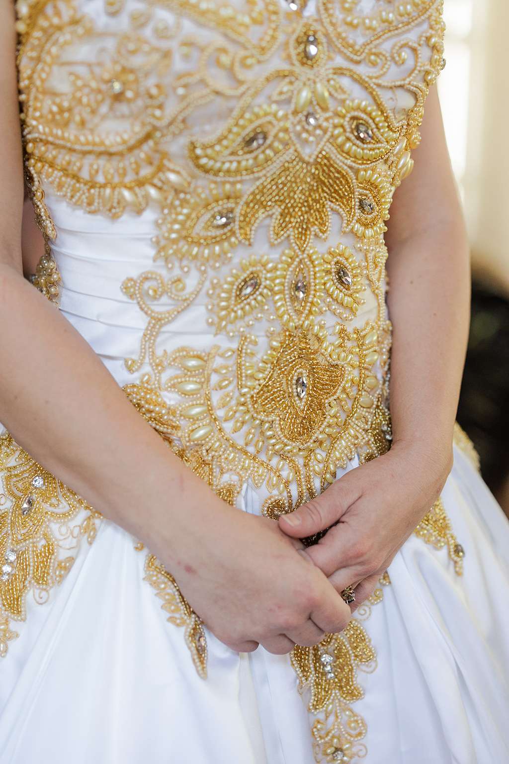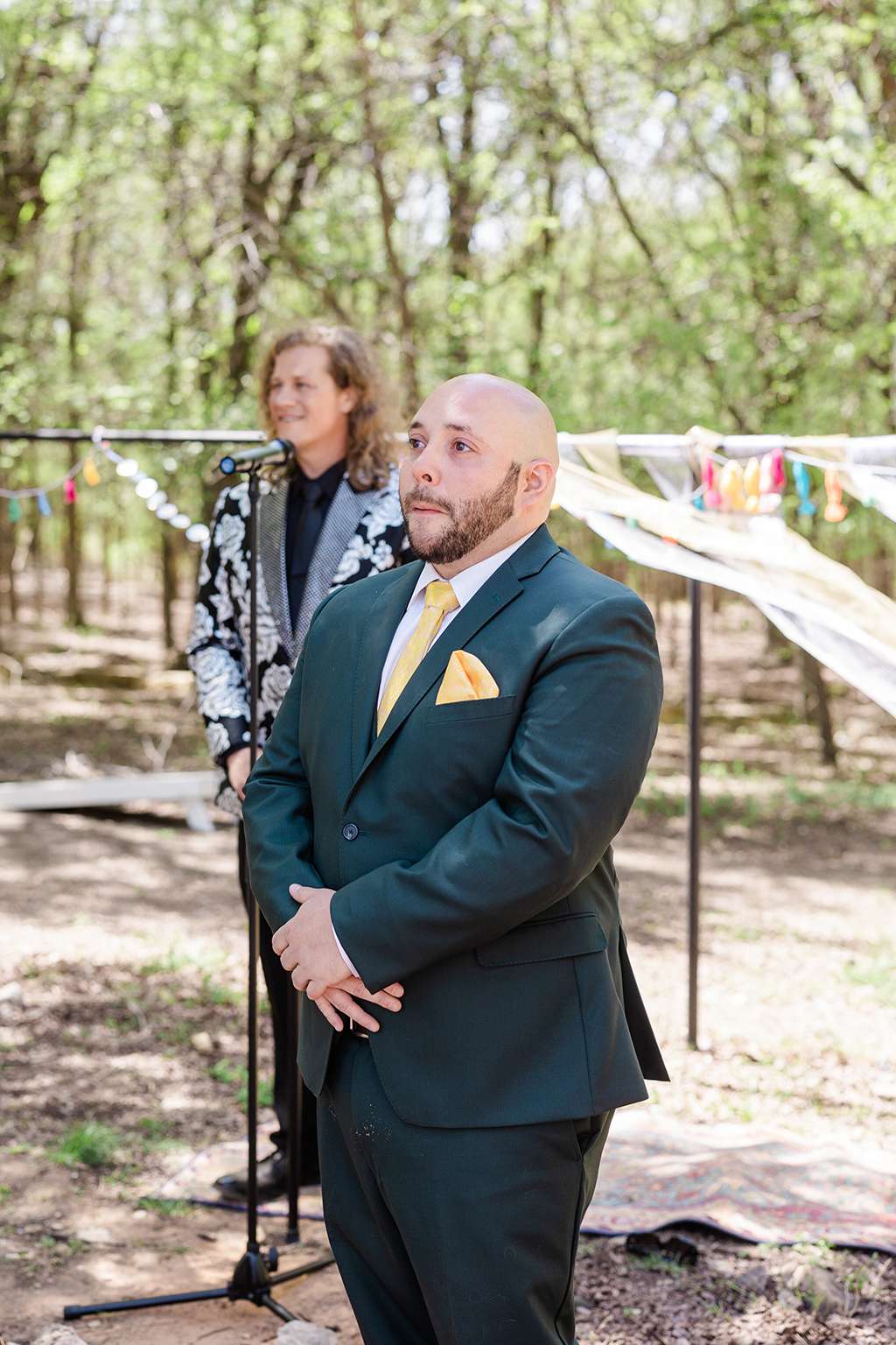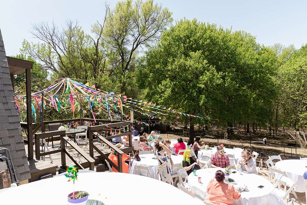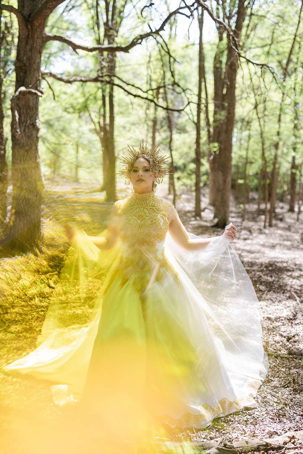 “We live in a beautiful area in Texas, so the cedar elms were just leafing out and the wildflowers were just starting to bloom. We used lots of bright colours in our decorations to reflect the colours of the wildflowers and carnival atmosphere. I had a custom gown made, I wanted to look like a dazzling, terrifying sun goddess, somewhere between a mardi gras krewe queen and a bride. I didn’t want to be ‘pretty’ in my wedding photos, which I guess is quite unusual.”