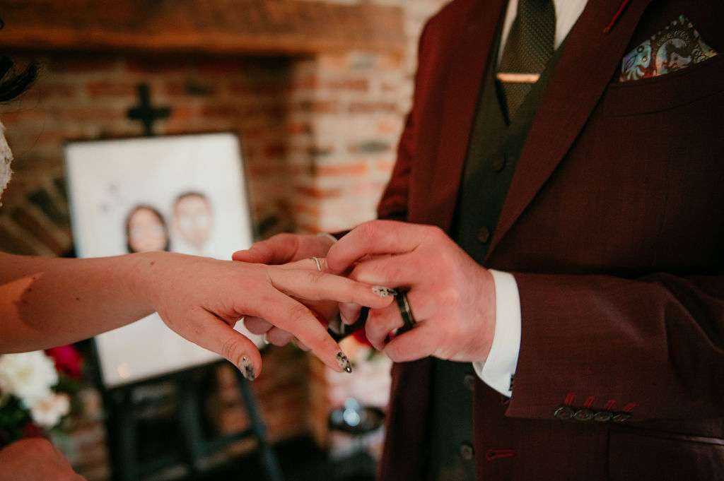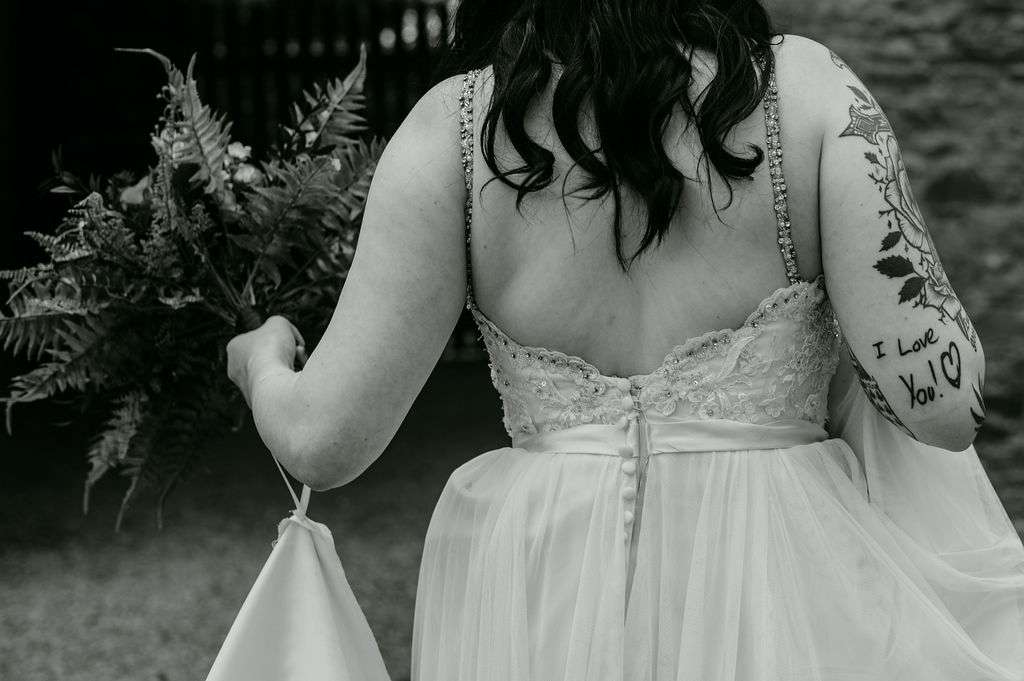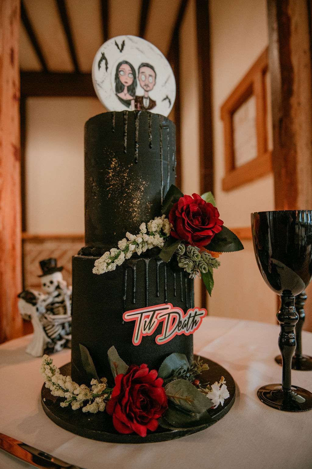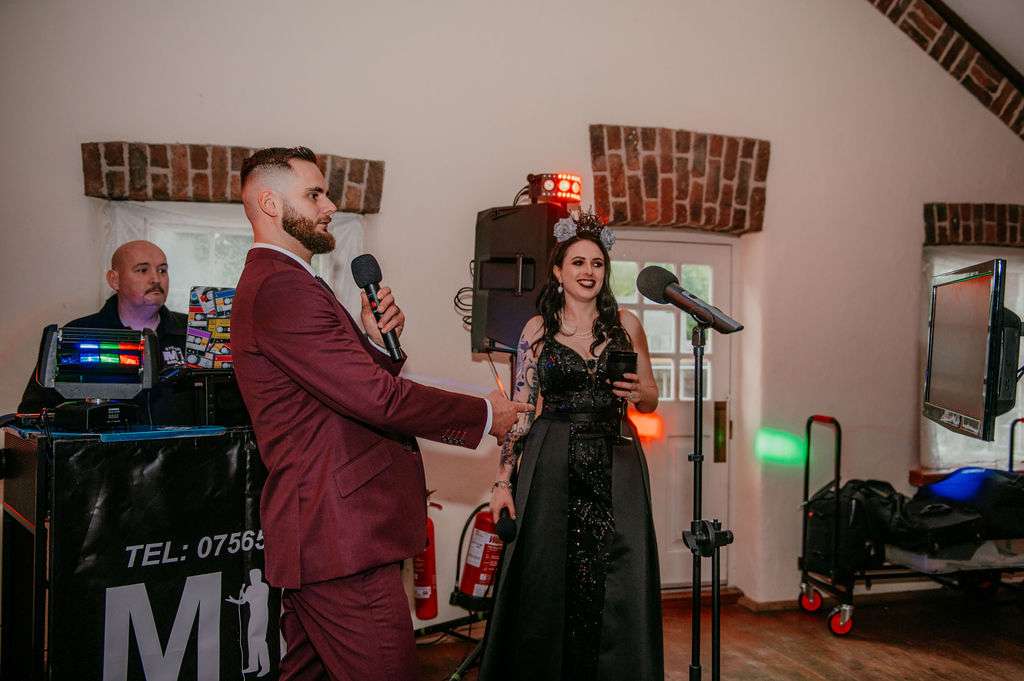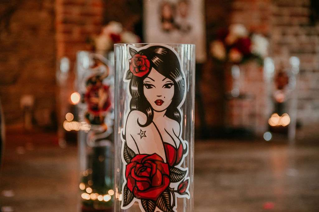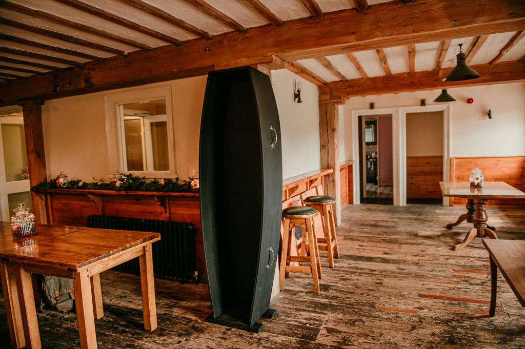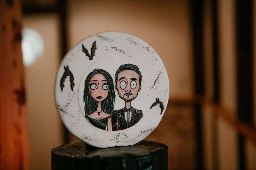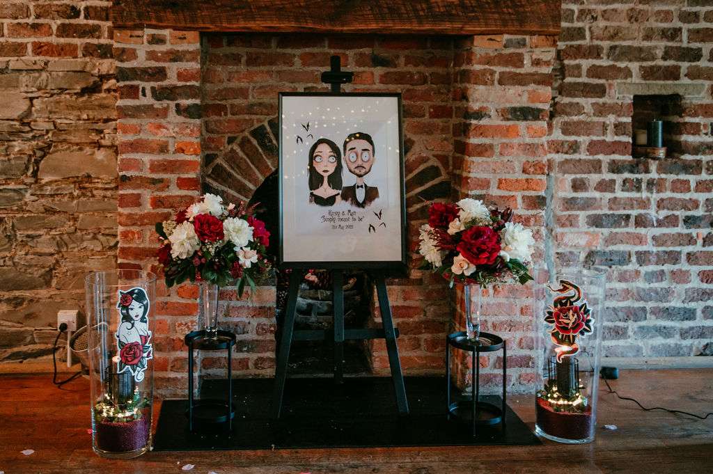The alt influences continued with the pair commissioning a Tim Burton’s style portrait of themselves to use throughout their stationery and styling for the day. The guests were also all requested to wear black. Kirsty changed from a white Mori Lee dress into a black JJ’s House gown for the reception, both of which she paired with Zombie Peep Show skull stilettos. The bride’s father, a a joiner by trade, built a custom coffin for their guests to use as a photobooth during the reception.
