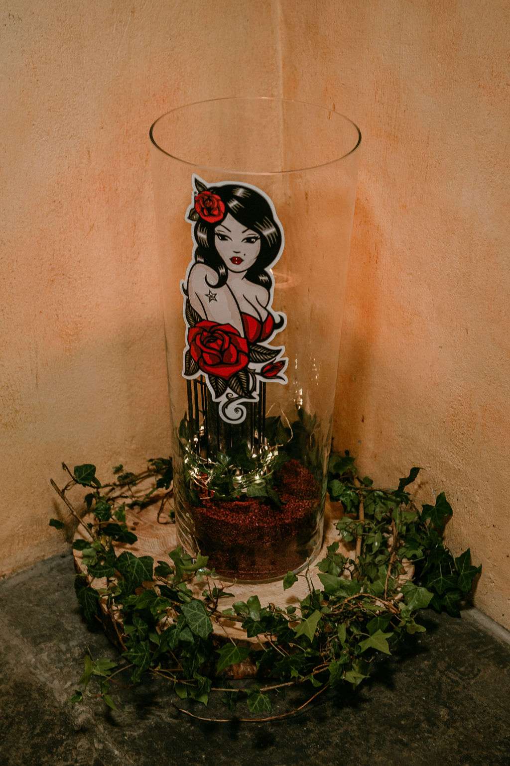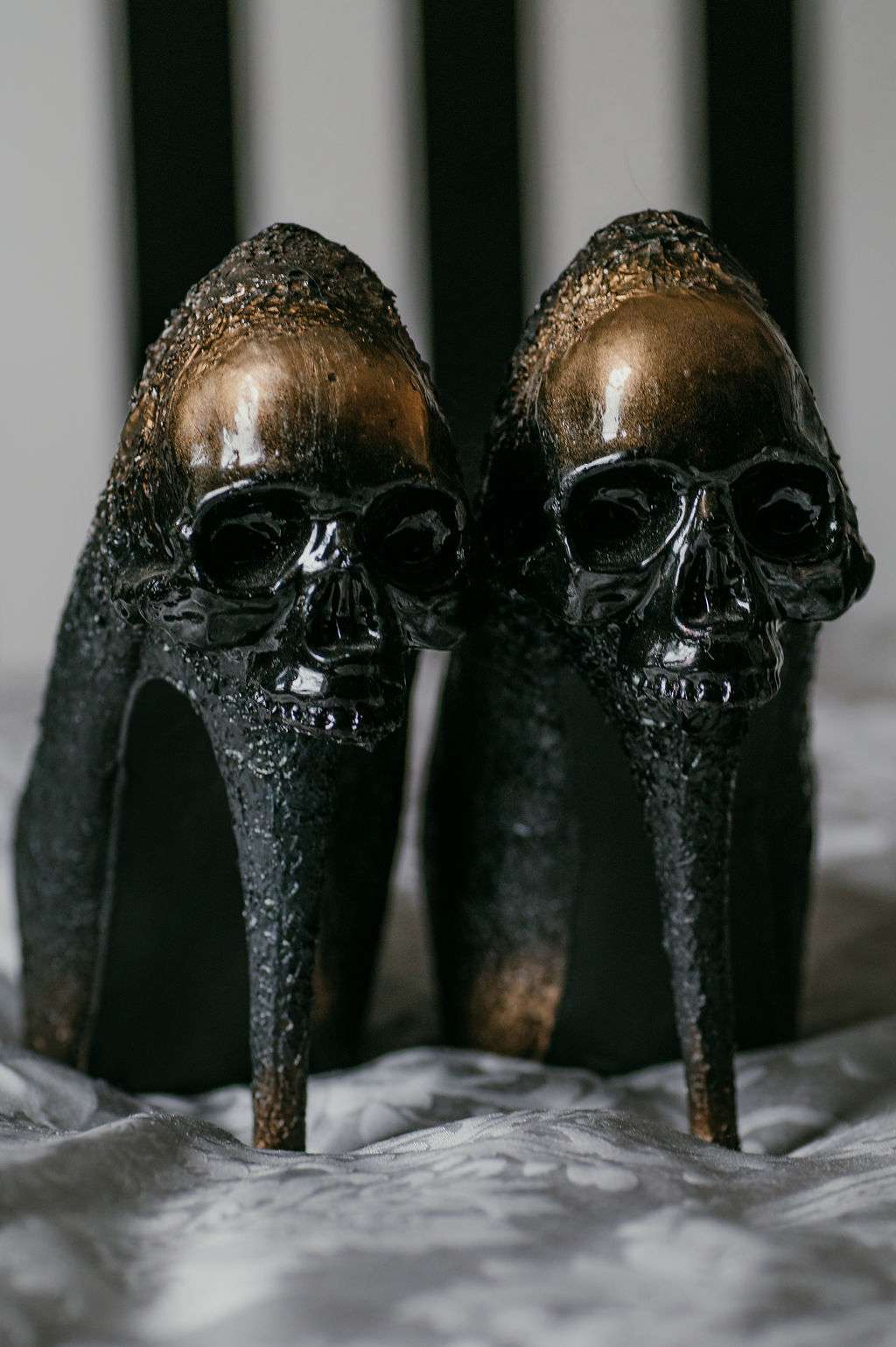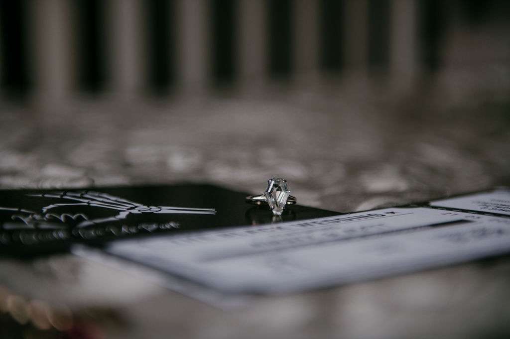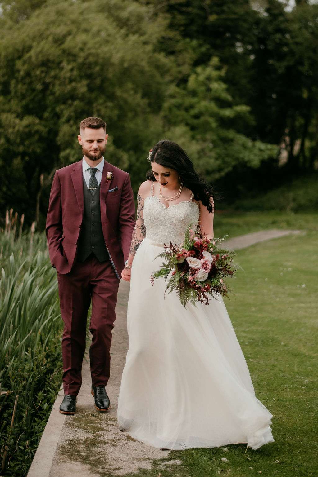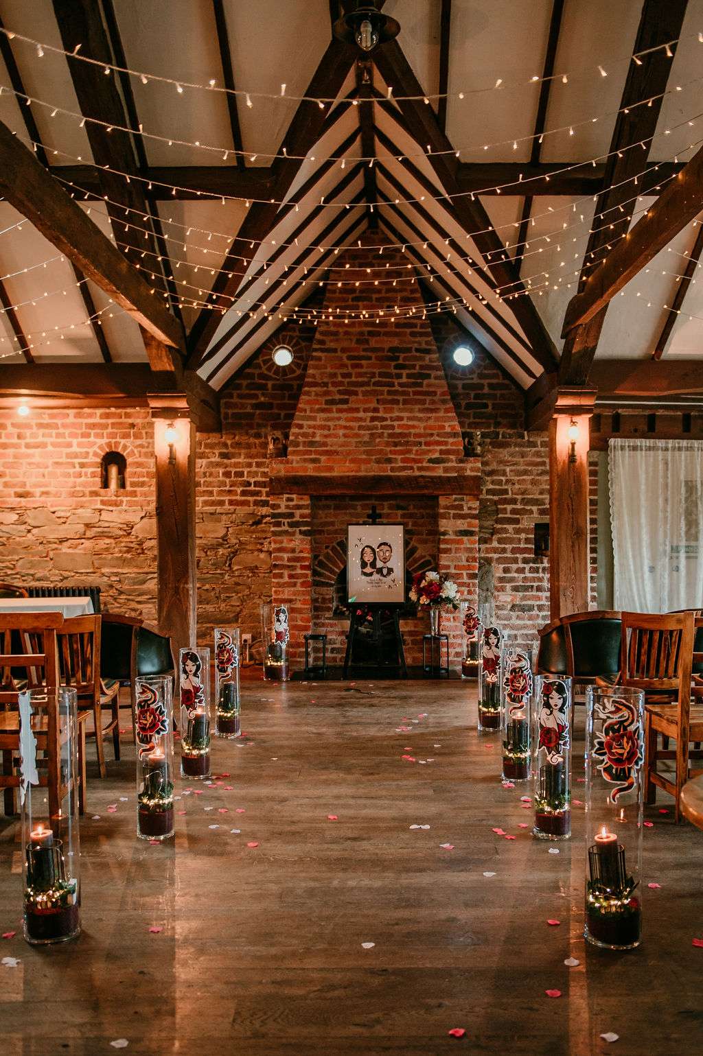 The alt influences continued with the pair commissioning a Tim Burton’s style portrait of themselves to use throughout their stationery and styling for the day. The guests were also all requested to wear black. Kirsty changed from a white Mori Lee dress into a black JJ’s House gown for the reception, both of which she paired with Zombie Peep Show skull stilettos. The bride’s father, a a joiner by trade, built a custom coffin for their guests to use as a photobooth during the reception.