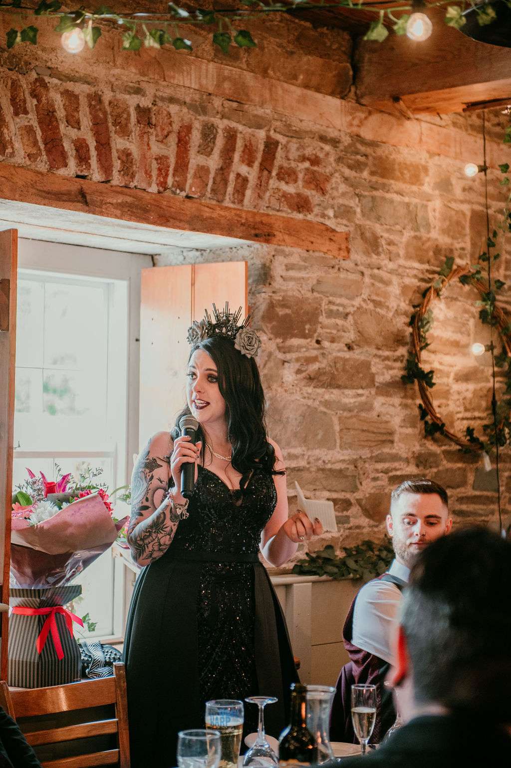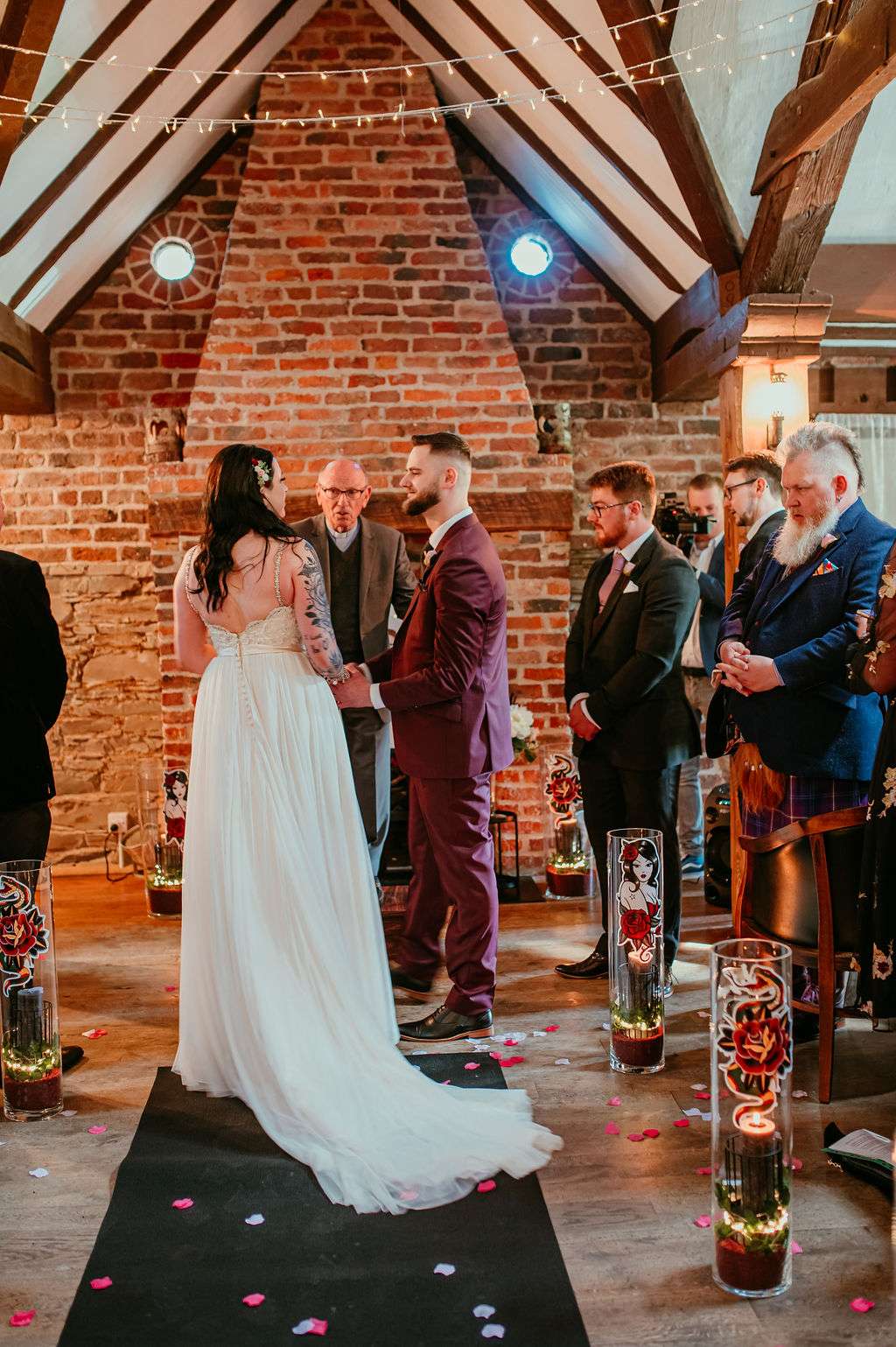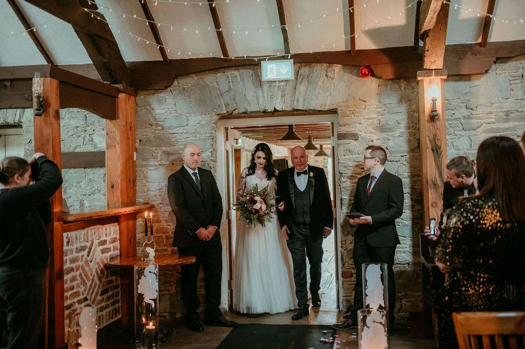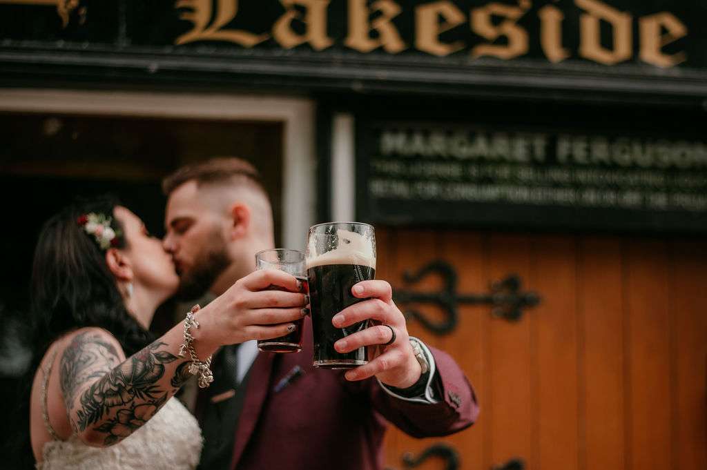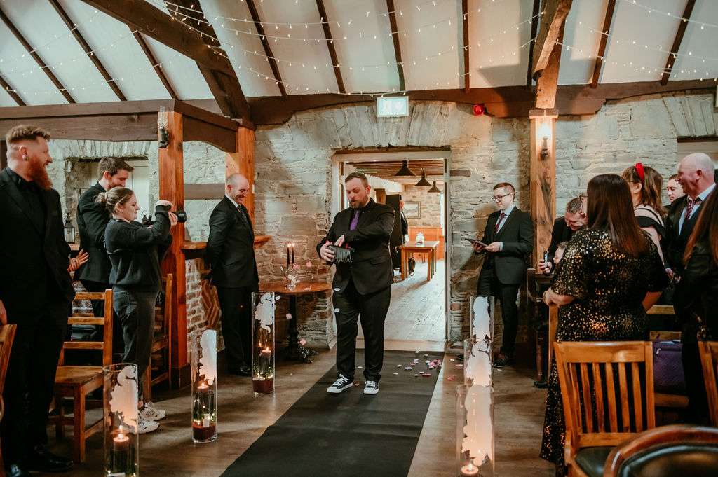 With over 100 guests in attendance, they chose a somewhat traditional service but still managed to add some personal touches. “Instead of the traditional flower girl, we instead asked Kirsty’s friend Donal to be our flower dude,” the couple told us. “He walked in sprinkling flower petals to The Darkness’I Believe in a Thing Called Love and really got the crowd laughing. The bridesmaids walked into Metallica’s Ecstasy of Gold, Kirsty followed them with Landslide by Fleetwood Mac. After our somewhat traditional service, we walked out to David Bowie’s Heroes.”