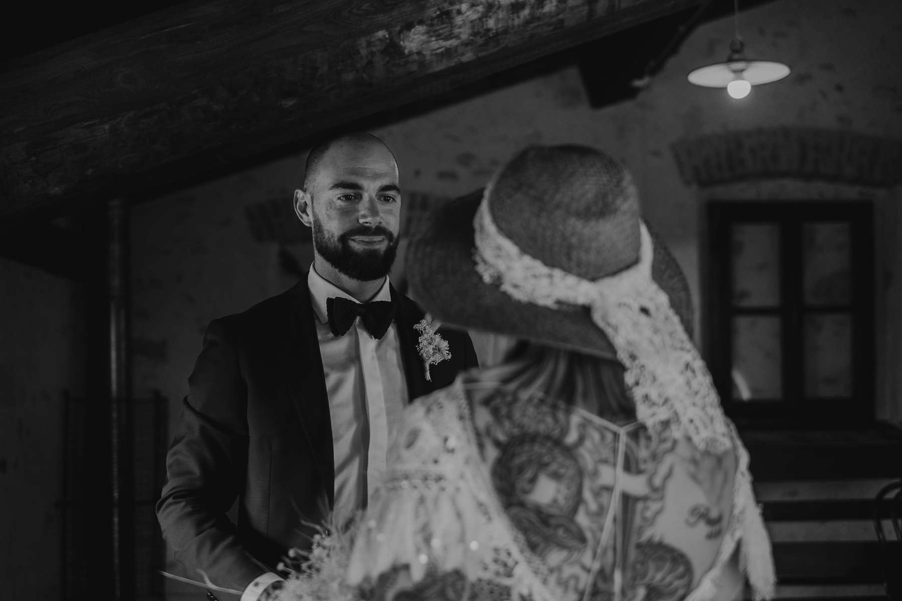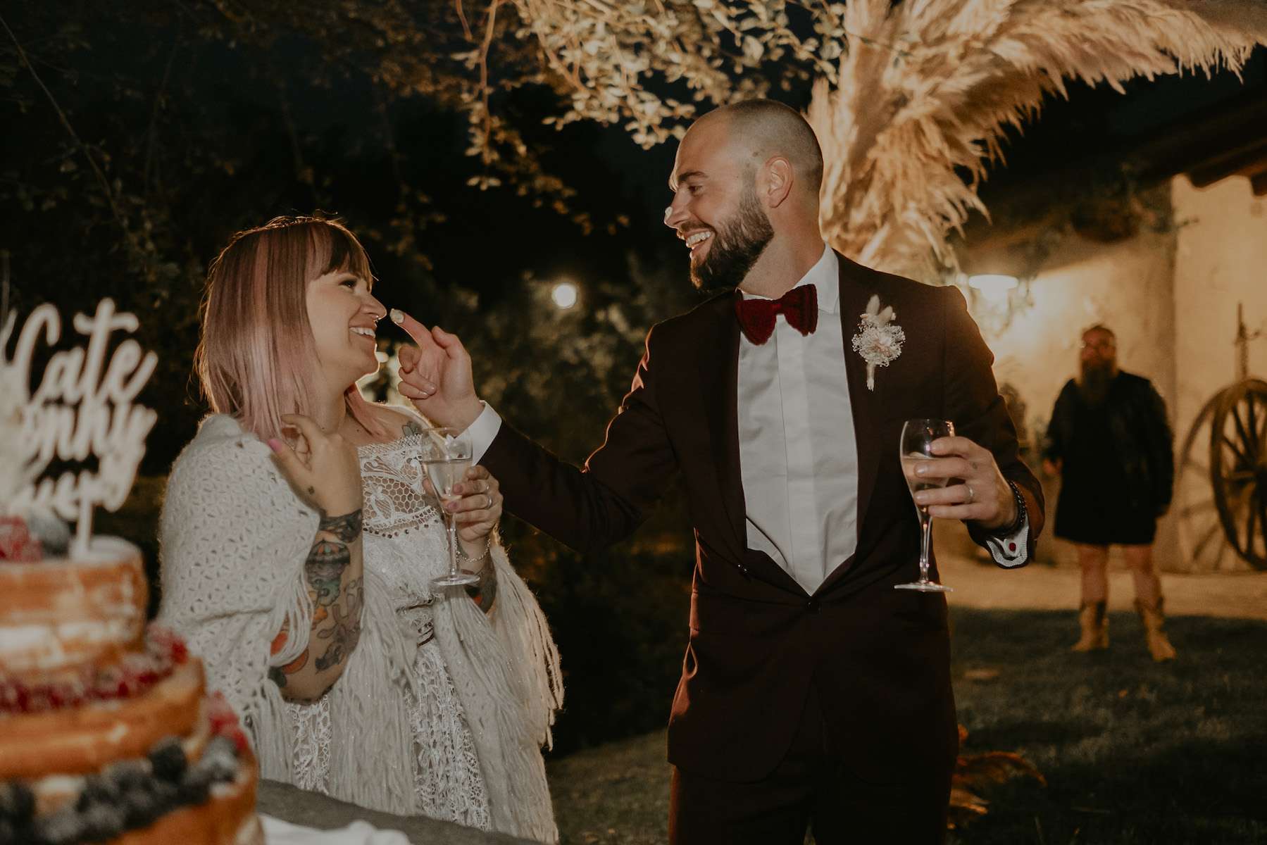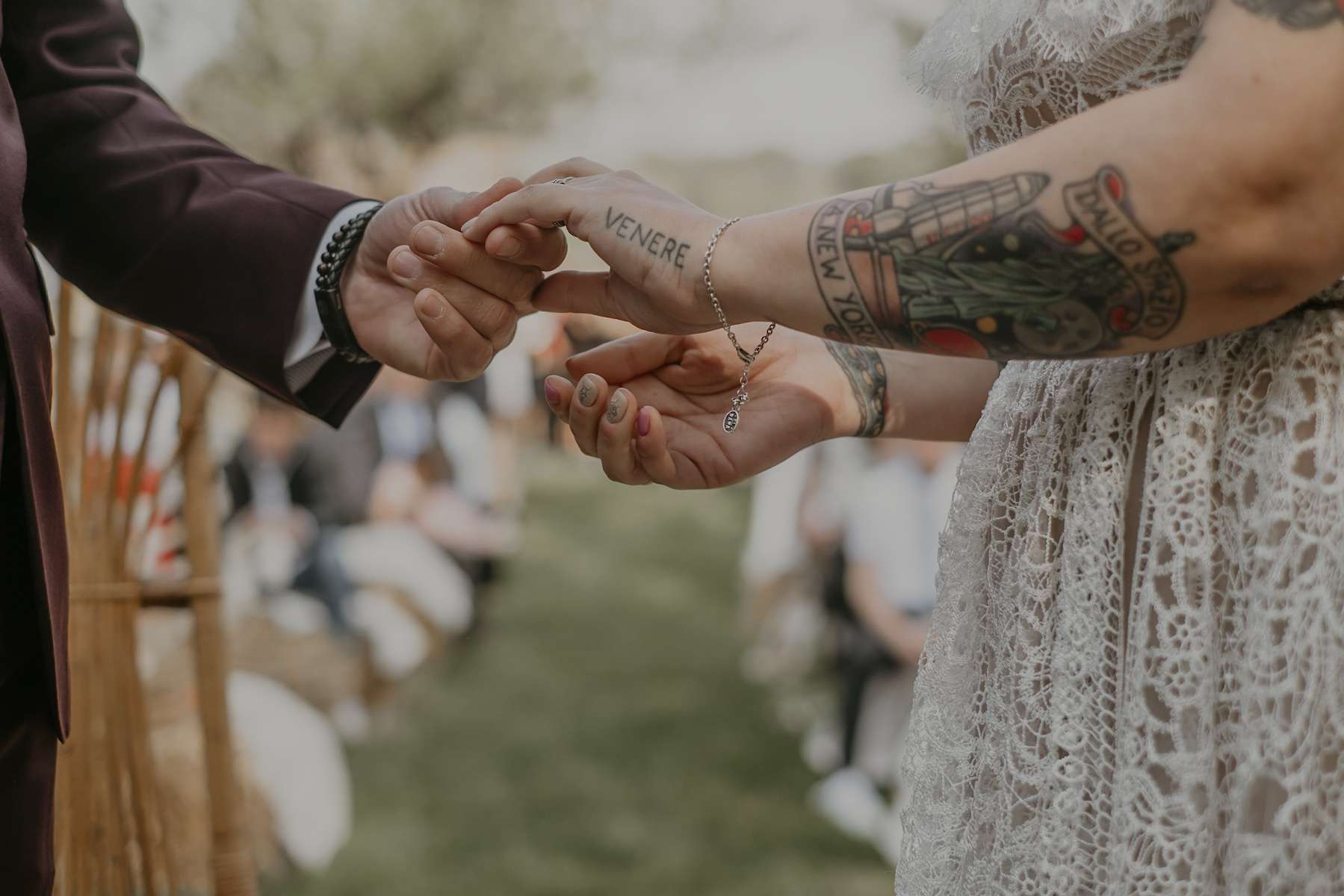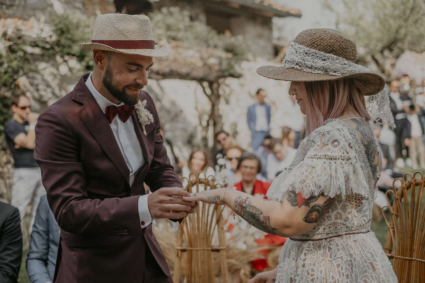 With a glorious day for an outdoor wedding, the couple married under the trees, with each choosing a different route for their vows. Caterina explained, “Ronny had written some very emotional vows which he read to me. However, I improvised, letting myself be carried away by emotions.” They chose their favourite music for each element of their ceremony, with a saxophone version of L’amour Toujours by Gigi D’Agostino for the entrance of the bride, and Sweet Child O’ Mine by Guns and Roses for the ring exchange.