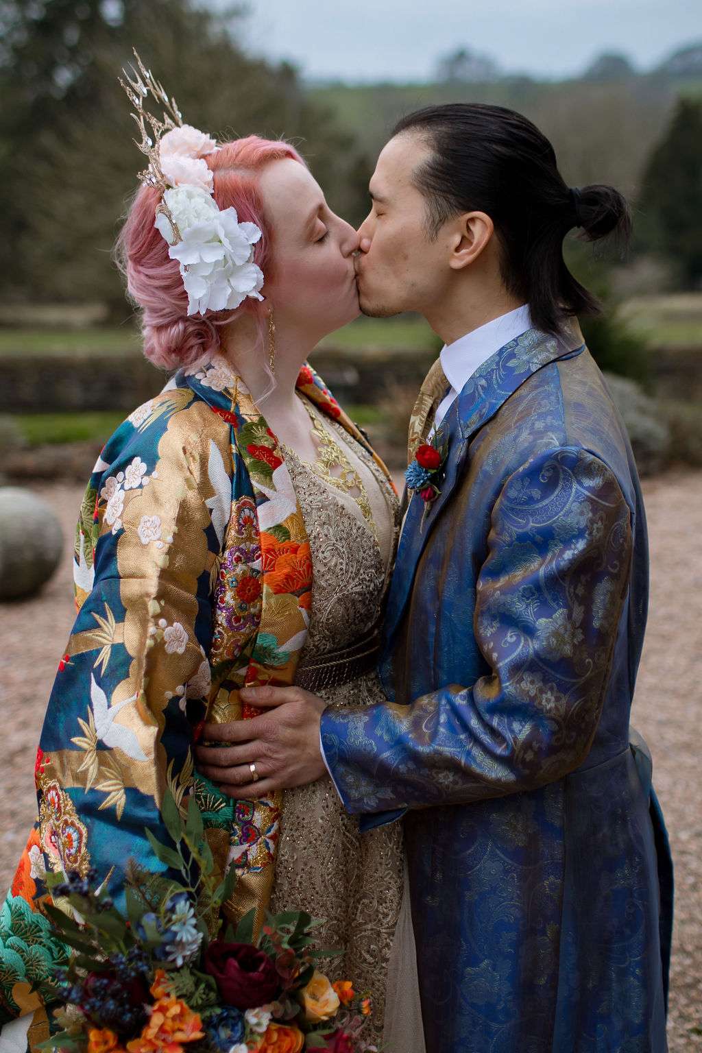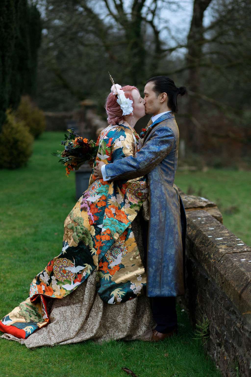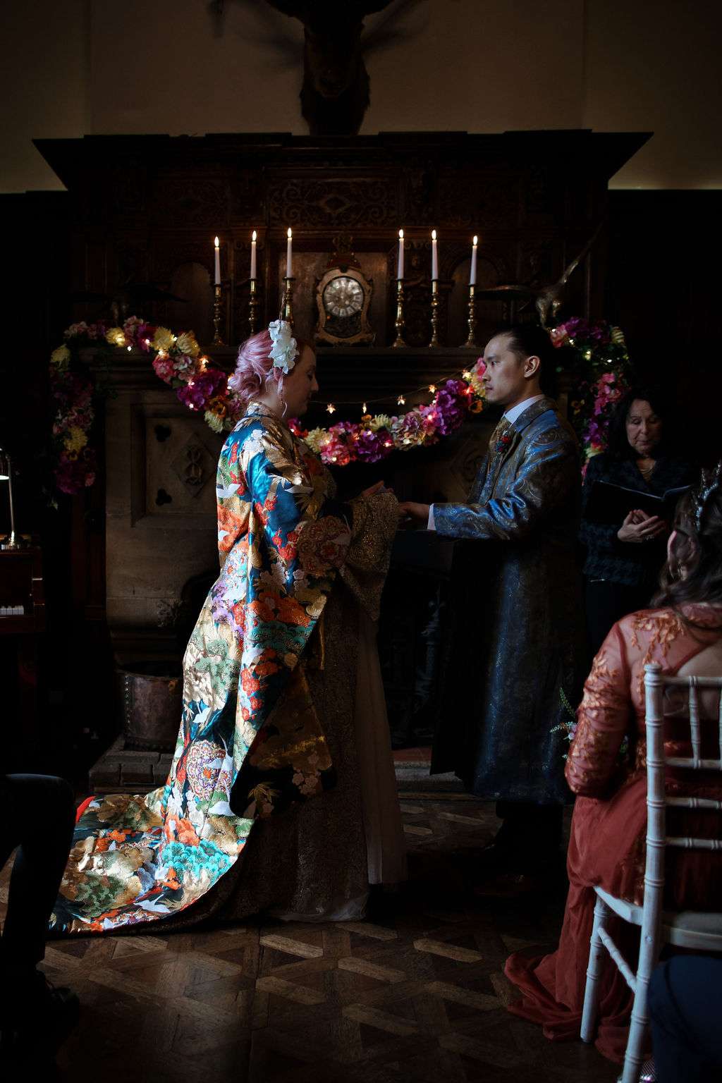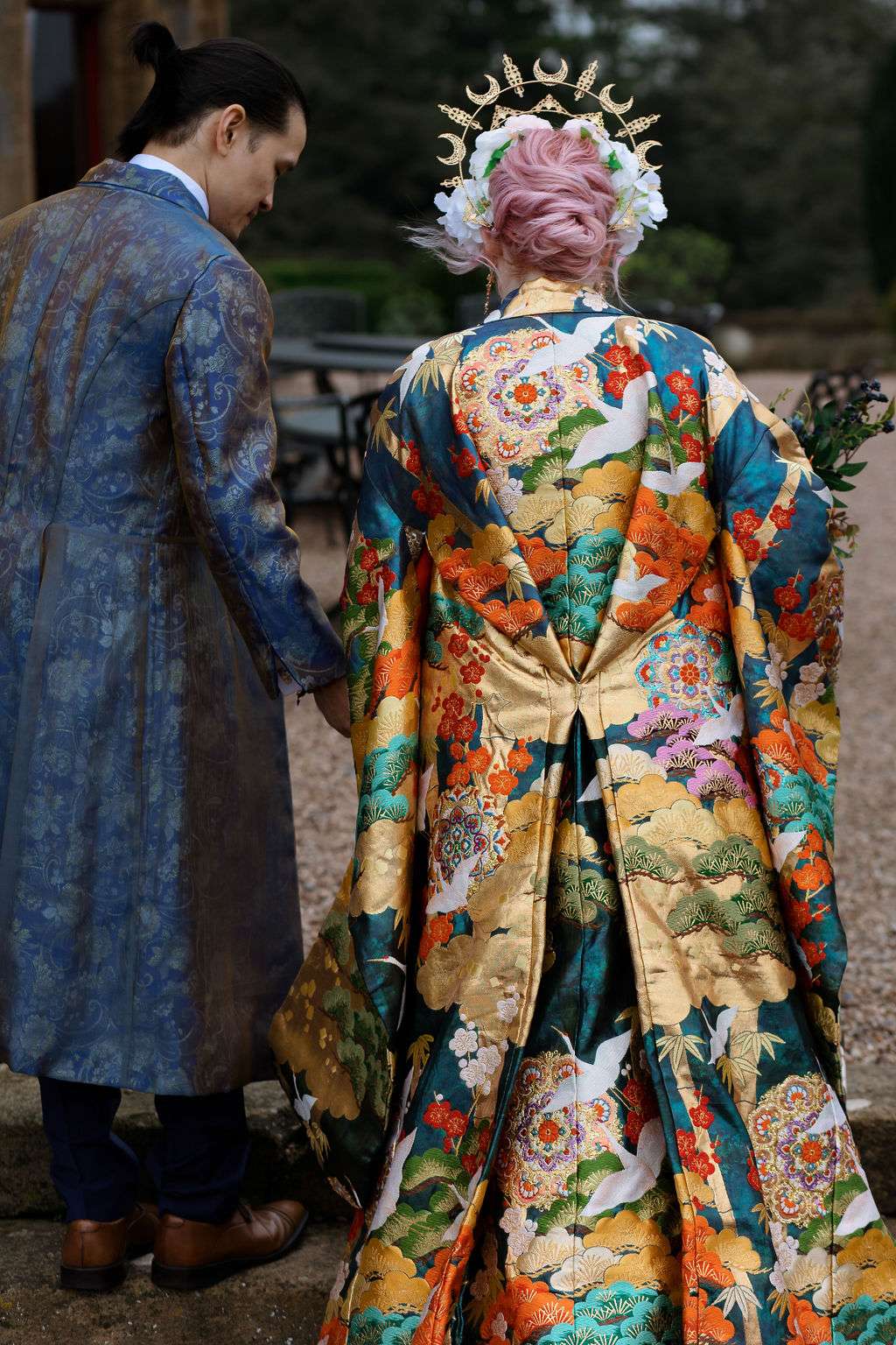 Choosing bright colours helped offset the gloomy winter weather and made for some beautiful photographs. The dress code for guests was ‘fabulous’ which indulged many of their guests who brought their colour and flair to the January weekend! The bride wore a nude Teuta Matoshi dress, off-set with a brightly coloured Japanese Uchikake wedding kimono.